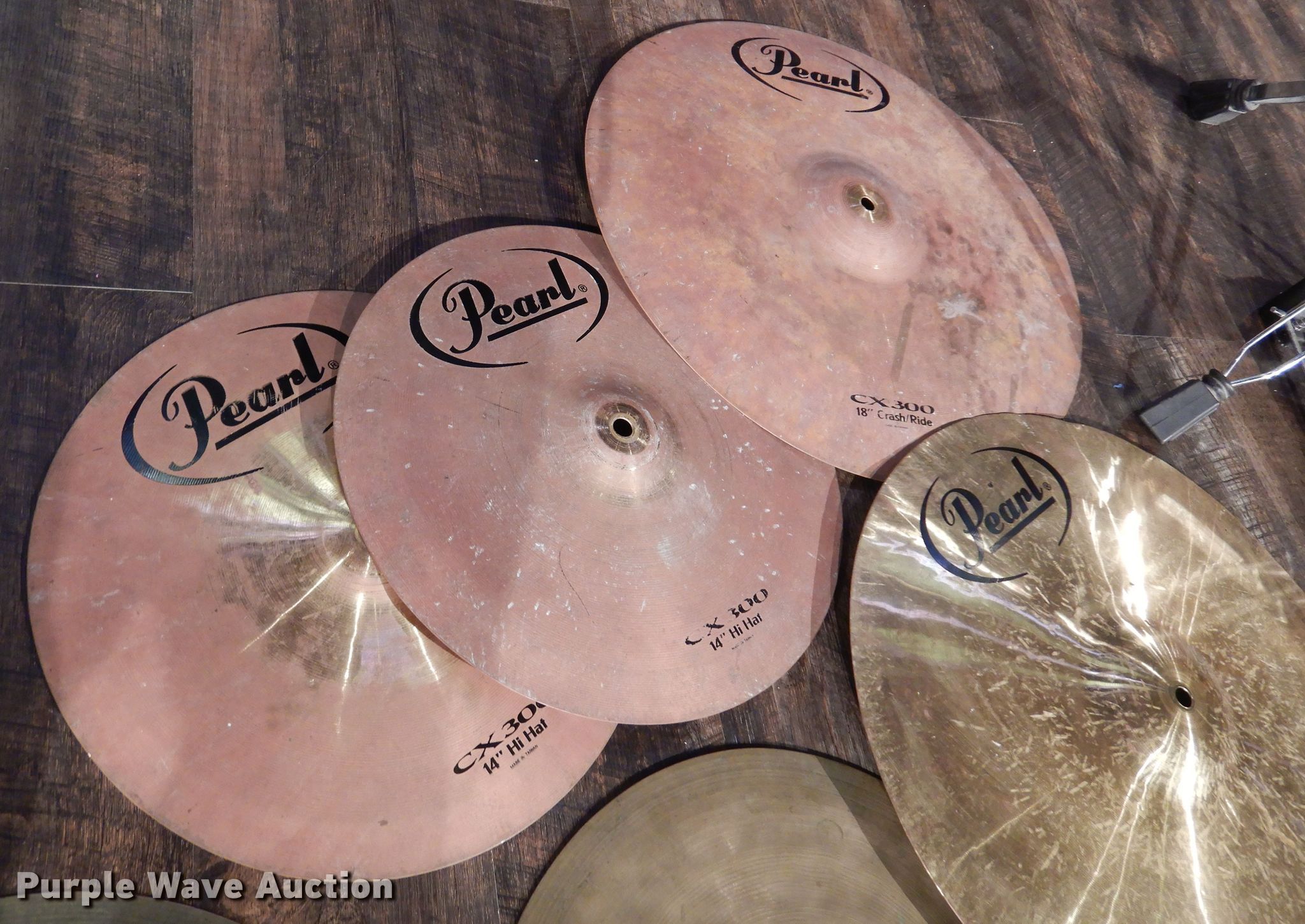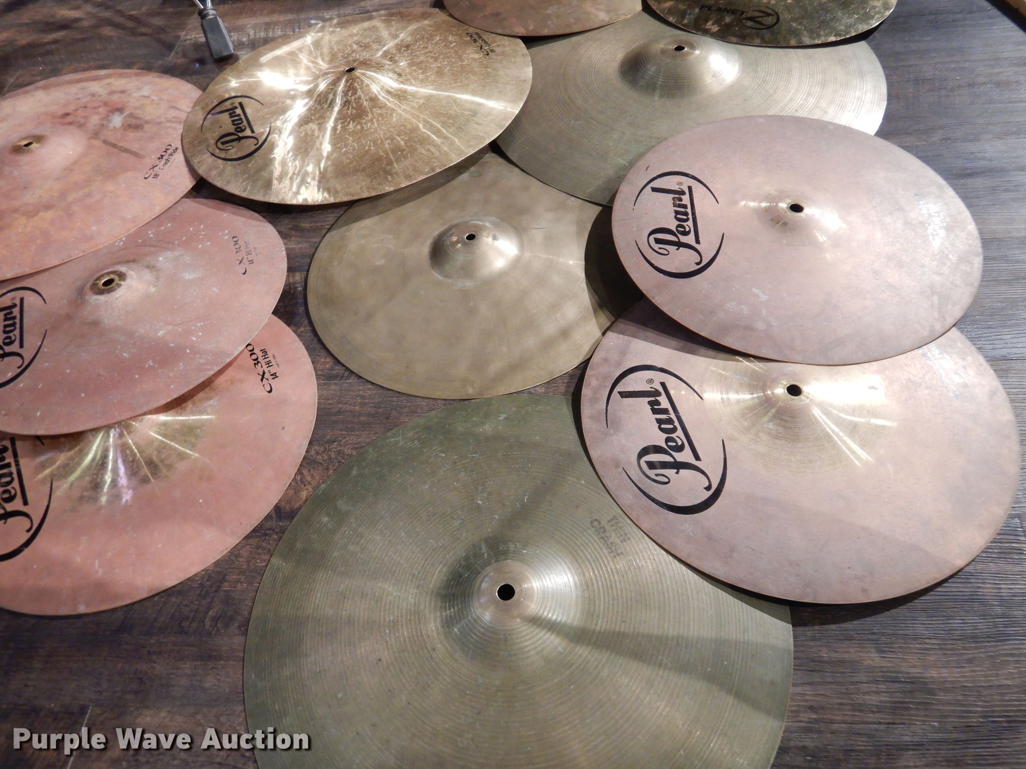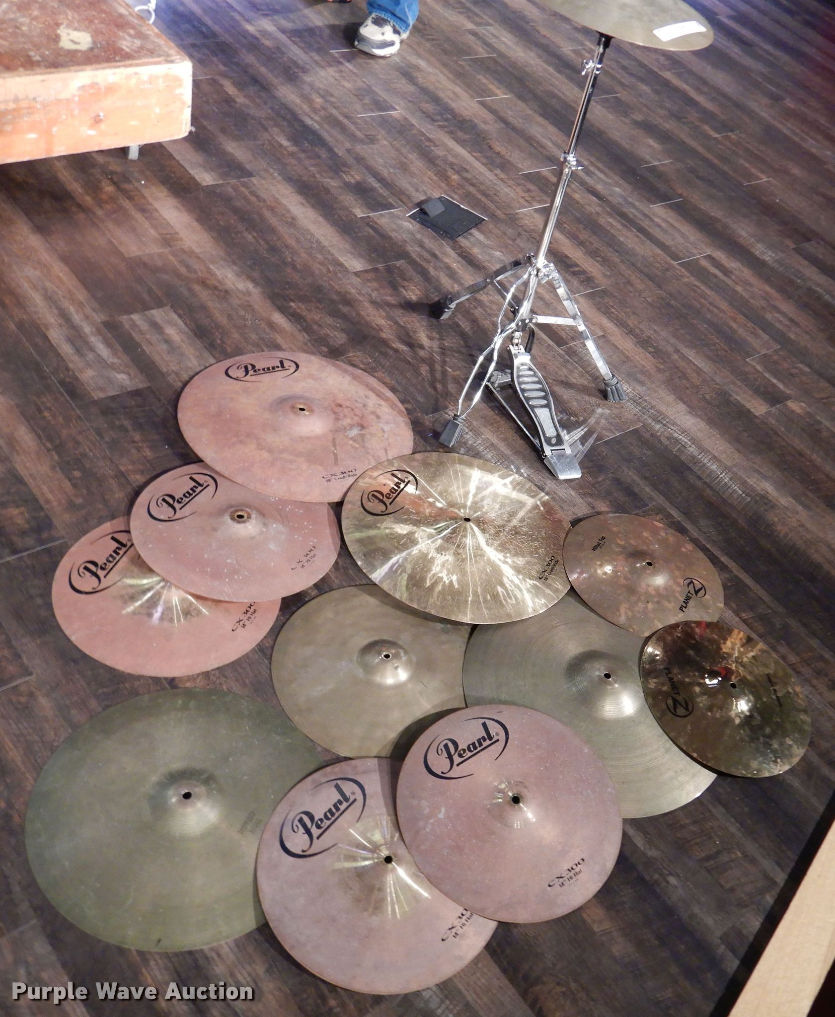 Purple Wave is selling a used Music Equip. in Kansas. This item is a Cymbals with the following: (3) sets of hi-hats, (2) Pearl CX300, Planet Z, (3) crash cymbals, 14", 16", 18", (2) 18" Pearl CX300 crash/ride, 14" hi-hat, Stand