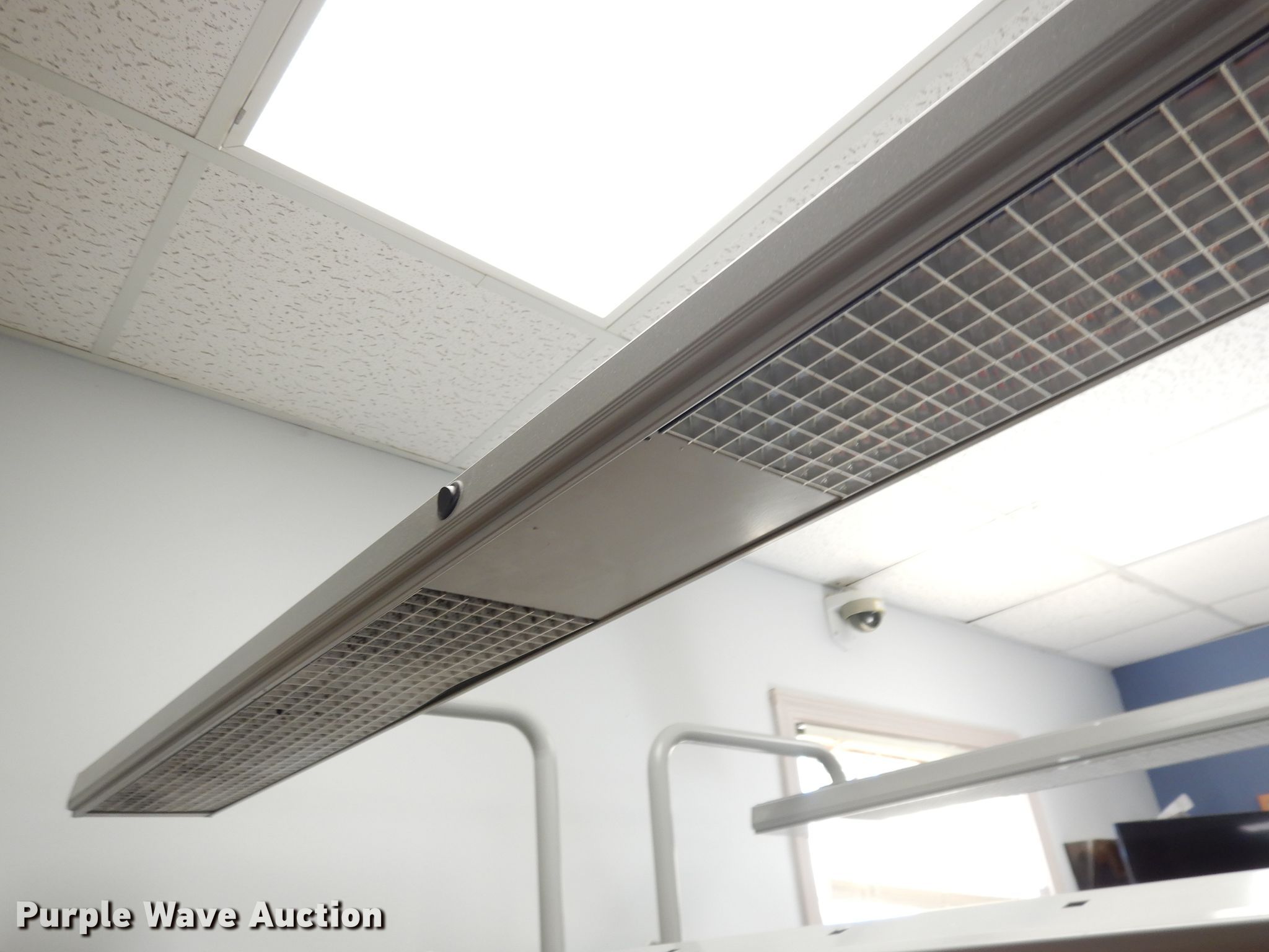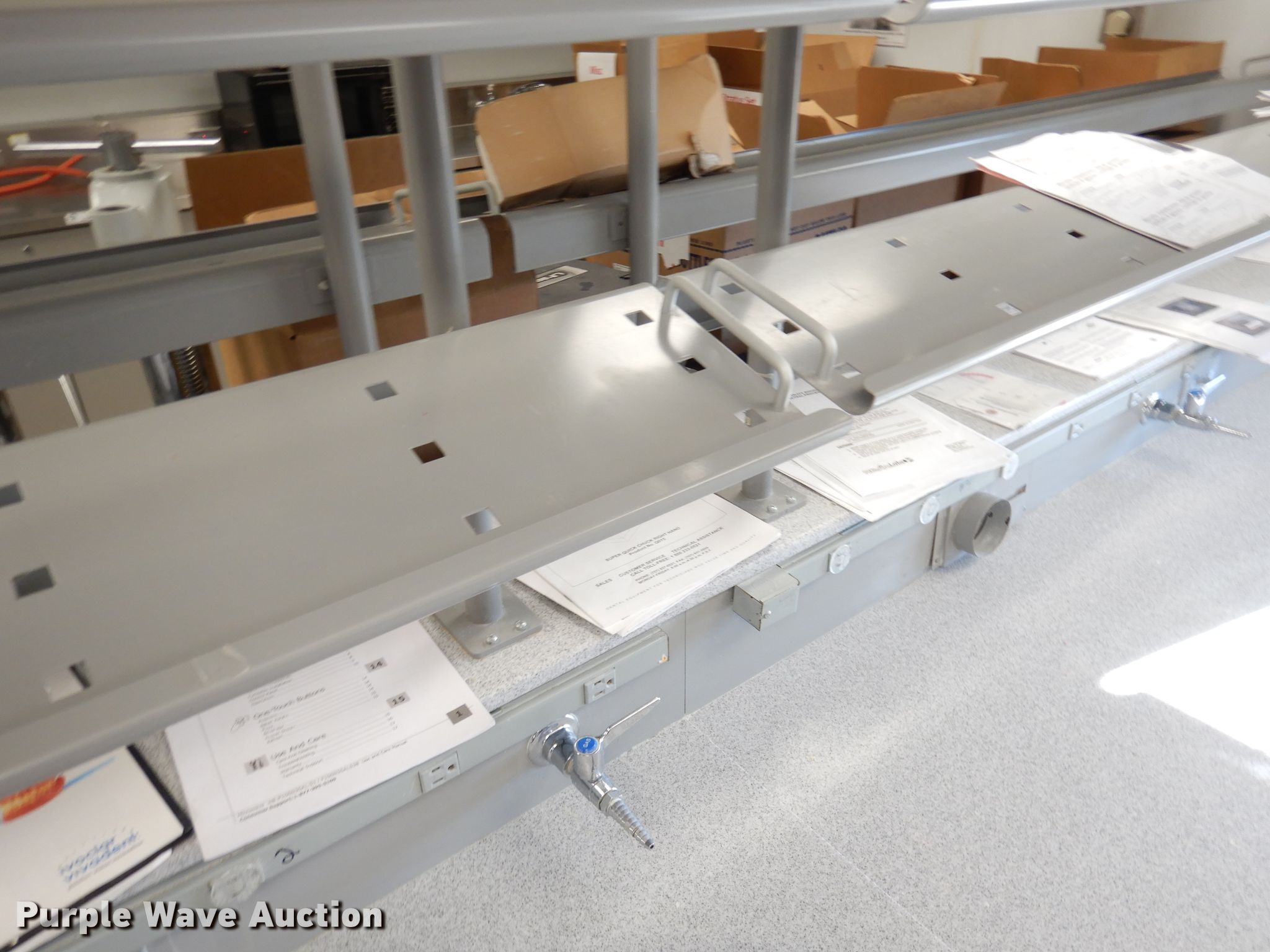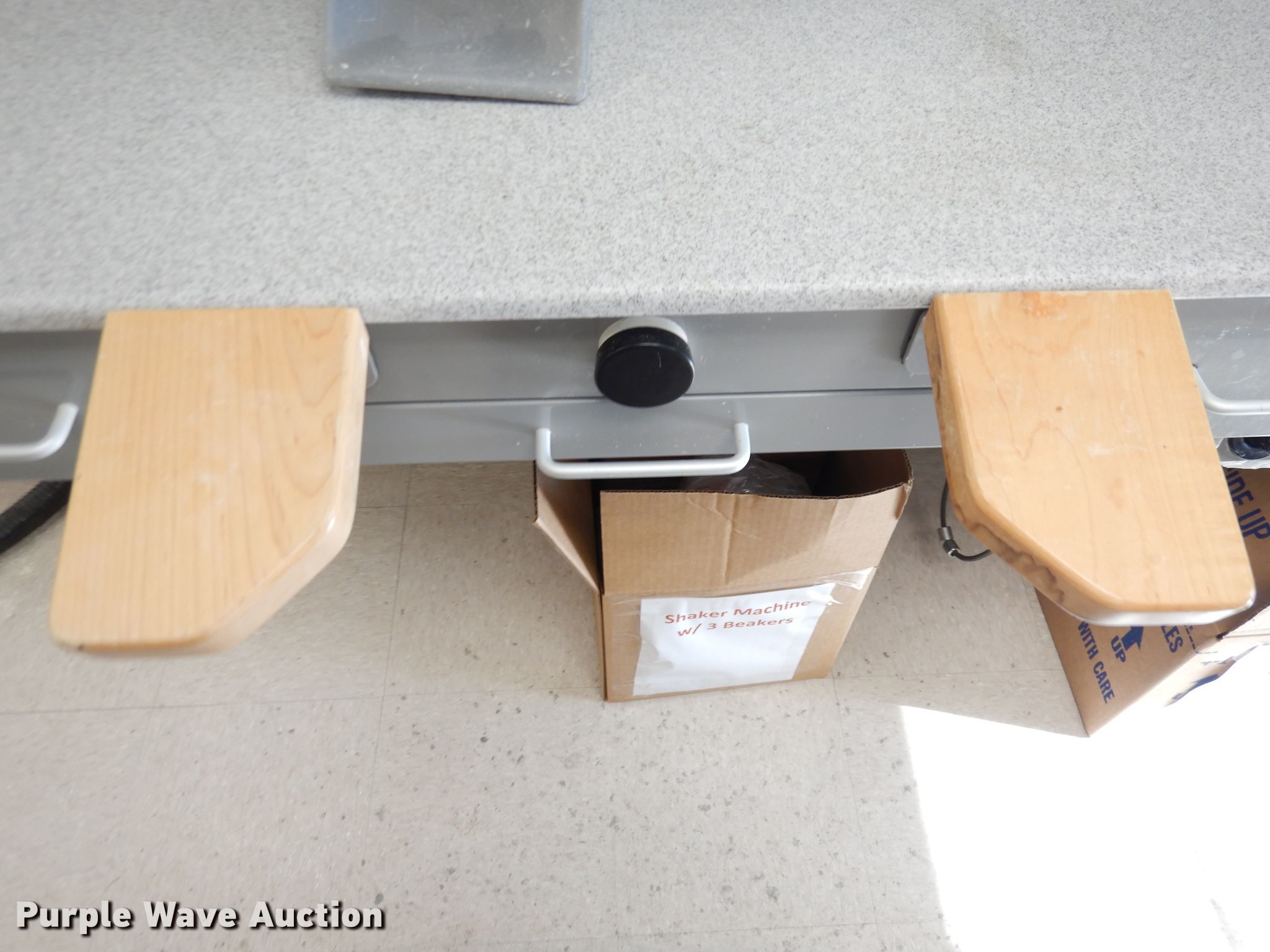 Purple Wave is selling a used Medical Equip. in Kansas. This item is a Dental work station with the following: 14'7"L x 56"W x 75"H, Eight work stations, Double sided, Air outlets, Electrical outlets, Lights, (2) chairs, 6'H power pole, Shelving, Wood arm rests, Vacuum outlets