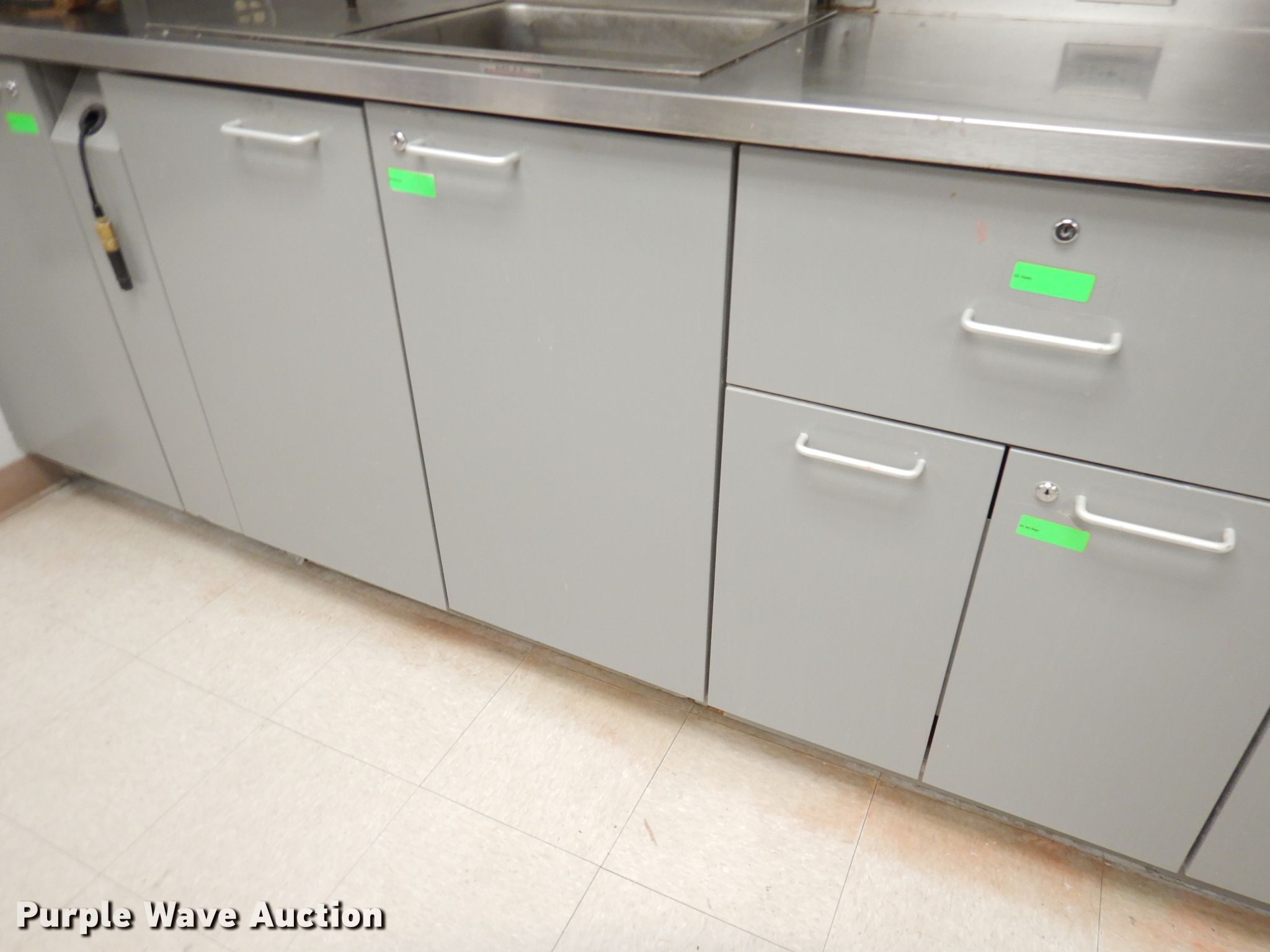 Purple Wave is selling a used Medical Equip. in Kansas. This item is a Dental work cabinet with the following: 9'8"L x 31"W x 43"H, Gas boiler, Slide-out trash can, Outlets, Air outlets, Blueprints