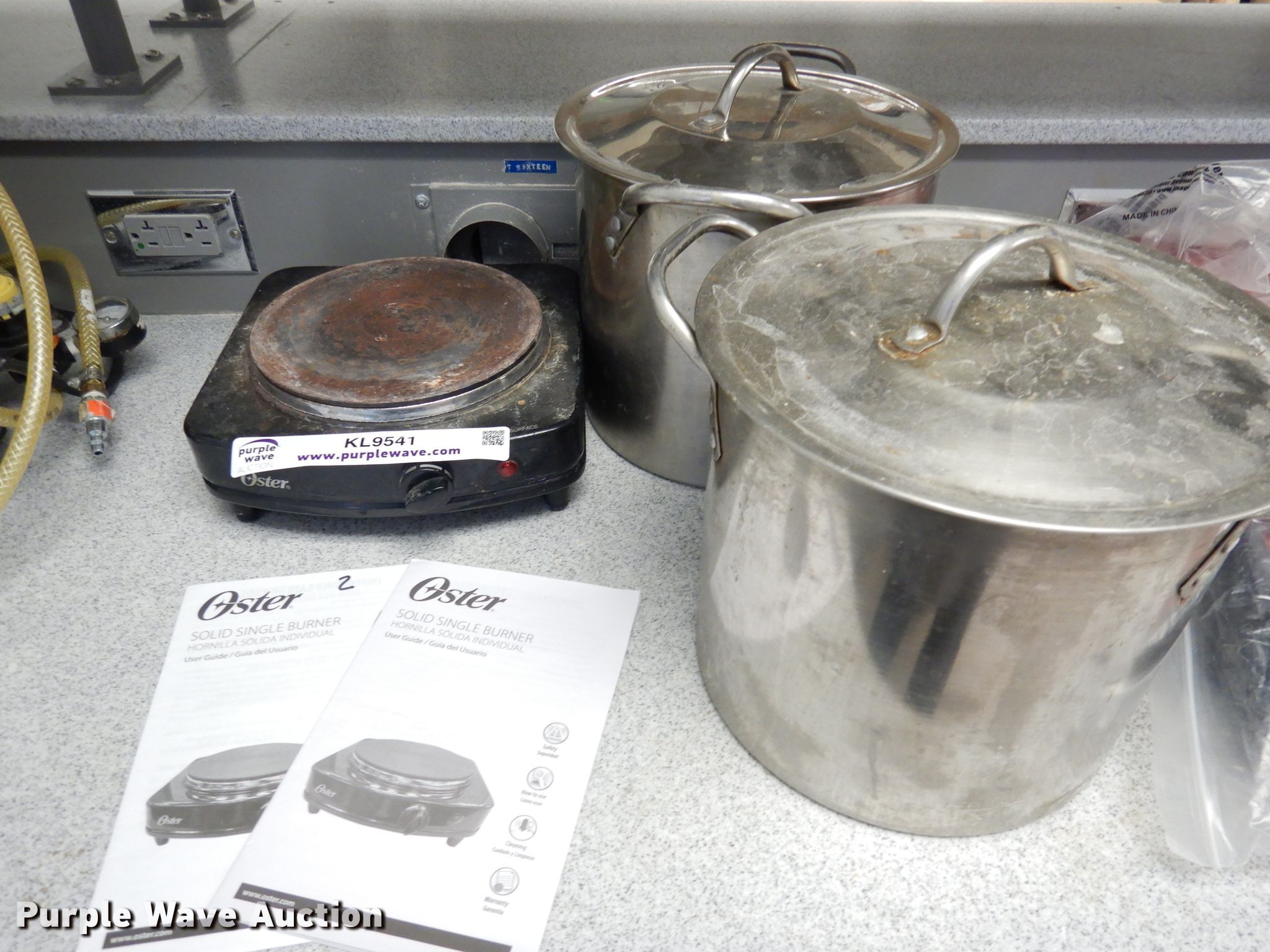 Restaurant equipment. (2) Oster solid single burners, (2) stainless steel pots. All aspects of disassembly and removal are the sole responsibility of the purchaser. Kansas Correctional Industries. Lansing, KS 66043