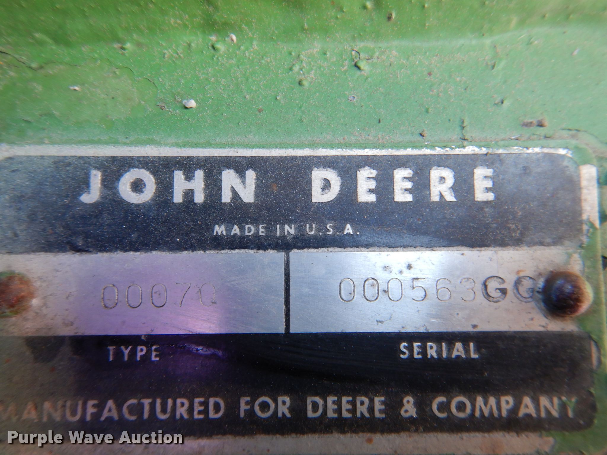 John Deere 70 skid steer loader. Hours: 986 on meter, Serial: 000563. Engine Onan, Cylinders: 2, Fuel type: Gas. Transmission Hydrostatic. Operators station Bucket control: Foot. Operational Quick coupler: Manual, Bucket Width: 47". Tires Size: 27x8.50-15. Tonganoxie, KS 66086