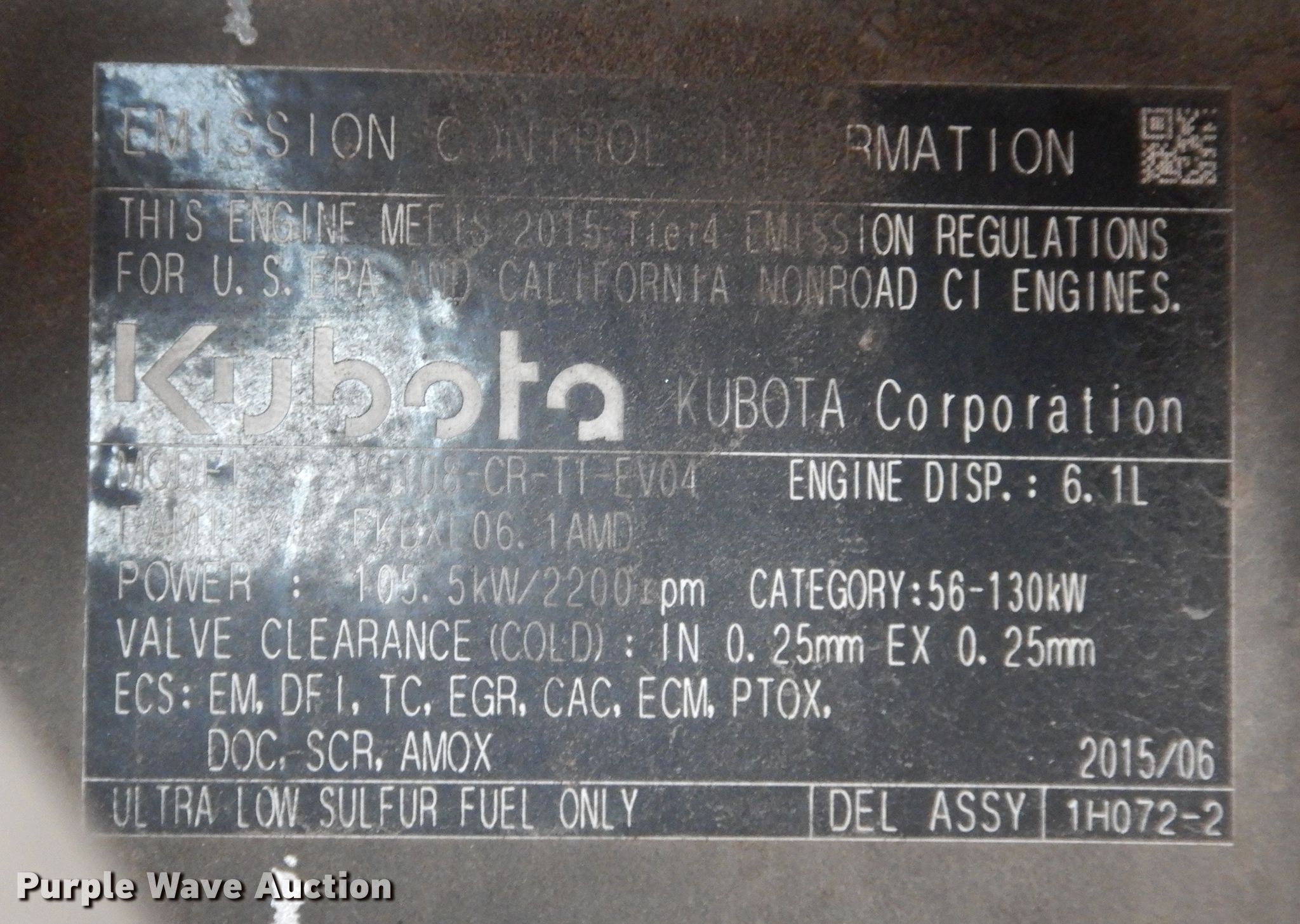 2015 Kubota M6-141 MFWD tractor. Hours: 2,174 on meter, Serial: 10110. Engine Kubota, Displacement: 6.1L, Cylinders: 4, Fuel type: Diesel. Transmission Powershift, 24F - 24R, Differential lock. Operators station AC, Heat, Display Kubota. Operational PTO: 1000, Hydraulic remote sets Rear: 2, Loader Kubota LA225, Controls: Joystick. Tires Front: 420/70R24, Rear: 520/70R38. Notes Turns over, but will not start, Non-operational unit. No manufacturer's warranty included. Kubota - WC Tractor. 1960 N Earl Rudder Fwy. Bryan, TX 77808