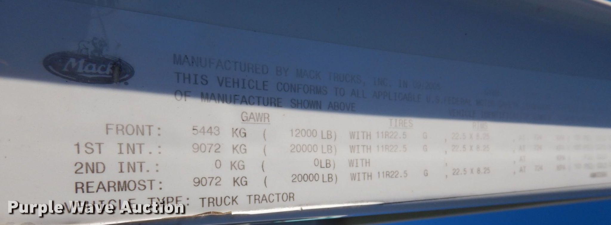Purple Wave is selling a used Truck Tractor in Kansas. This item is a 2006 Mack CXN613 semi truck with the following: Miles: 468,512 on odometer, VIN: 1M1AK06Y56N013155