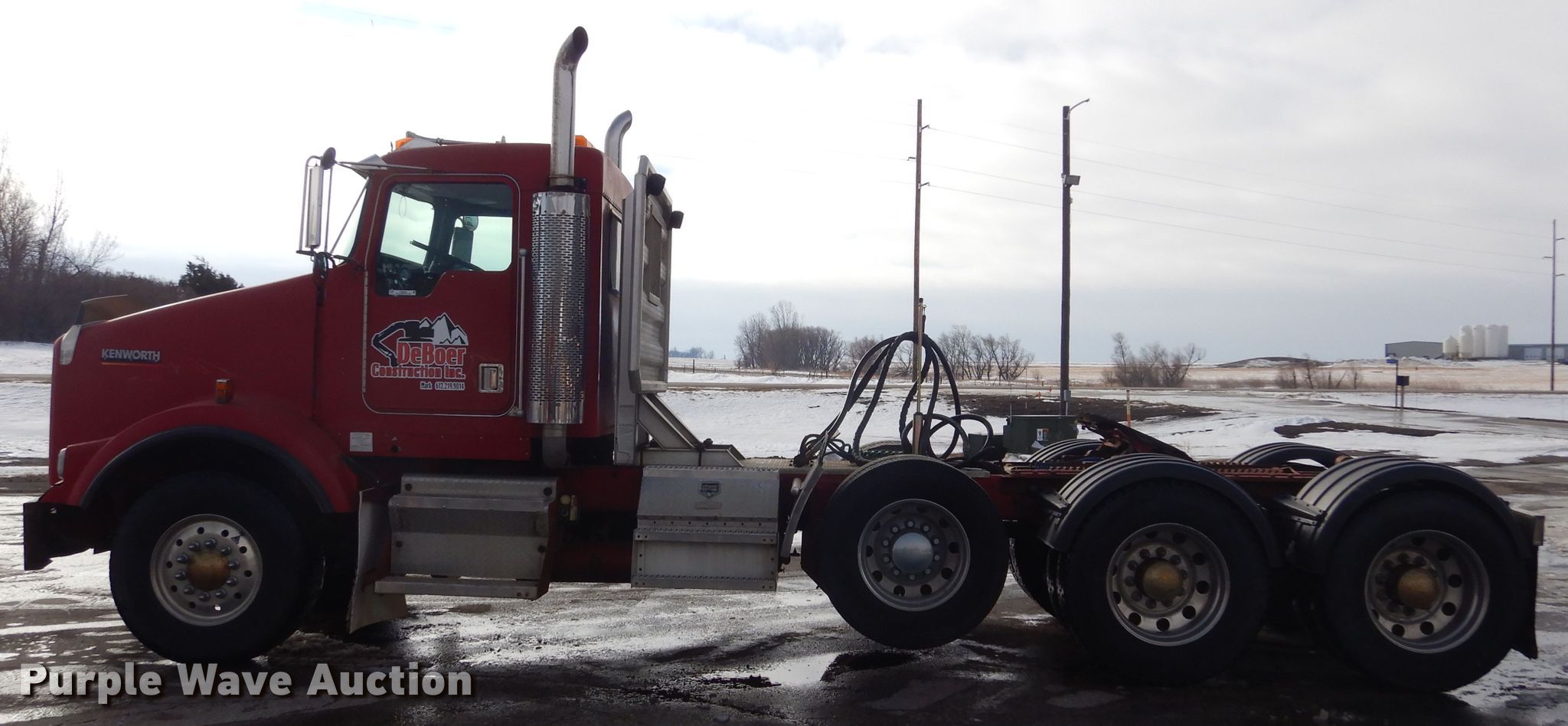 1999 Kenworth T800 semi truck. Miles: 120,651 on odometer, VIN: 1XKDD69X8XJ793632. Engine Cummins N14, Displacement: 14.0L, Cylinders: 6, Fuel type: Diesel, Engine brake. Transmission Eaton Fuller, Manual, Speed: 18. Chassis Axles: Triple, Pusher axle, Differential lock: Inter-axle, Suspension: Air Dump valves, Brakes: Air, PTO, Truck chassis: 17' 2", GVWR: 48,000 lbs FAWR: 12,000 lbs, IAWR: 18,000 lbs, RAWR: 18,000 lbs. Interior AC, Heat, Heated mirrors. Operational Deck plate: Aluminum, Fifth wheel type: Air operated, Sliding, Fuel tank: Single. Tires Front: 385/65R22.5, Rear: 11R24.5, Lift axle: 295/75R22.5. South Dakota title. DeBoer Construction Inc. 47492 SD-22. Clear Lake, SD 57226