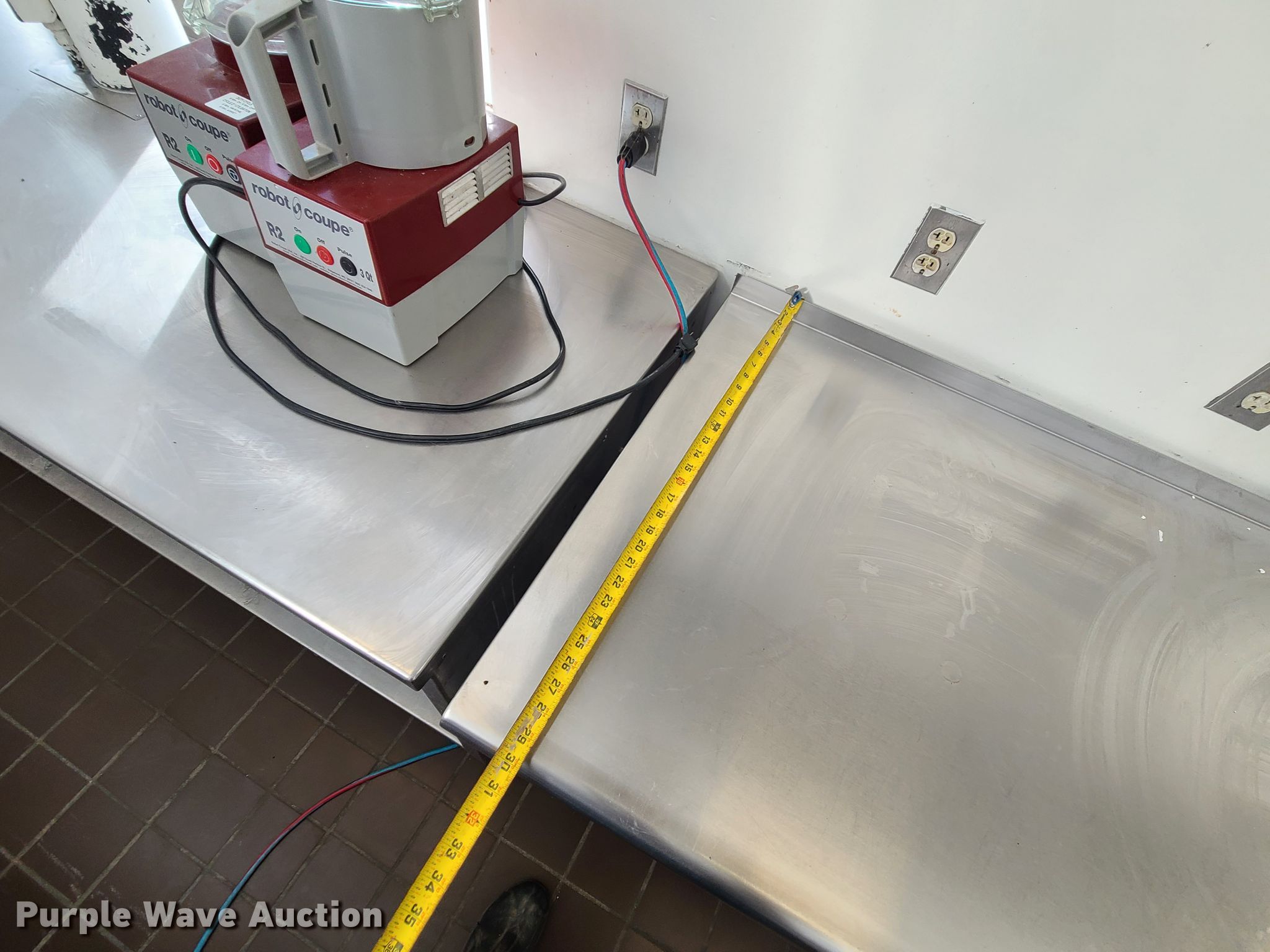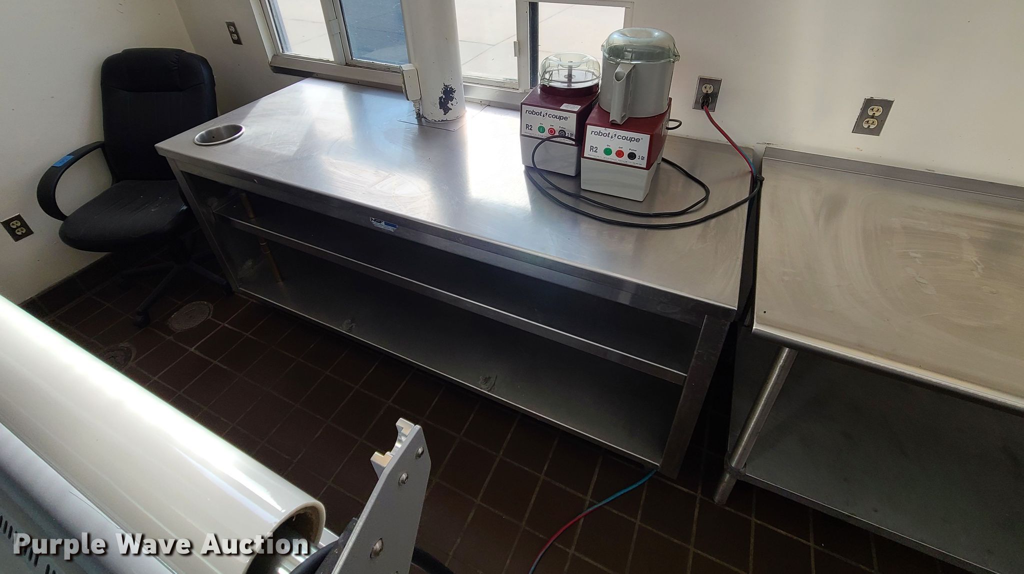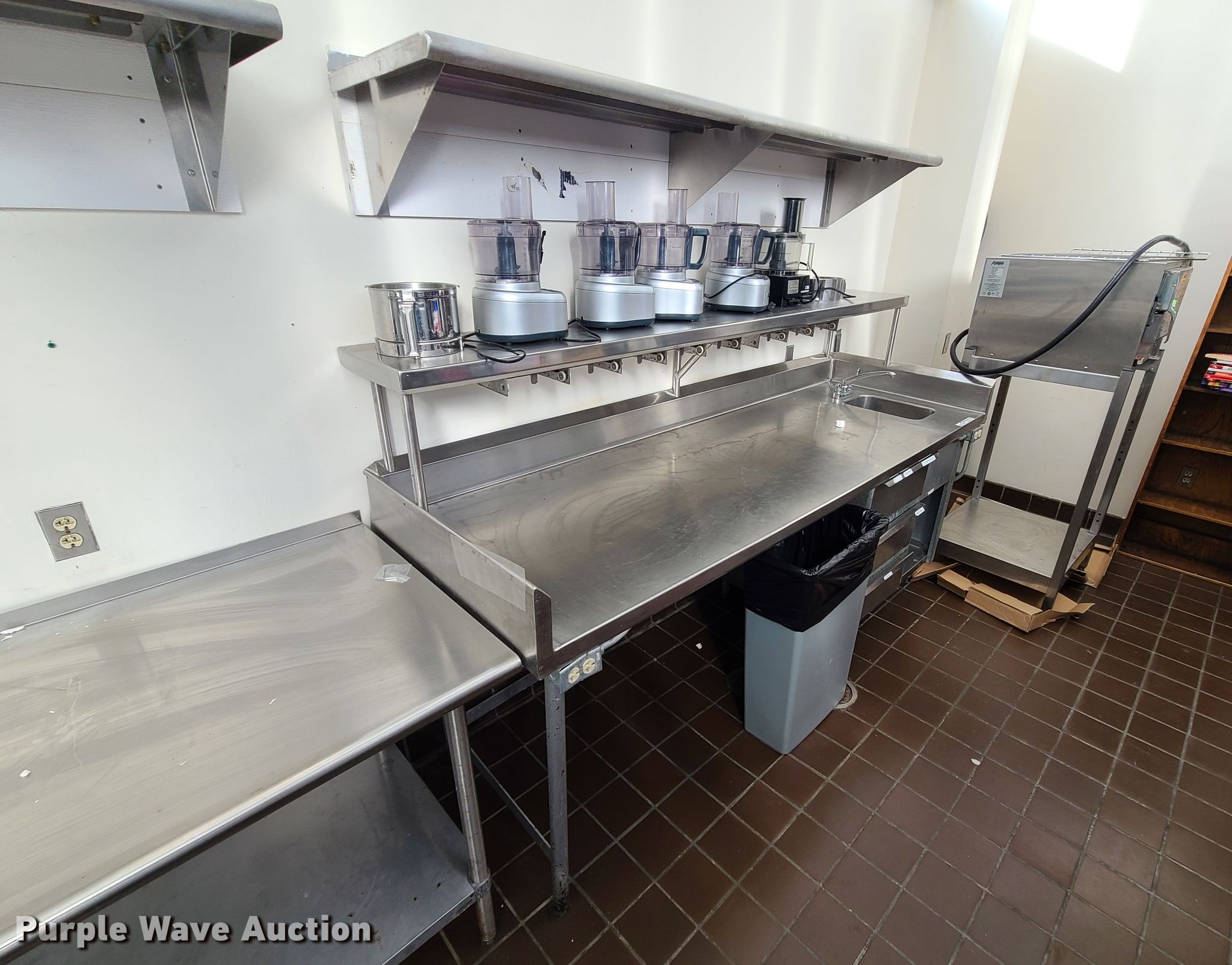 Purple Wave is selling a used Restaurant Equip. in Missouri. This item is a Restaurant equipment with the following: (2) 30" x 6' stainless steel tables, 33" x 8' table with sink, Food processors, AccuTemp steamer, 208V
