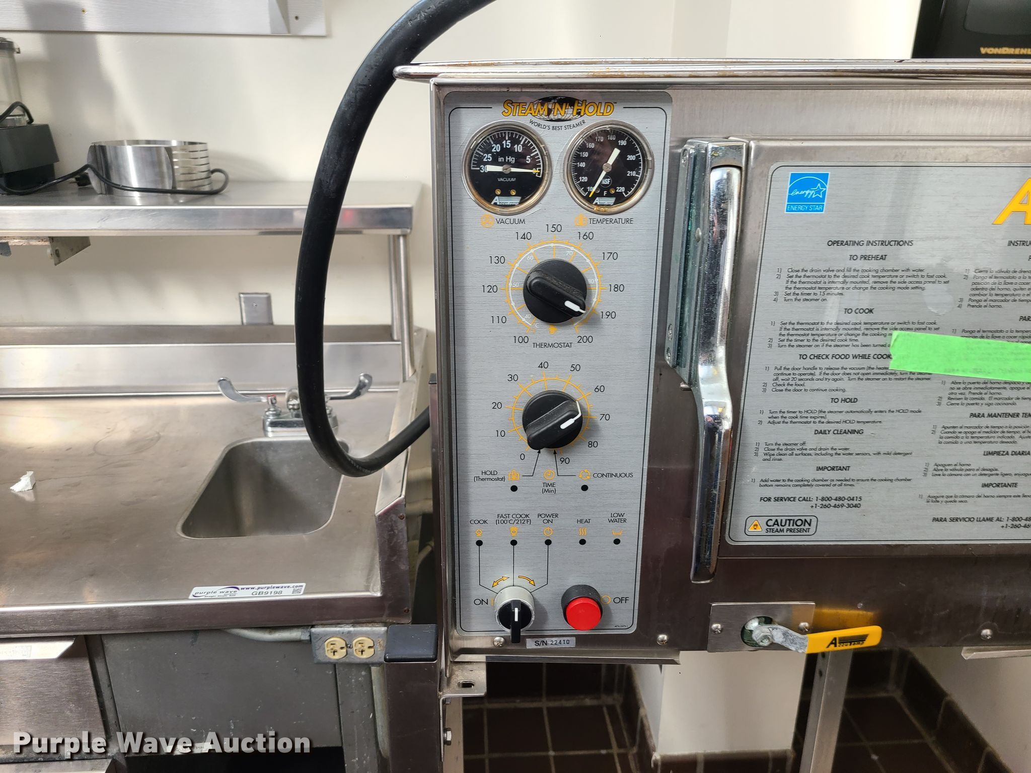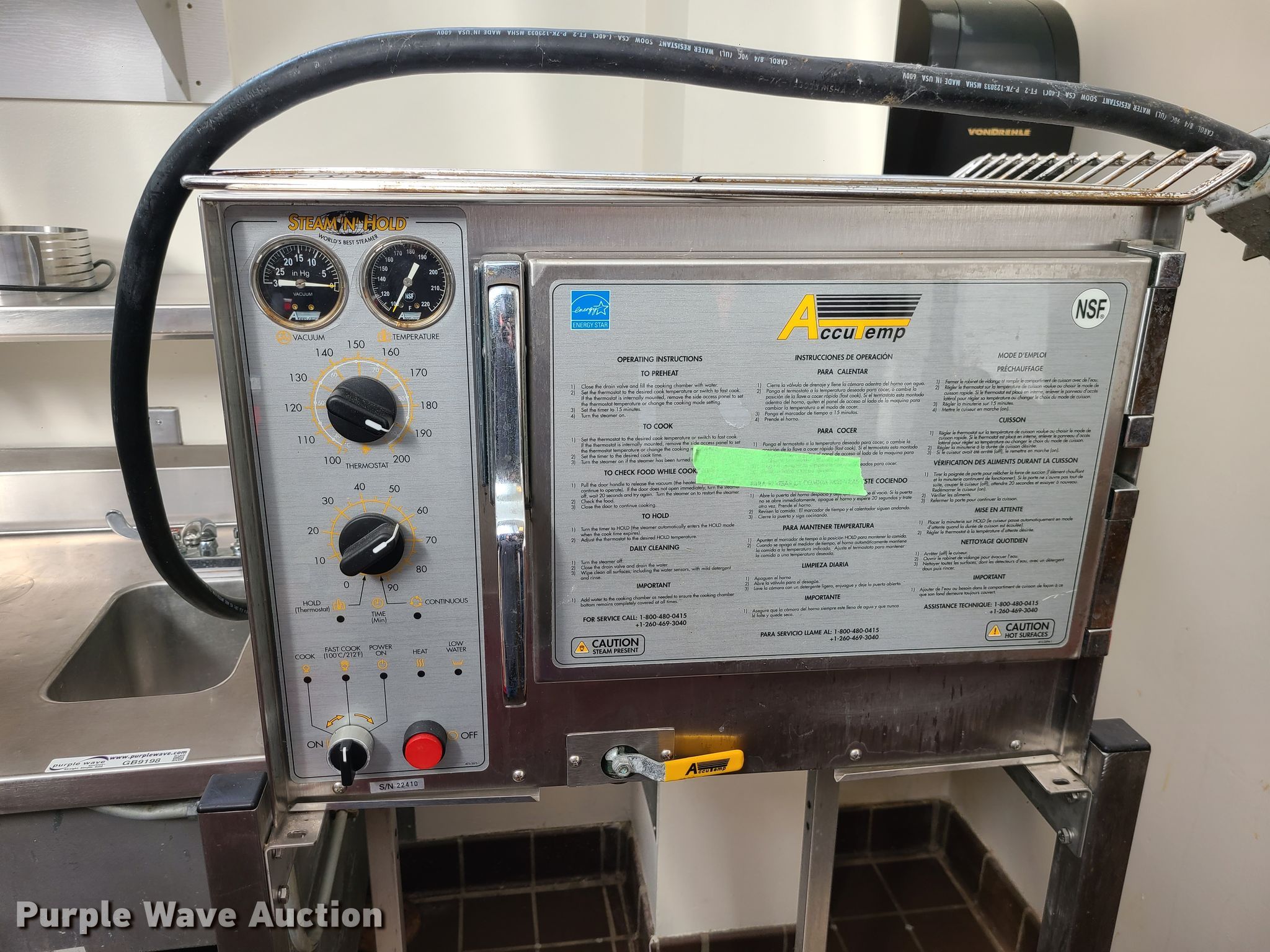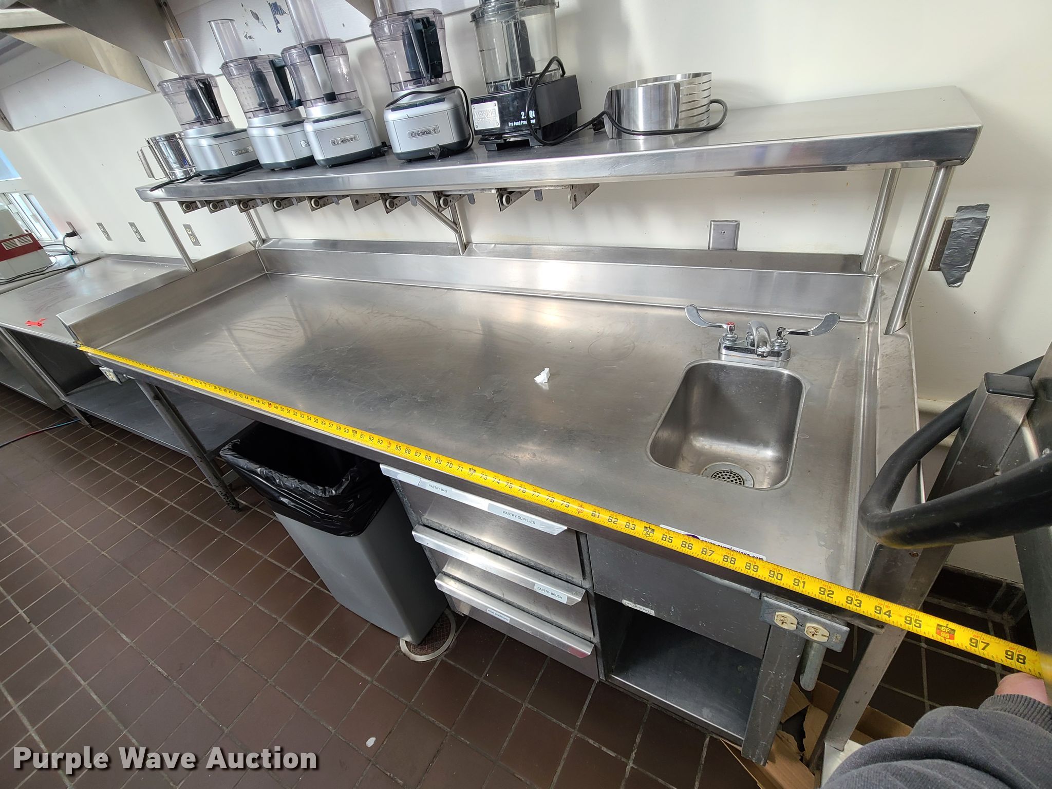 Purple Wave is selling a used Restaurant Equip. in Missouri. This item is a Restaurant equipment with the following: (2) 30" x 6' stainless steel tables, 33" x 8' table with sink, Food processors, AccuTemp steamer, 208V