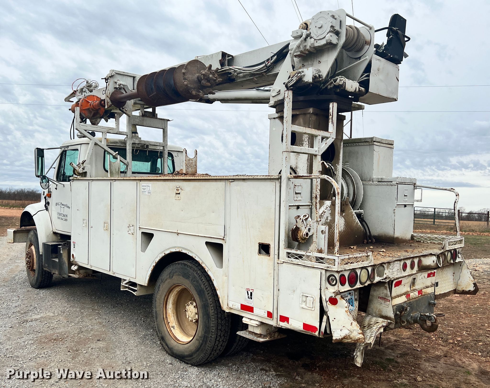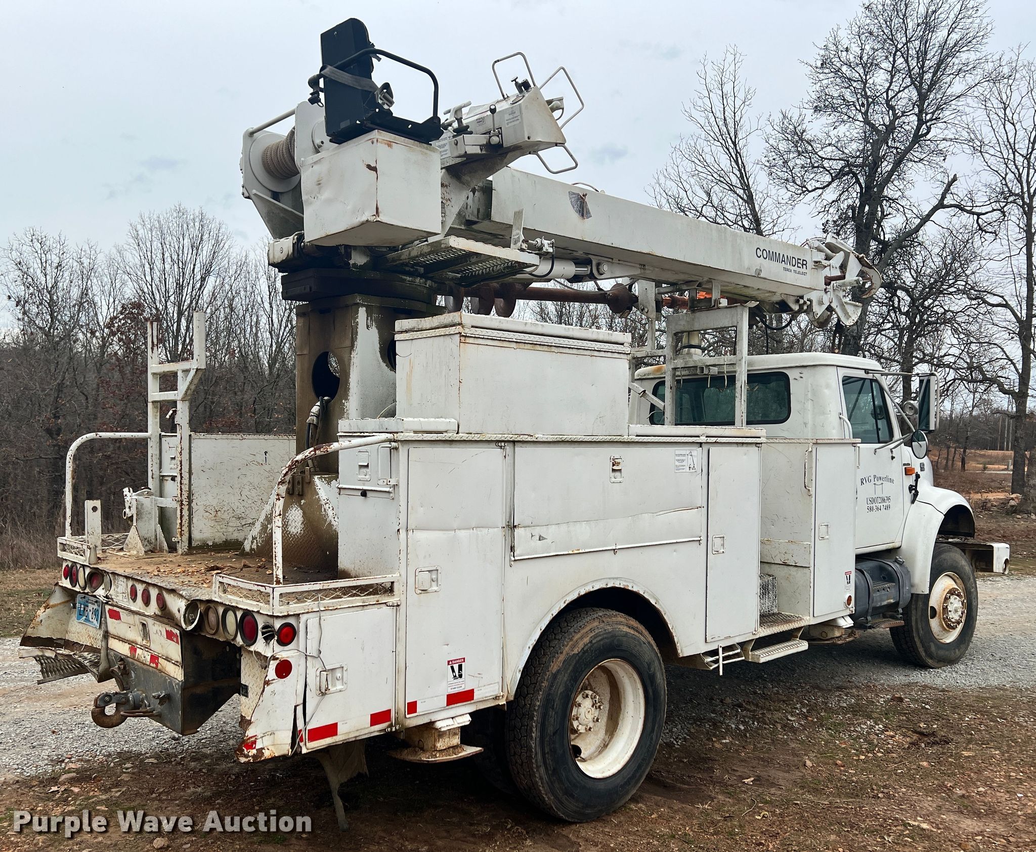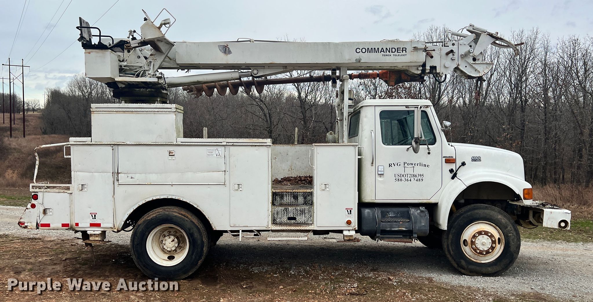 Purple Wave is selling a used Digger Derrick Truck in Oklahoma. This item is a 2002 International 4800 digger derrick truck with the following: Miles: 126,662 on odometer, Hours: 13,639 on meter, VIN: 1HTSEAAR72H408726