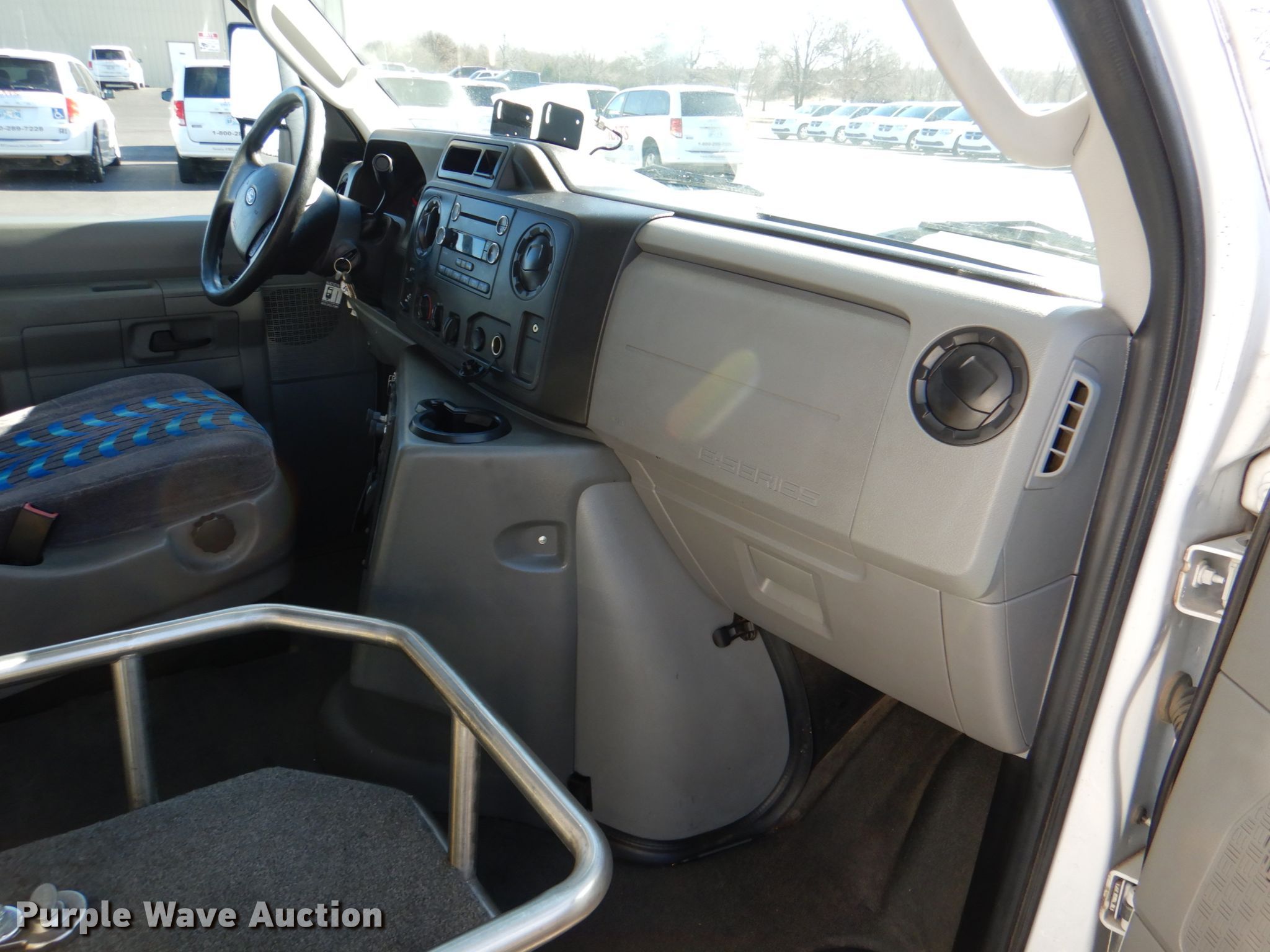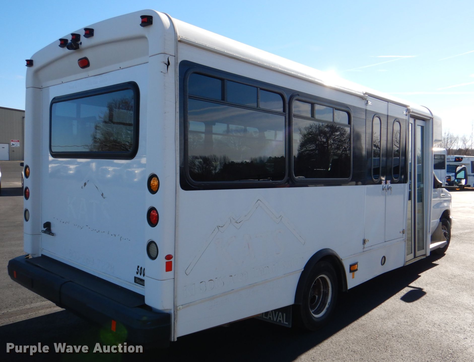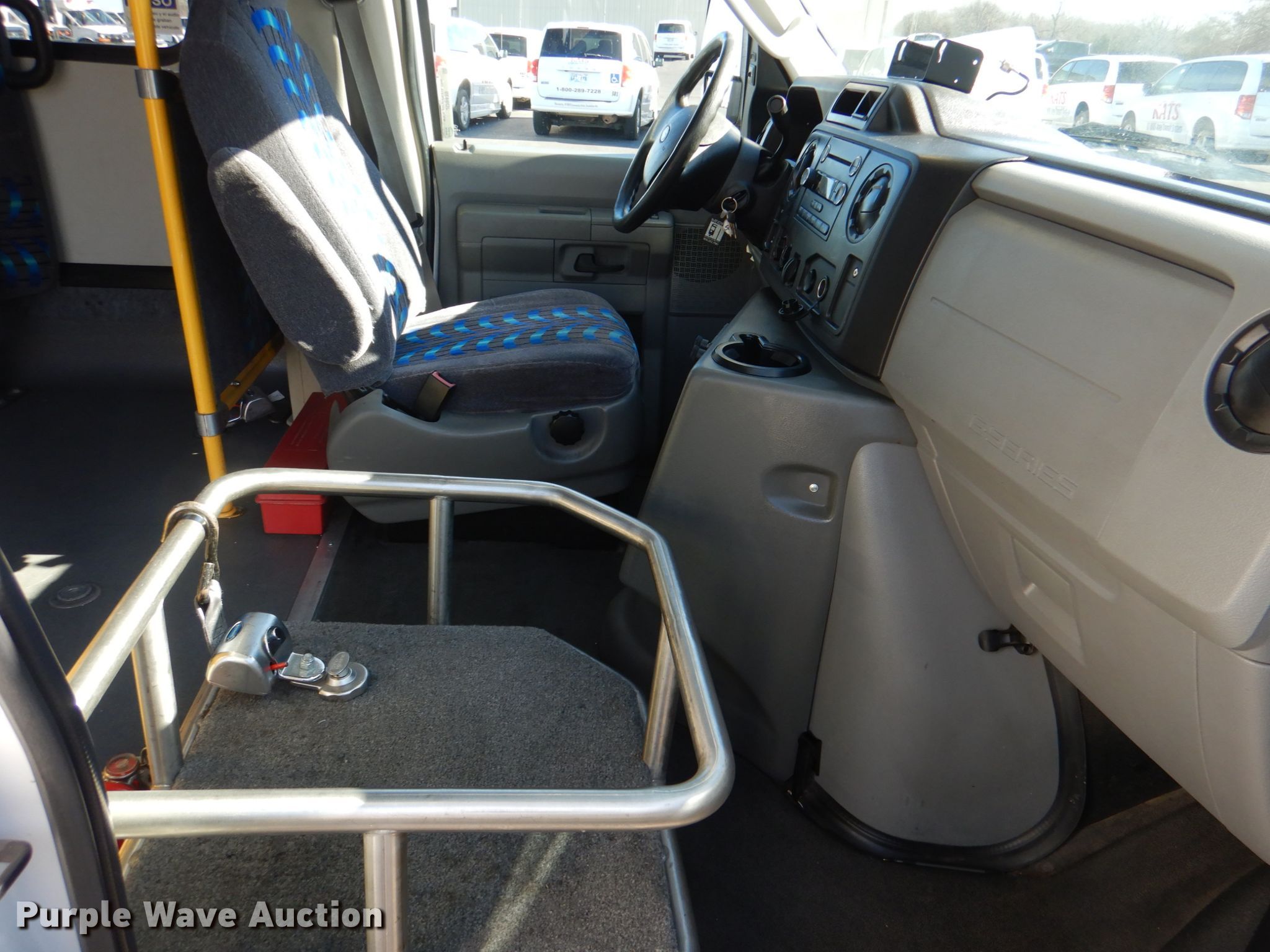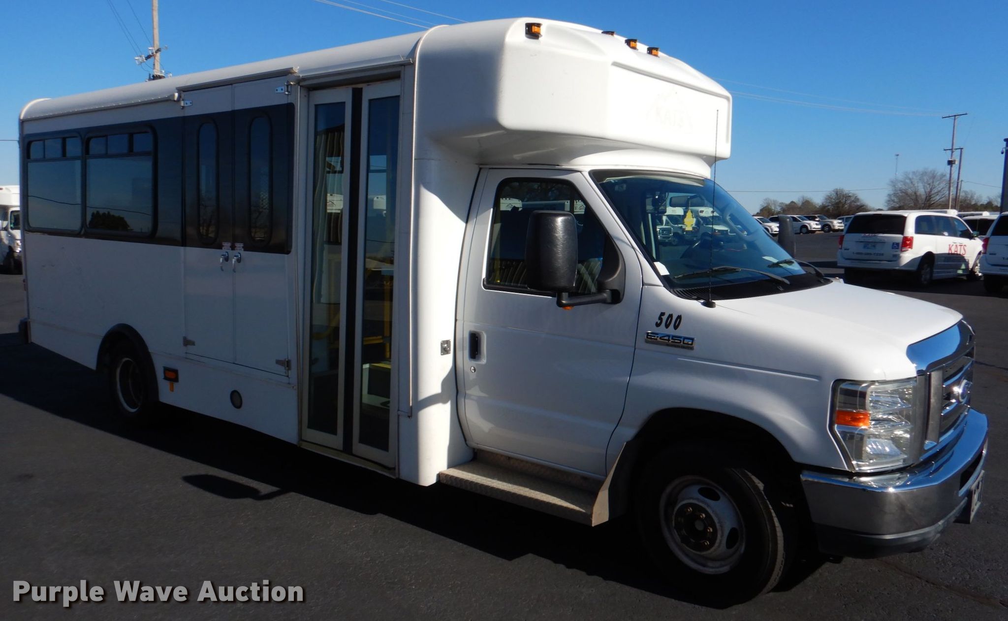 2014 Ford E450 shuttle bus. Miles: 136,138 on odometer, Hours: 9,117 on meter, VIN: 1FDXE4FS1EDB10258, Unit #: 500. Engine Displacement: 6.8L V10 SOHC 20V, Cylinders: 10, Fuel type: Gas. Transmission Automatic. Chassis Axles: Single, Suspension: Spring, Brakes: Hydraulic. Interior AC, Heat, Heated mirrors, Cruise control, Auxiliary controls, Electric passenger sliding door, Passengers: 14, Seats, Wheelchair lift. Tires Size: 225/75R16. Notes Possible engine issues, uses coolant. Oklahoma title. Kibois Area Transit. 1107 Industrial Rd. Stigler, OK 74462