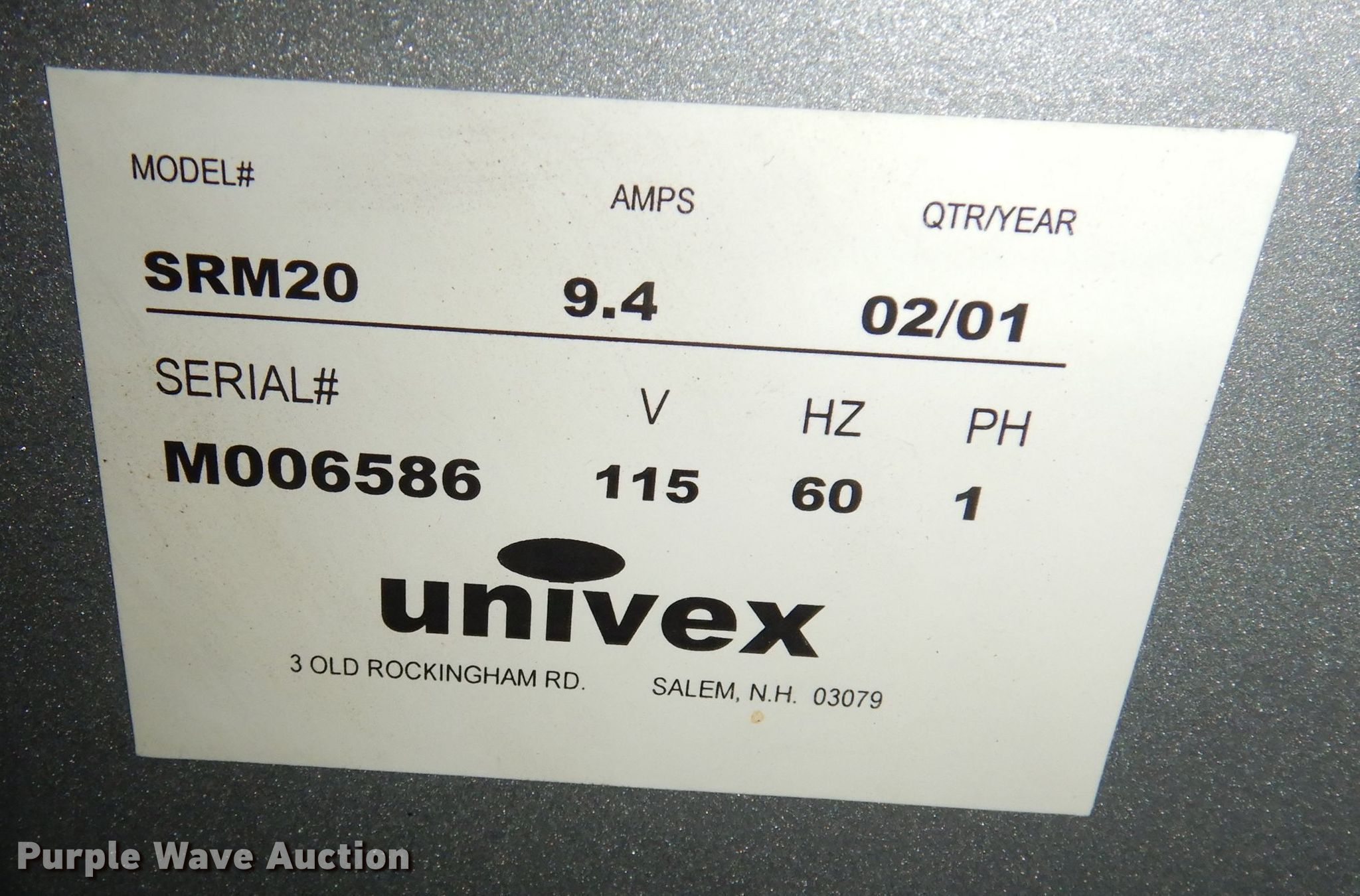 Purple Wave is selling a used Restaurant Equip. in Kansas. This item is a Univex SRM20 mixer with the following: Serial: M006586, Guard, Bowl, Attachments