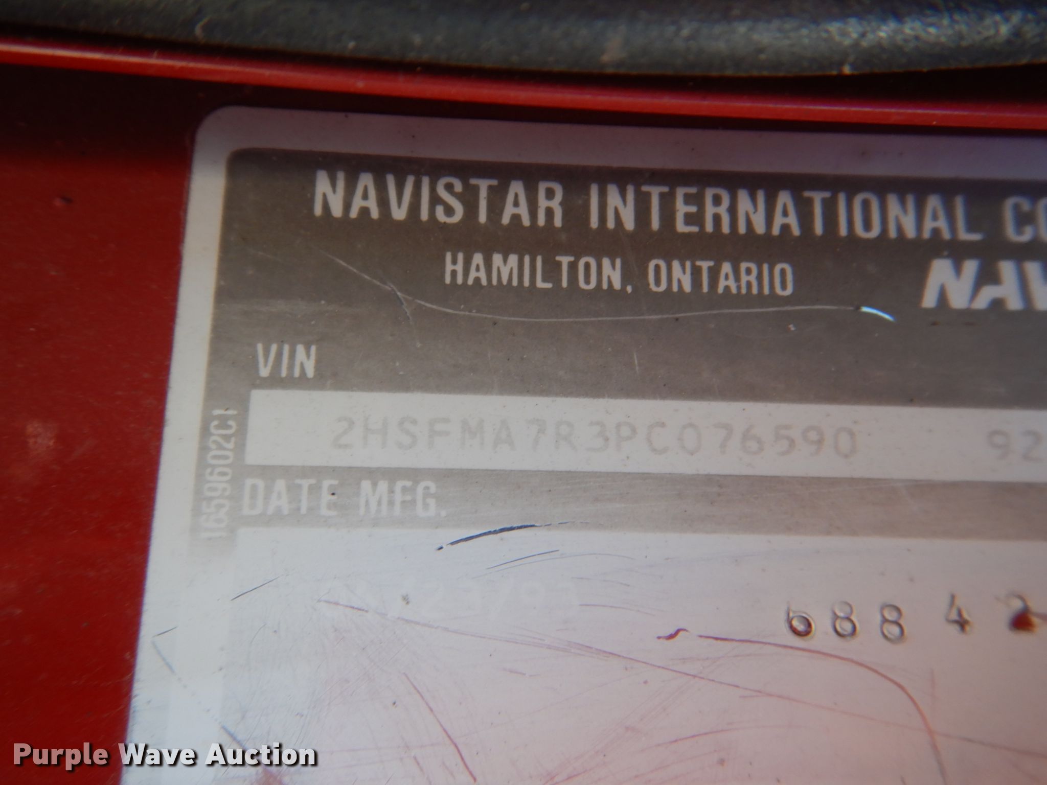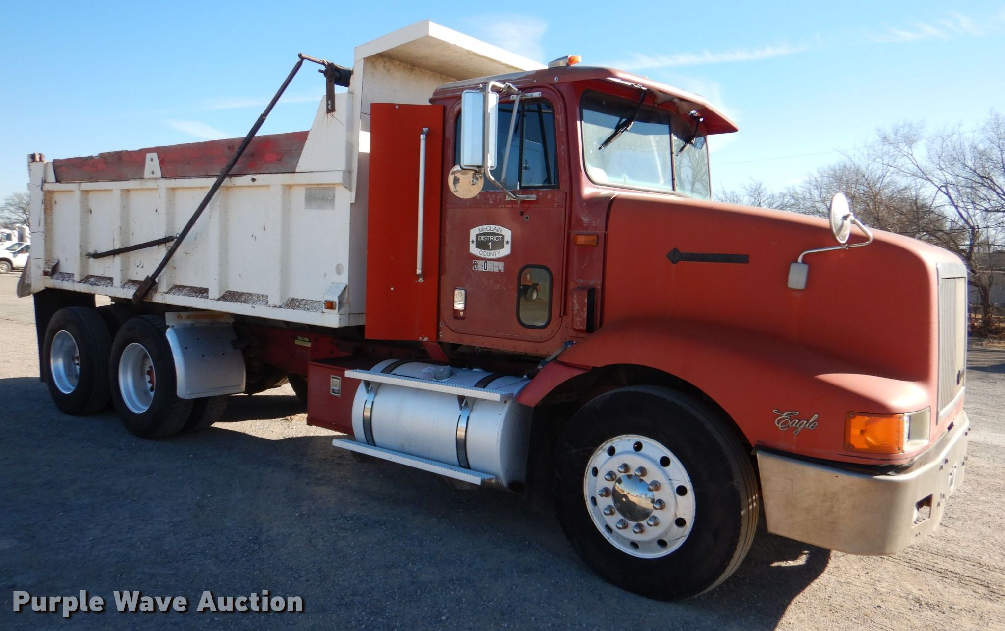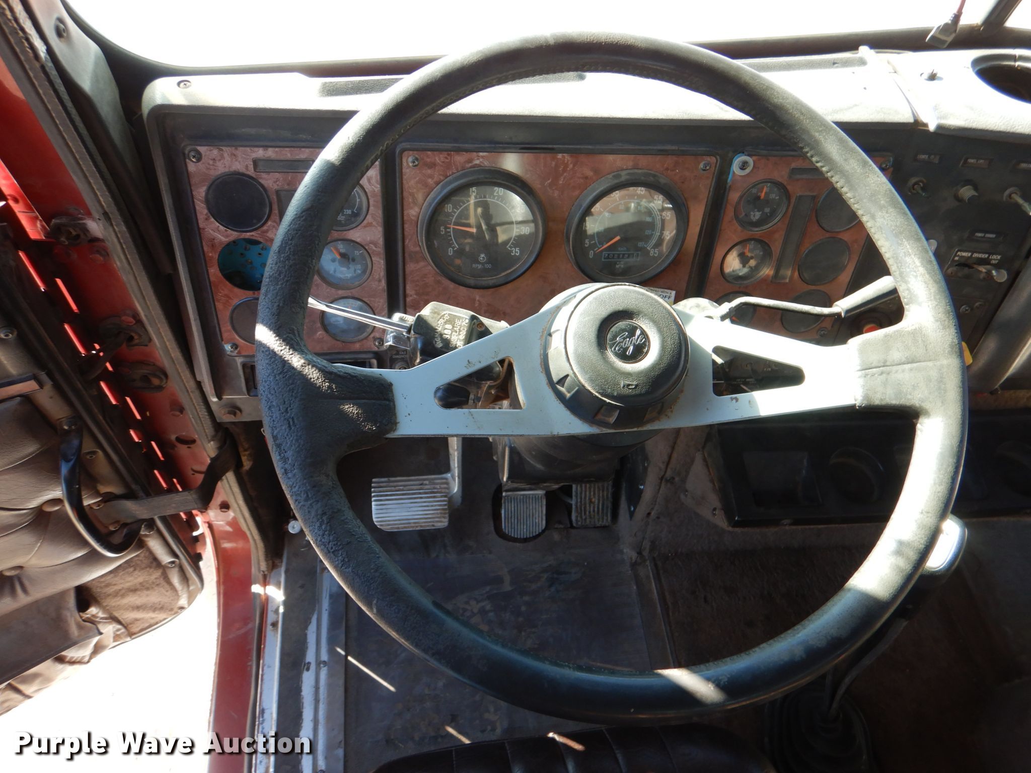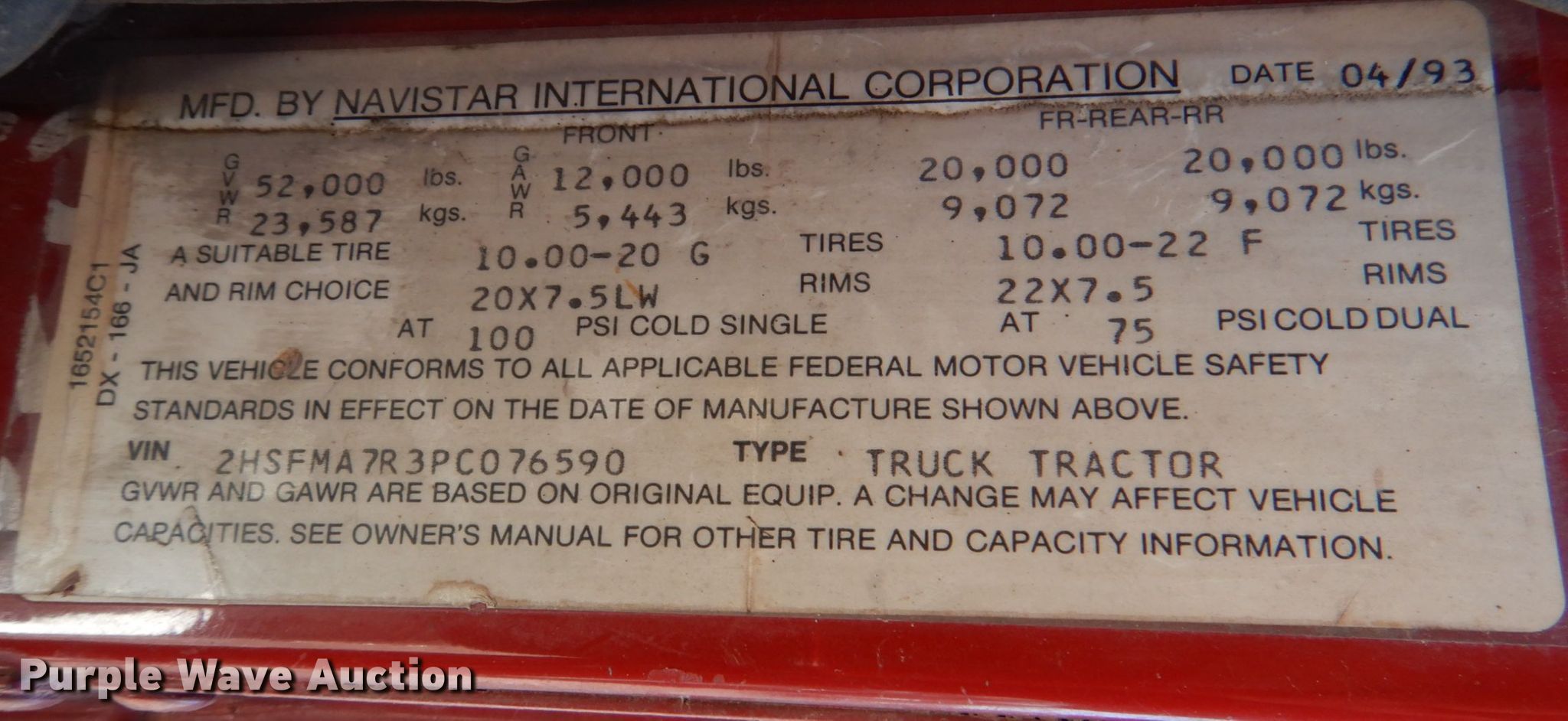 1993 International 9200 dump truck. Miles: 702,130 on odometer, VIN: 2HSFMA7R3PC076590. Engine Cummins L10-330E, Serial: 3468994, Displacement: 10.0L, Cylinders: 6, Fuel type: Diesel, Engine brake. Transmission Eaton Fuller, Manual, Speed: 13. Chassis Axles: Tandem, Differential lock: Inter-axle, Suspension: Air, Brakes: Air, PTO, GVWR: 52,000 lbs. Interior AC, Heat, Cruise control. Operational Dump bed 15' L x 8' W, Side height: 39", Side board height: 9", Bed type: Steel, Roll tarp, Ram: Single , End gate: Air operated. Tires Size: 11R22.5. Oklahoma title. McClain County, OK. 301 N Shannon St. Wayne, OK 73095