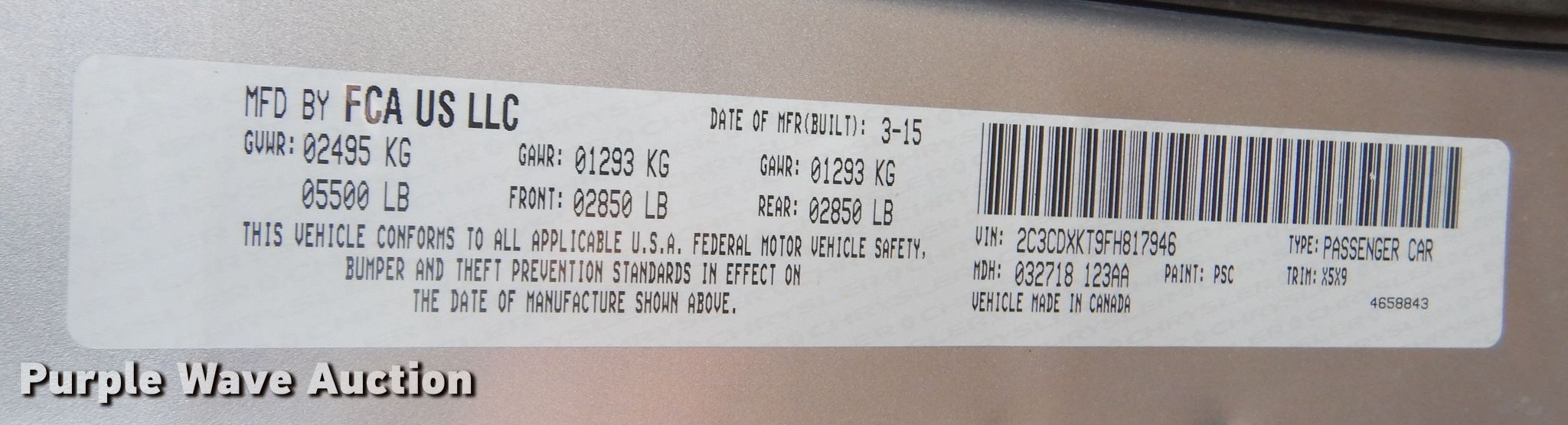 2015 Dodge Charger Police. Miles: 130,462 on odometer, VIN: 2C3CDXKT9FH817946, Unit #: AK324. Engine Displacement: 5.7L V8 OHV 16V, Cylinders: 8, Fuel type: Gas. Transmission Automatic, All wheel drive. Interior AC, Heat, Seat: Power driver, Power windows, Power locks, Cruise control. Tires Size: P225/60R18. Notes Dash warning indicator: TPMS. South Dakota title. State of South Dakota Property Management. 104 S Garfield Ave. Pierre, SD 57501