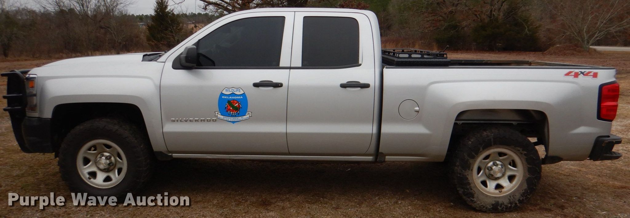 2016 Chevrolet Silverado 1500 Double Cab pickup truck. Miles: 106,210 on odometer, VIN: 1GCVKNEC6GZ229207. Engine Displacement: 5.3L V8 OHV 16V, Cylinders: 8, Fuel type: Gas. Transmission Automatic, Four wheel drive. Interior AC, Heat, Heated mirrors, Power windows, Power locks, Cruise control. Tires Size: LT285/70R17. Notes Dash warning indicator: Check engine, Traction Control, Possible brake issues, Engine issues, misfire. Oklahoma title. Title distribution may be delayed up to 30 days from verification of funds. Oklahoma Department of Wildlife Conservation. Wright City, OK 74766