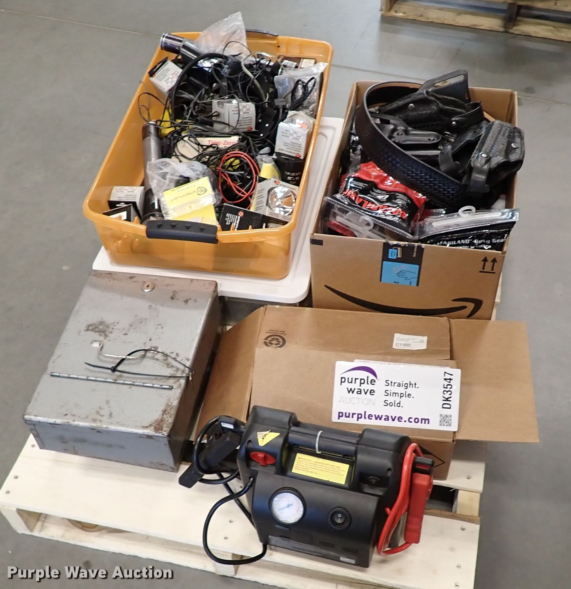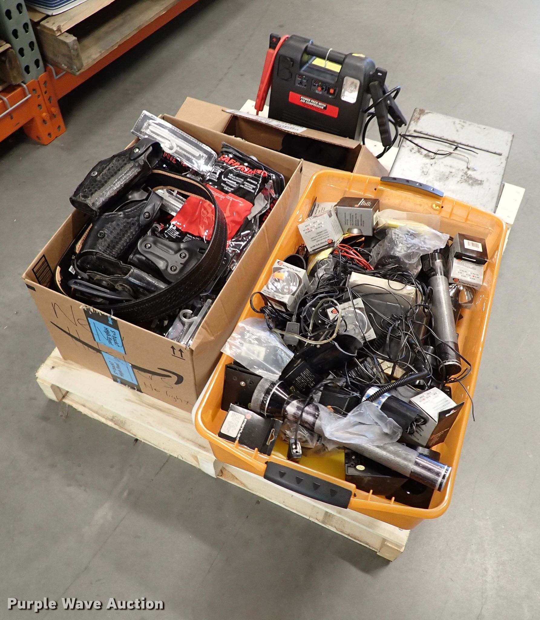 Purple Wave is selling a used Sporting Goods in Oklahoma. This item is a Sporting goods with the following: (2) lock boxes, Jump box with compressor, Flashlights, Approx. 10 SafariLand Glock holsters, Unused, (4) Glock holsters, Rifle slings, AR end plates, Unused duty belt