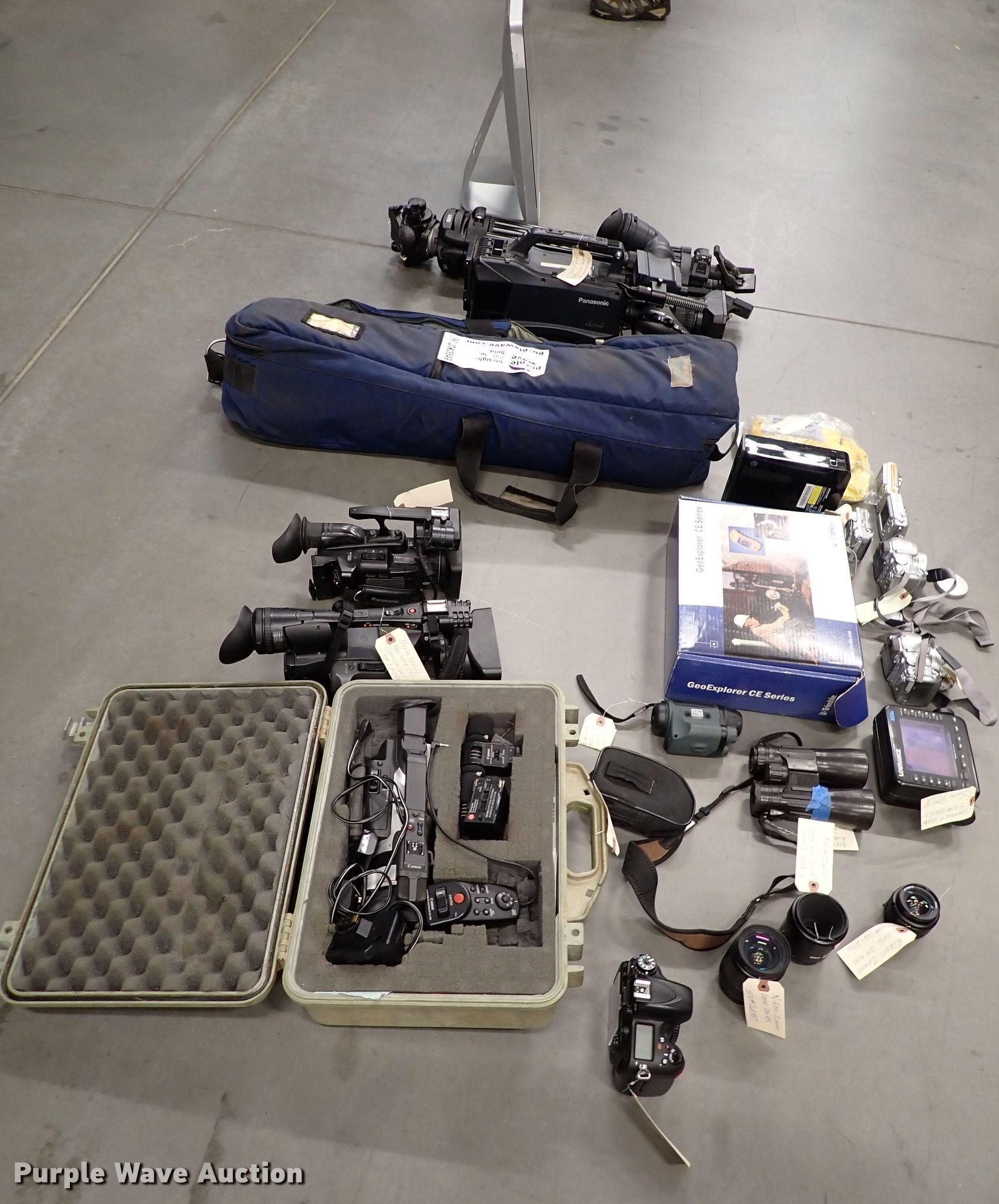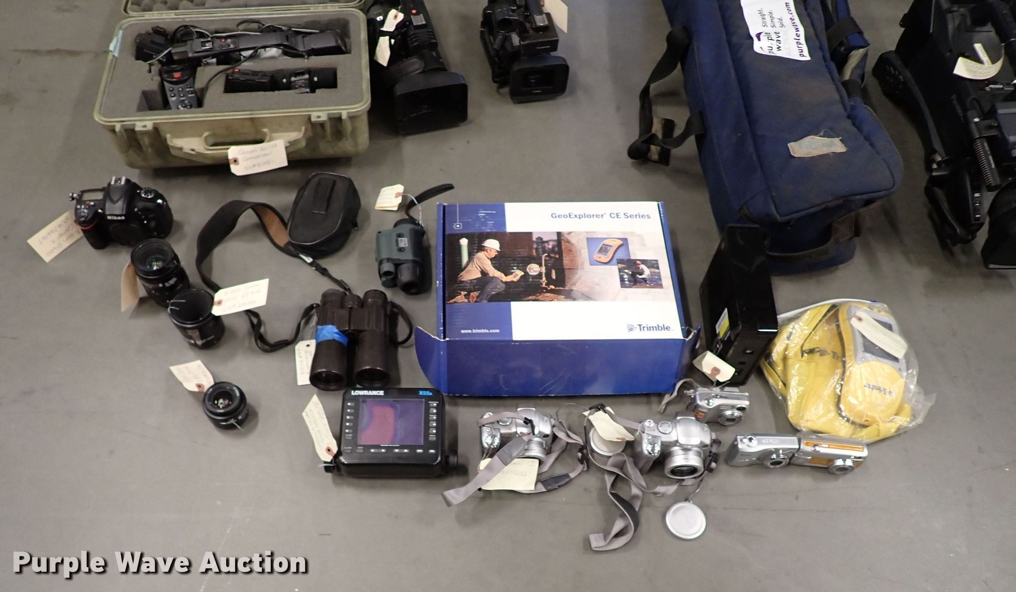 Purple Wave is selling a used Electronics in Oklahoma. This item is a Electronics with the following: ( 2) Trimble Geo Explorer CE GPS units, Canon A470 camera, Kodak Easyshare C913 camera, Nikon Coolpix 4100 camera, Canon Powershot S2 camera, Lowrance X55A depth finder, Lite-On It DVD drive, Binoculars, Night vision monocular, Nikon D600 with 3 lenses, Canon GL-23 camcorder, Panasonic HG-HPX 170 camcorder, Panasonic HD Avcam camcorder, Vinton Vision SD-12B tripod, Panasonic P2HD camcorder, Camera tripod, CPU monitor combo, No hard drive