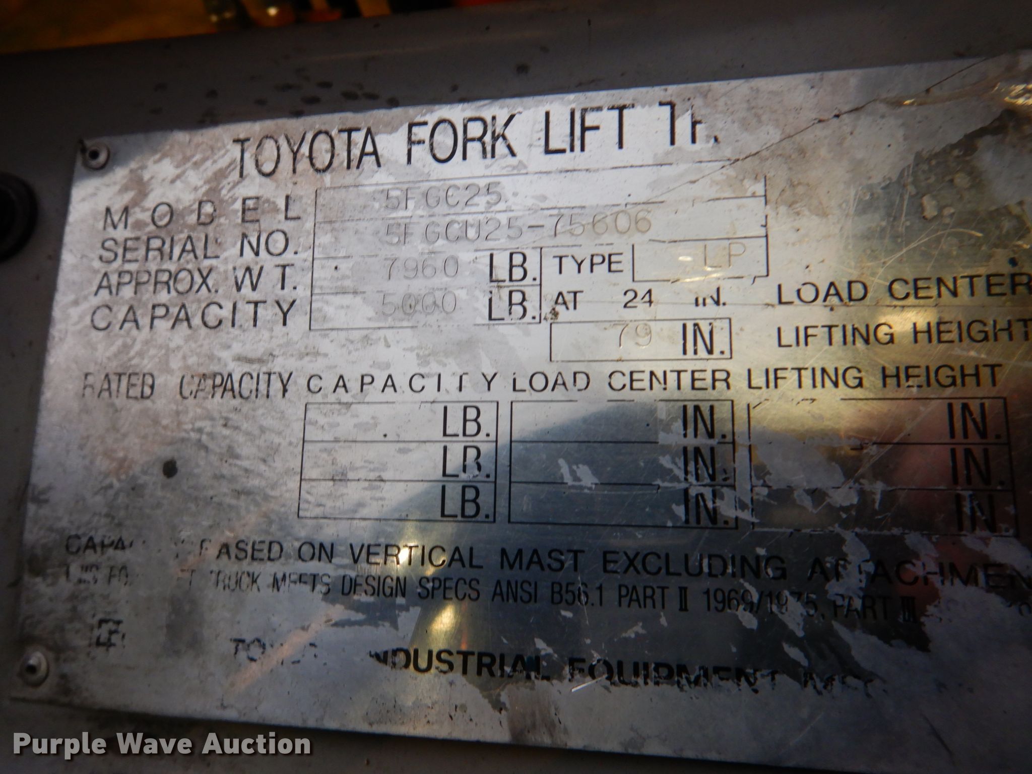 Toyota 5FGC25 forklift. Hours: 18,293 on meter, Serial: 5FGCU25-75606. Engine Toyota, Cylinders: 4, Fuel type: LPG LP bottle: Included. Transmission Powershift, 1F - 1R. Operators station Canopy. Operational Maximum lift capacity: 5,000 lbs, Maximum lift height: 79", Mast stages: 2, Mast tilt, Fork length: 37". Tires Front: 21x7x15, Rear: 18x6x12.125, Non marking. Owen Brister. 1530 S Orchard Dr. Ottawa, KS 66067