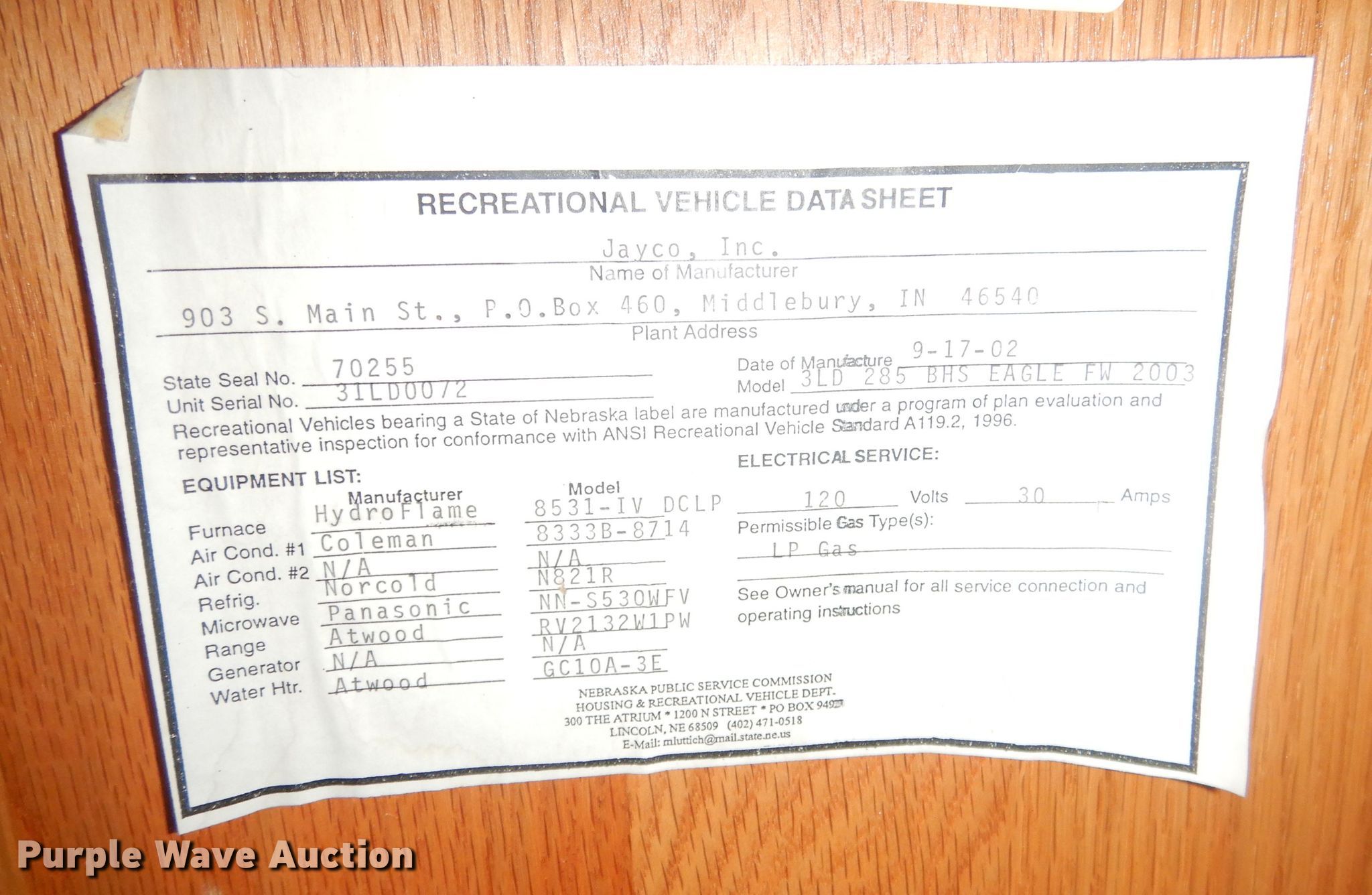 Purple Wave is selling a used RV in Nebraska. This item is a 2003 Jayco Eagle camper with the following: Camper length: 28' 6", VIN: 1UJCJ02N031LD0072