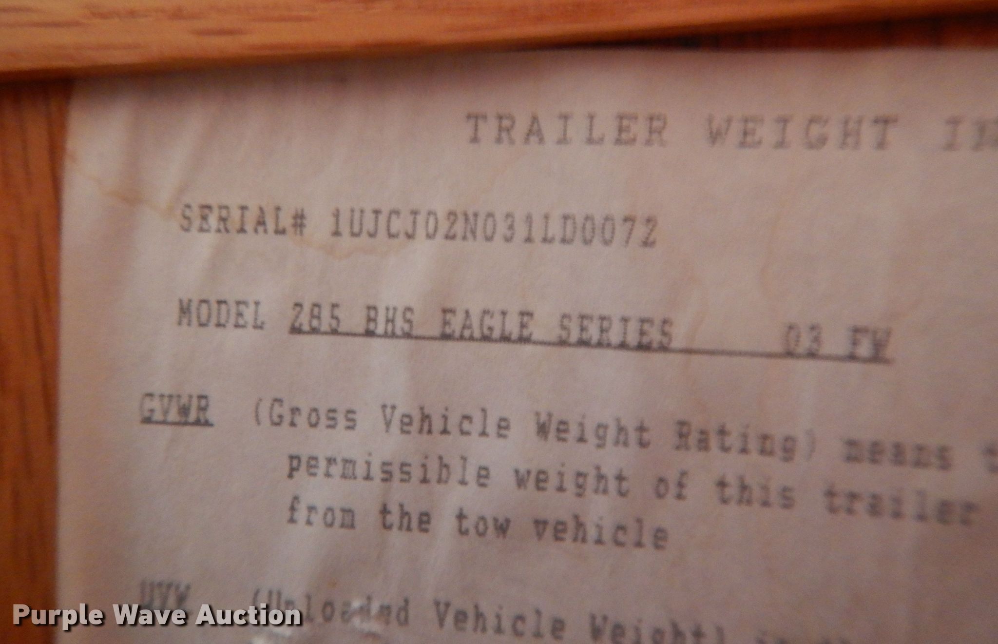 2003 Jayco Eagle camper. Camper length: 28' 6", VIN: 1UJCJ02N031LD0072. Chassis Axles: Tandem, Suspension: Spring, Brakes: Electric, GVWR: 9,995 lbs. Interior Kitchen: Sink, Dishwasher, Refrigerator, Freezer, Microwave, Oven, Stove: Gas, Living room: Table, Couch, Bathroom, Bed type: Queen, Twin, Satellite, Heater, AC units: 1. Operational Slide outs: 1, Awnings: 1 Awning type: Manual. Tires Size: 225/75R15. Notes Gooseneck hitch adapter not included. Nebraska title. Mullen, NE 69152