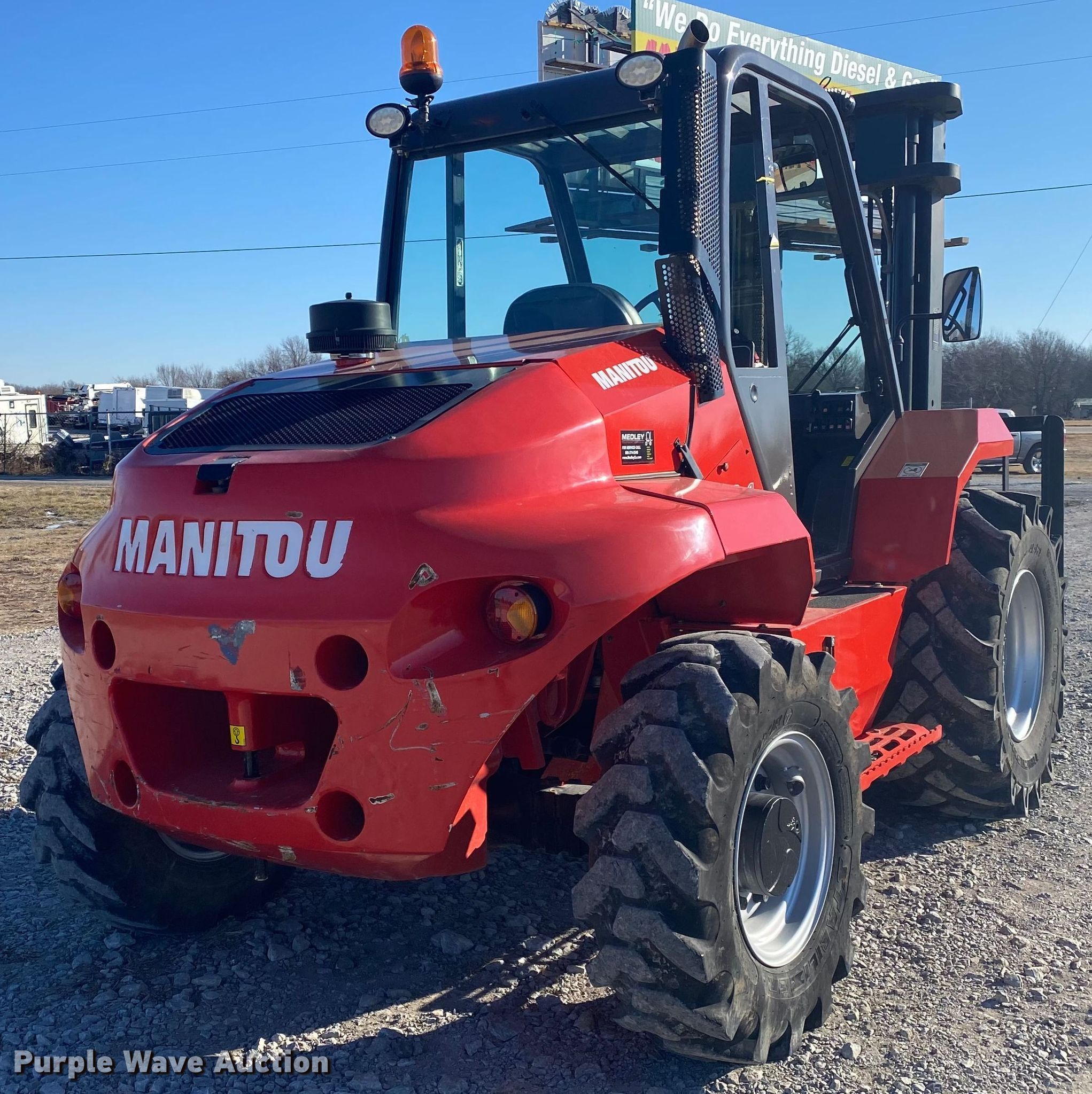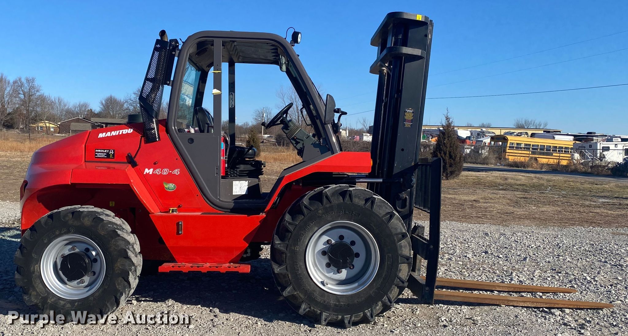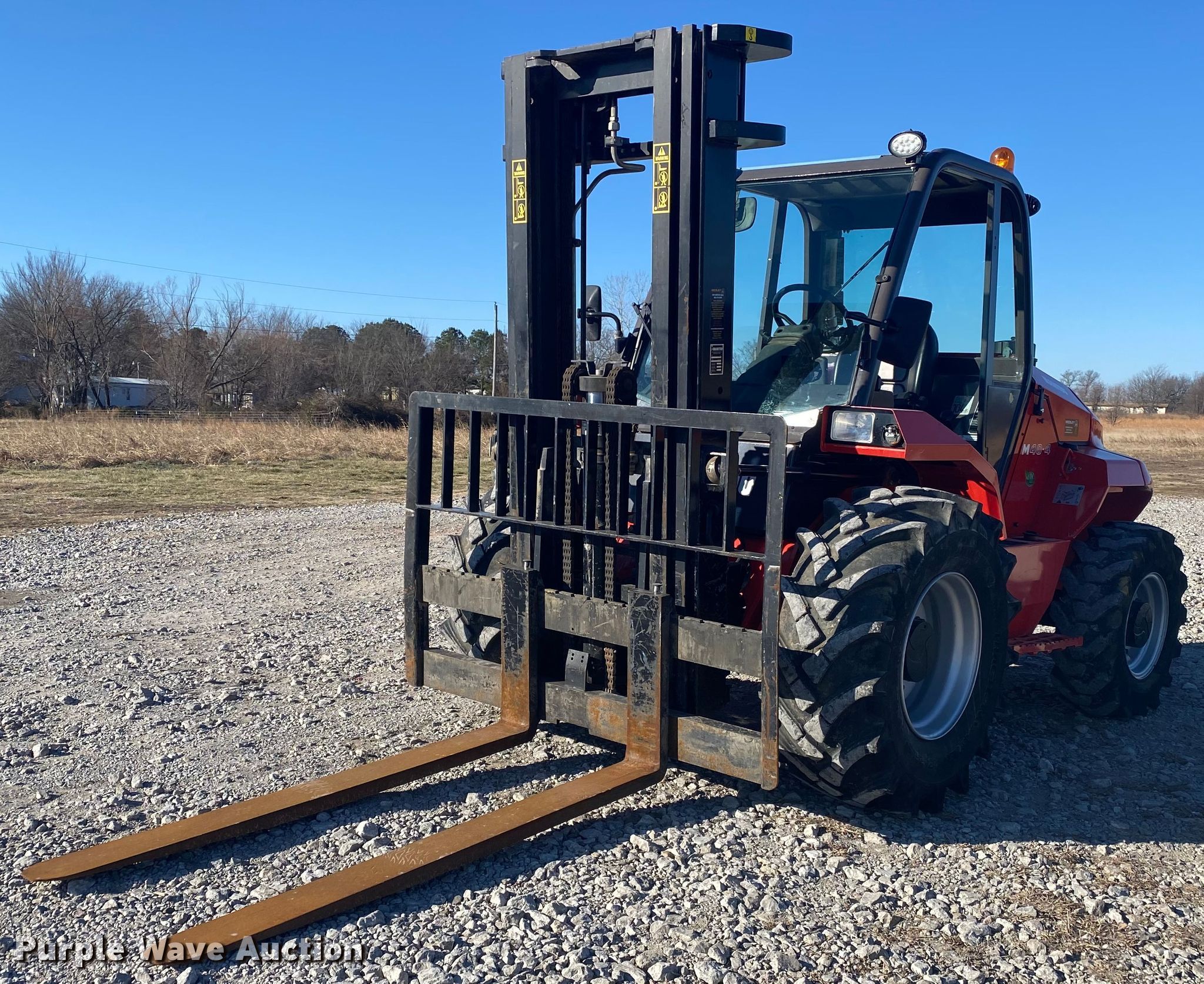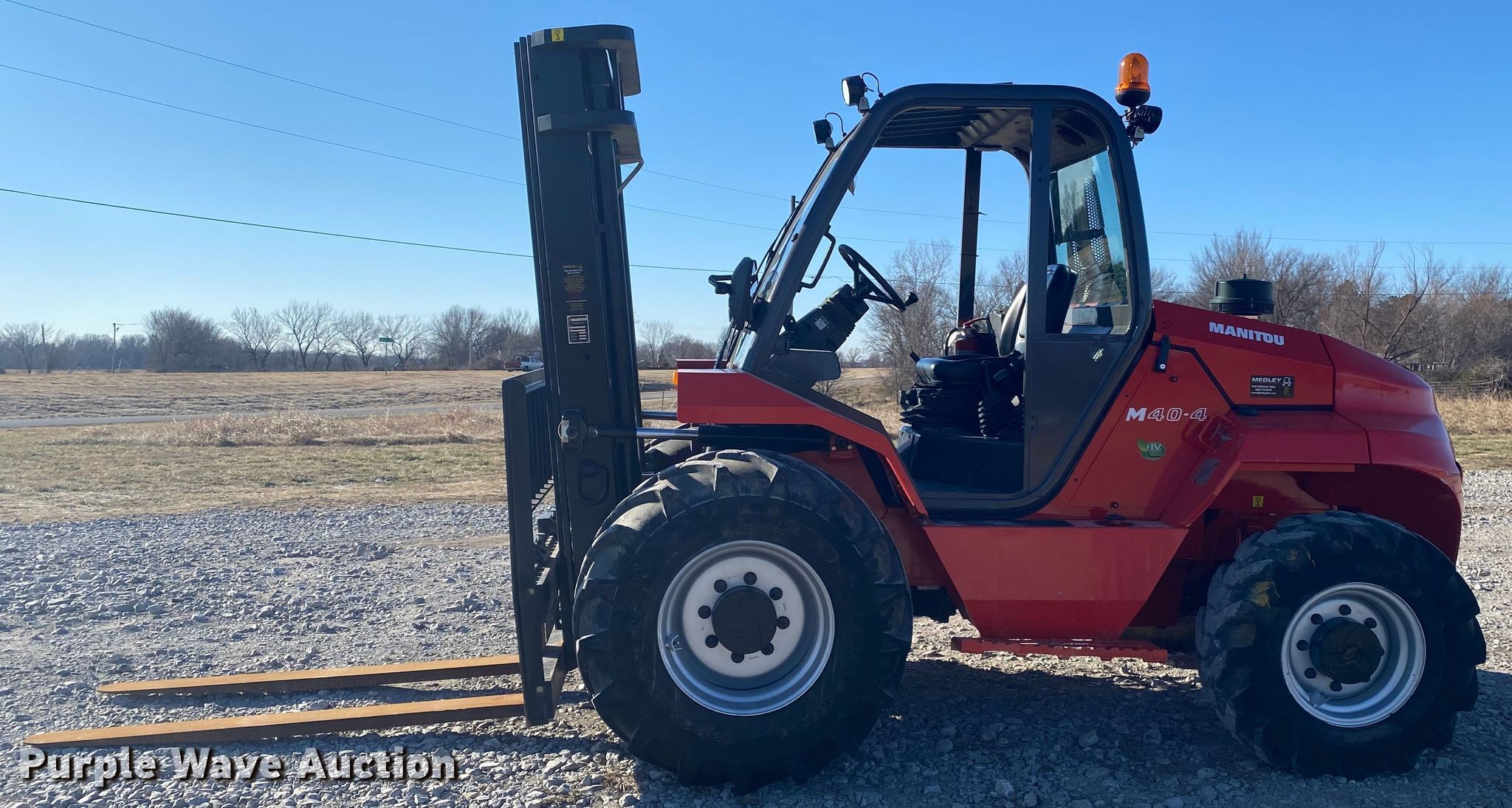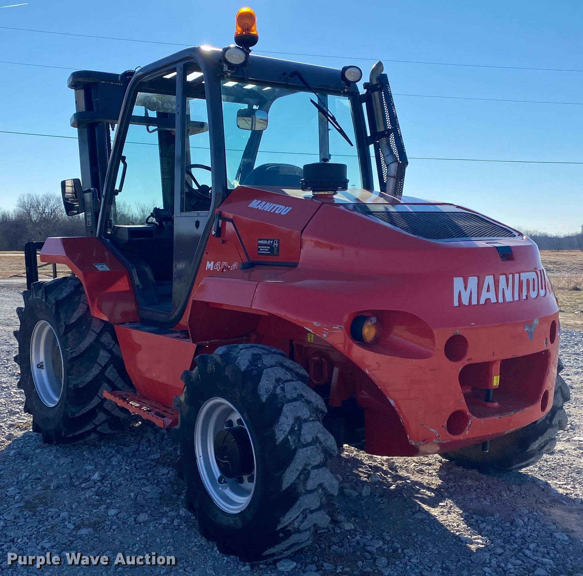 Purple Wave is selling a used Strt. Mast Rough Terr. Forklift in Oklahoma. This item is a 2019 Manitou M40-4 forklift with the following: Hours: 696 on meter, Serial: 797800