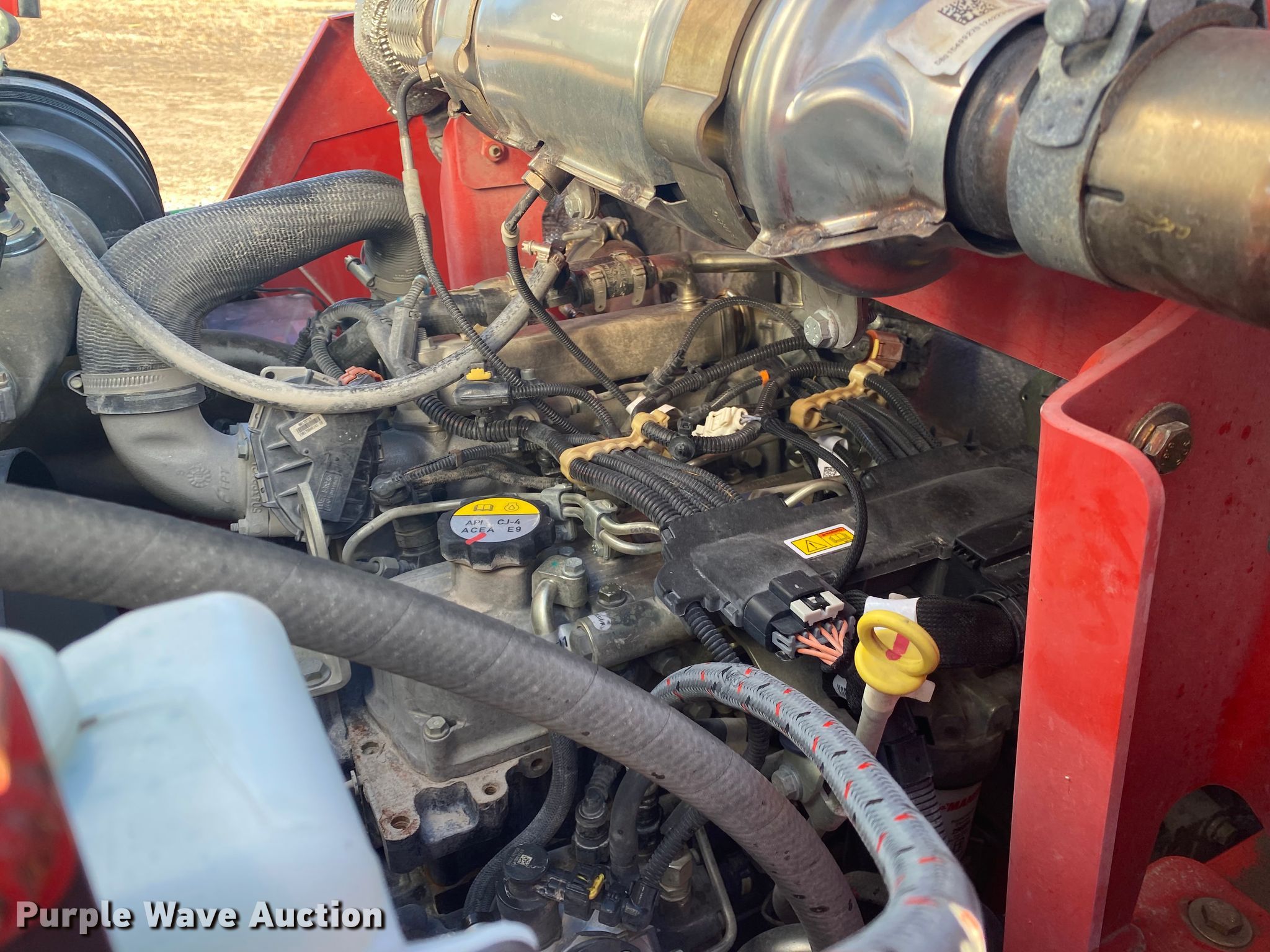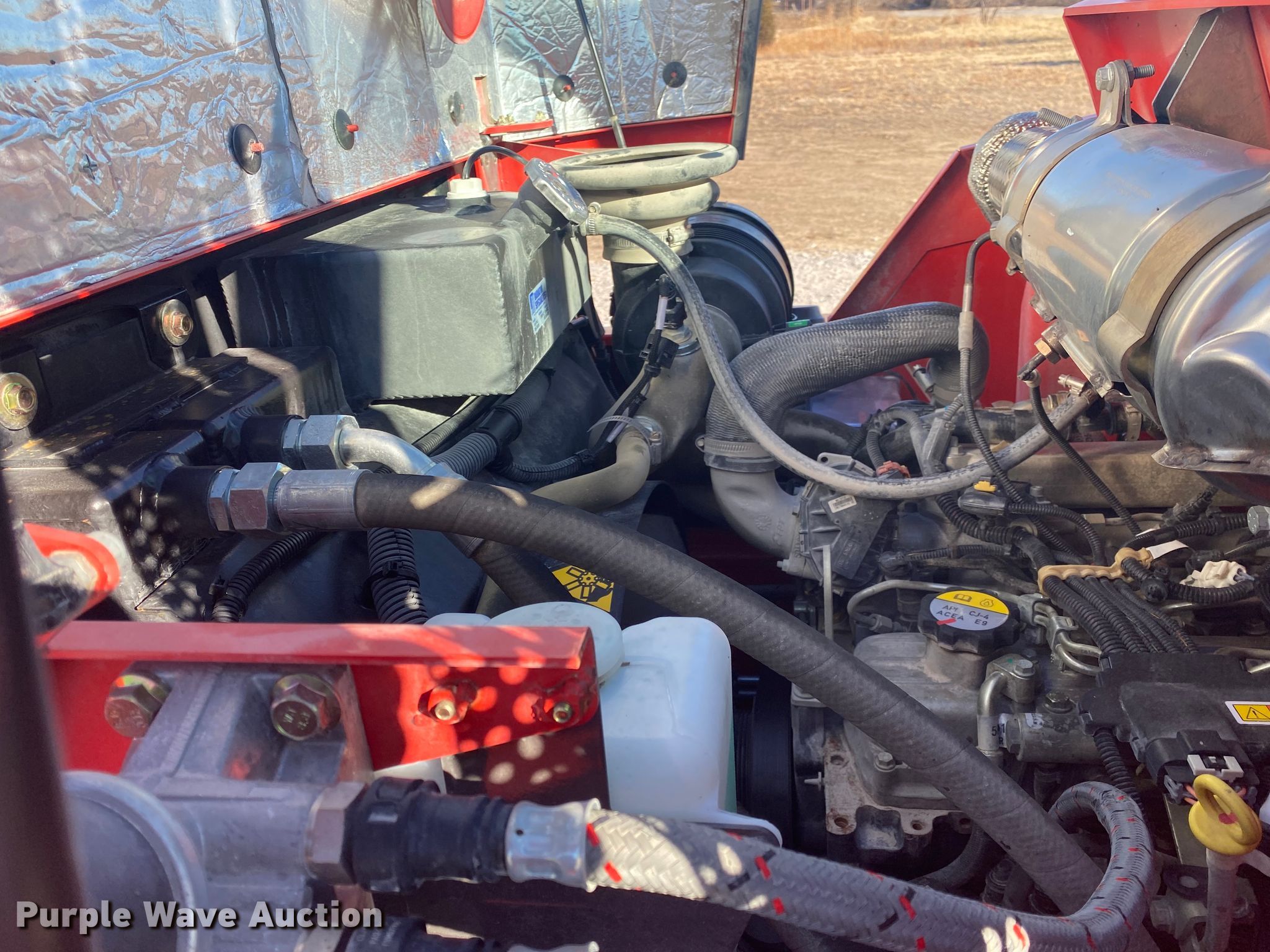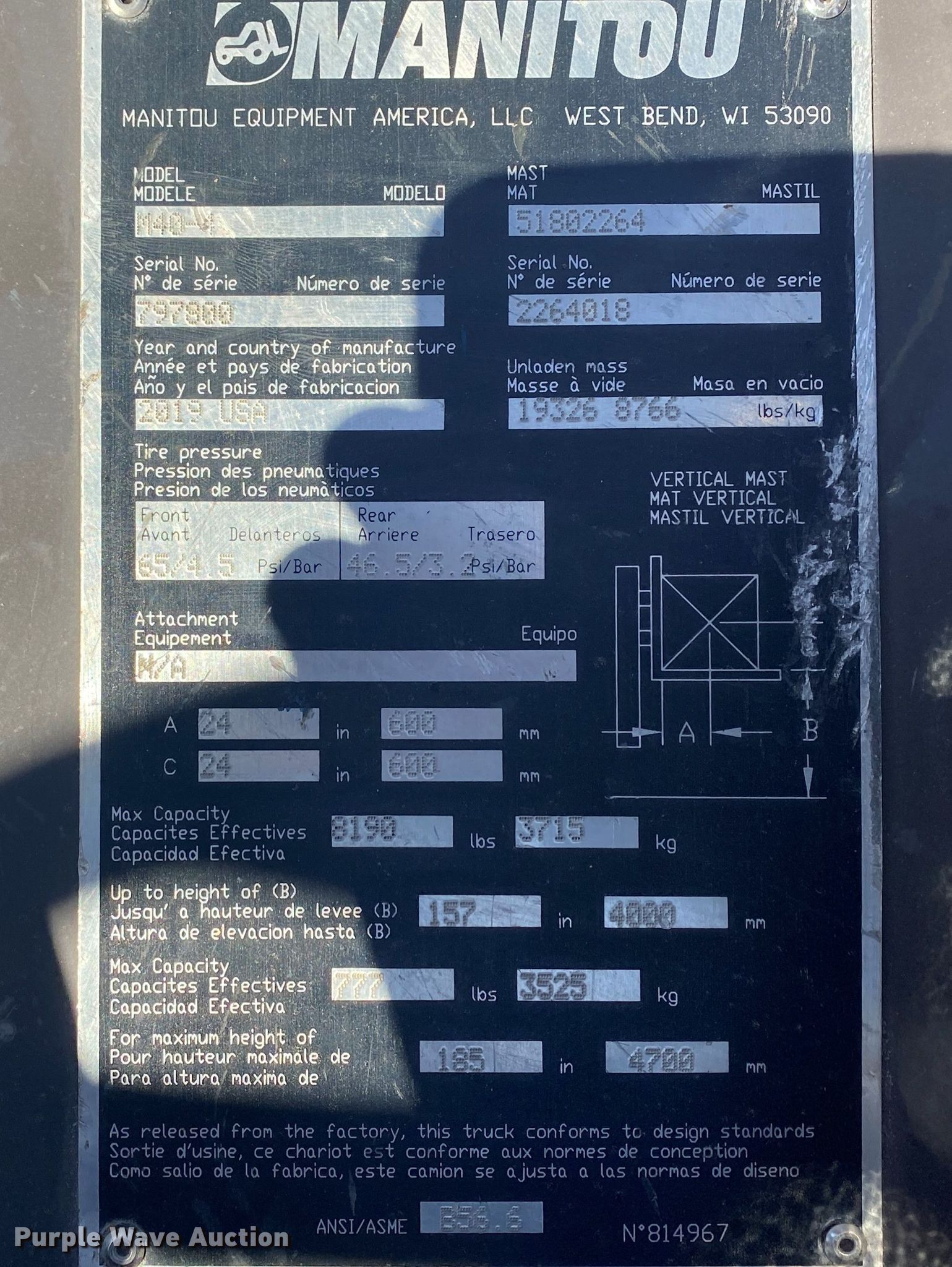 2019 Manitou M40-4 forklift. Hours: 696 on meter, Serial: 797800. Engine FPT Industrial 3914/2200, Serial: JT83426L046291D, Displacement: 3.4L, Cylinders: 4, Fuel type: Diesel, HP: 75. Transmission Shuttle shift, 3F - 3R. Chassis Four wheel drive, Differential lock. Operators station OROPS. Operational Maximum lift capacity: 8,190 lbs, Maximum lift height: 157", Mast stages: 3, Side shift, Mast tilt, Fork length: 72". Tires Front: 18-22.5, Rear: 12.5/80-18. 15600 N 145th E Ave. Collinsville, OK 74021