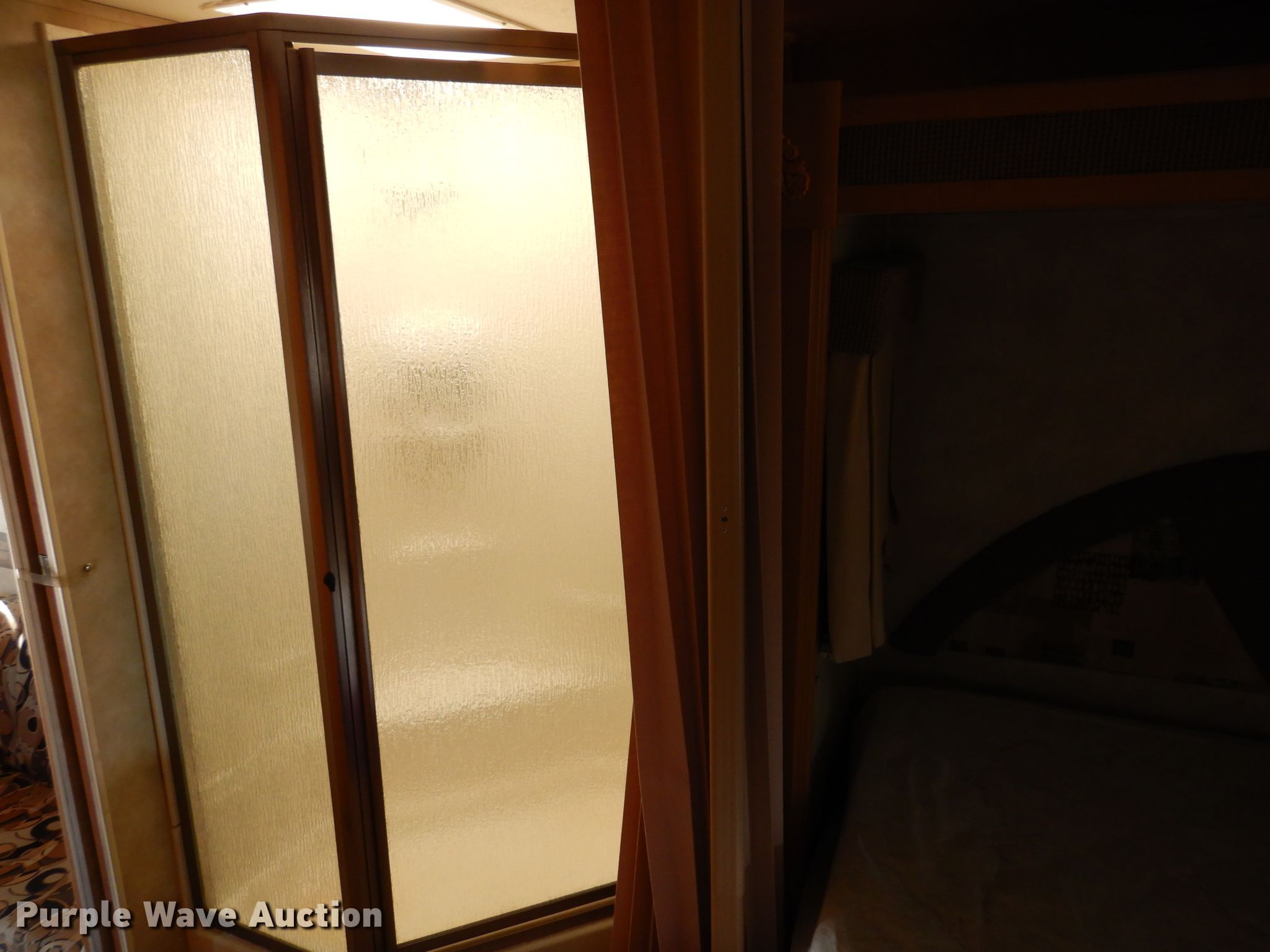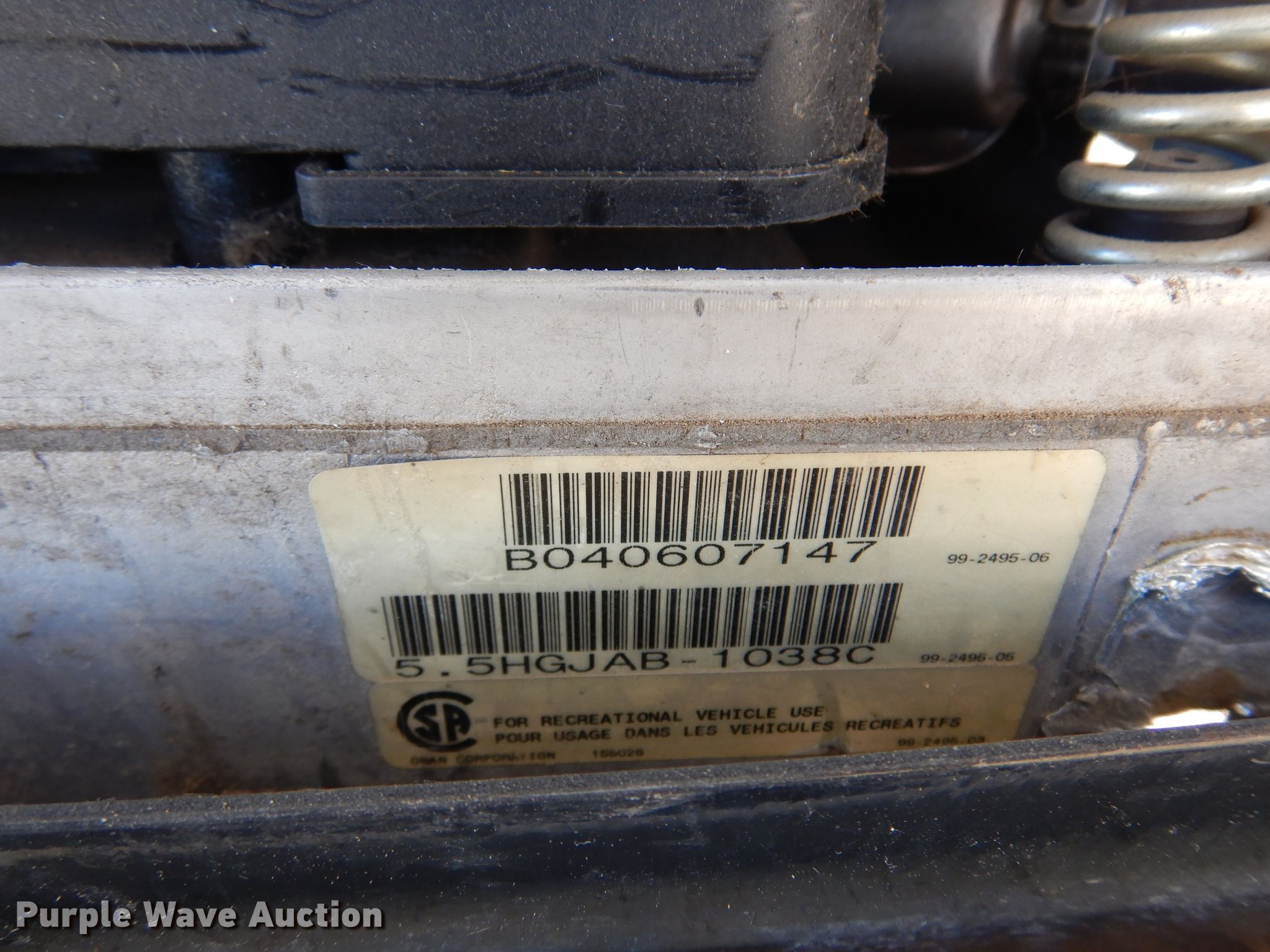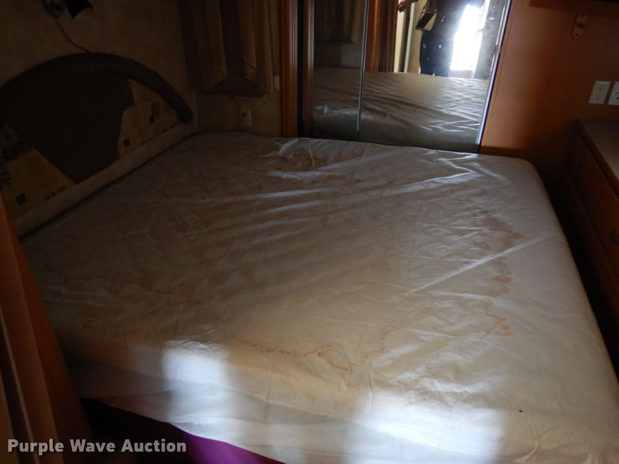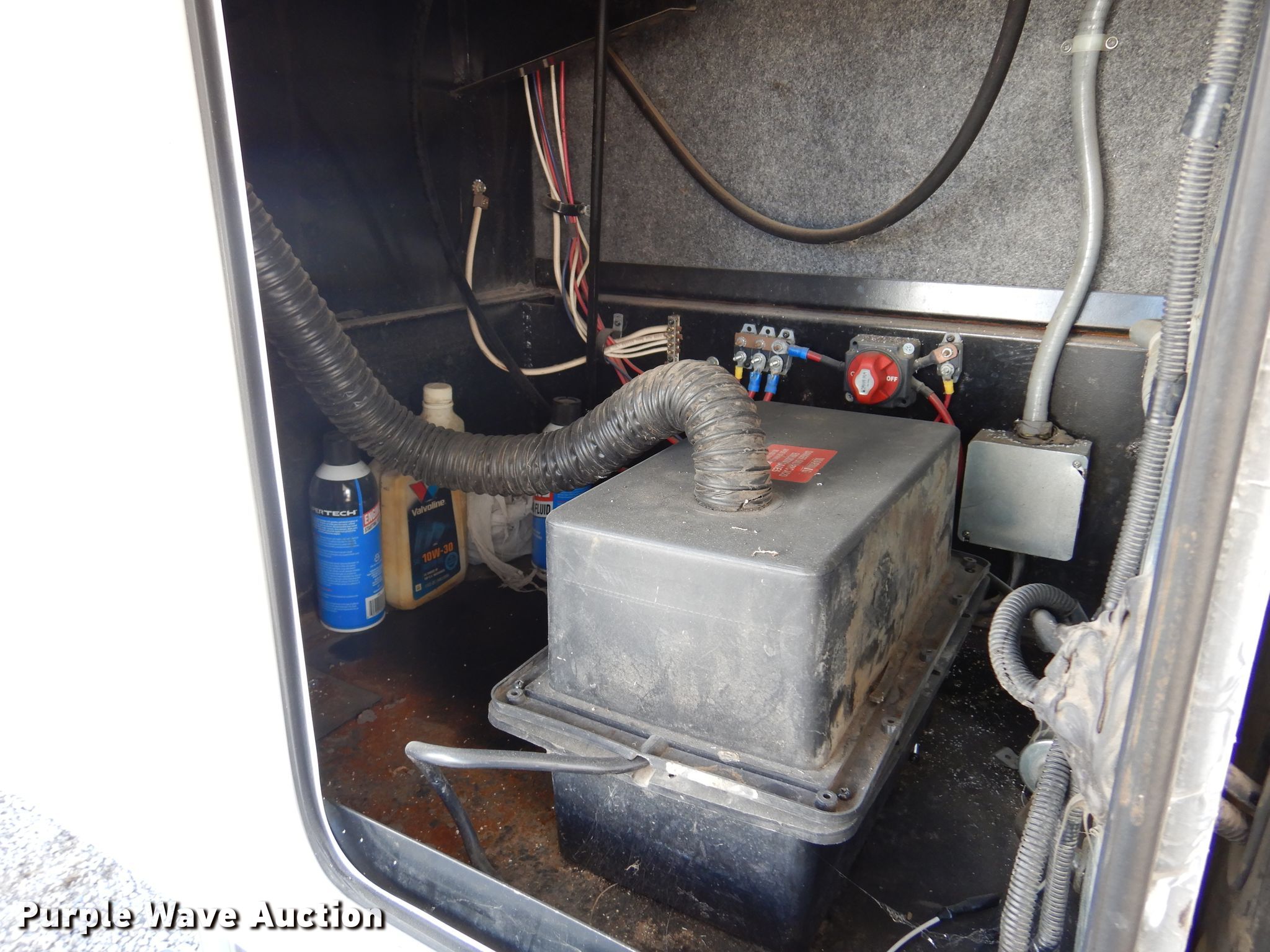 2007 Heartland Cyclone toy hauler camper. Camper length: 39', VIN: 5SFGF35307E002066. Chassis Axles: Triple, Suspension: Spring, Brakes: Electric. Interior Kitchen: Sink, Refrigerator, Freezer, Microwave, Oven, Stove: Propane, Living room: Table, Pull Out Couch, Bathroom, Beds: 2 Bed type: Double, TVs: 2, Sound system, Heater, AC units: 2. Operational Slide outs: 2, Awnings: 1 Awning type: Electric, Rear door/ ramp, Generator Onan, Hours: 95.9 on meter, Fuel type: Diesel, kW: 5.5. Tires Size: 225/75R15. Notes Water damage. Kansas title. Raymond Barnett Estate. 120 1150th St. Humboldt, KS 66748