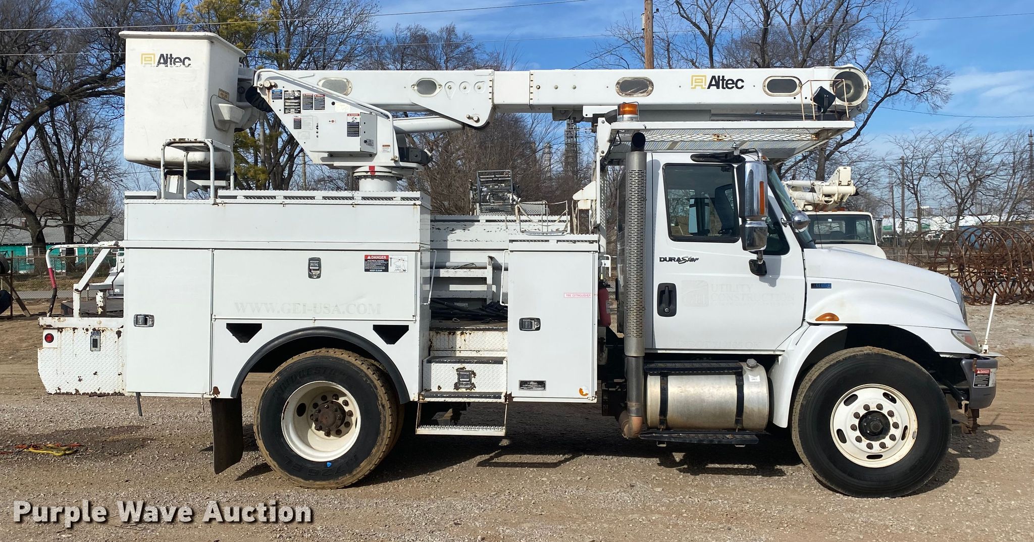 2012 International 4300 bucket truck. Miles: 80,518 on odometer, Hours: 8,133 on meter, VIN: 3HAMMAAR3CL632986. Engine International MaxxForce DT, Displacement: 7.6L, Cylinders: 6, Fuel type: Diesel. Transmission Automatic. Chassis Axles: Single, Suspension: Spring, Brakes: Air, PTO, GVWR: 35,000 lbs. Interior AC, Heat, Cruise control, Brake controller. Operational Bed Altec, Serial: 014-20677228, 12' L x 96" W, Boom Altec L42A, Serial: 1211CU1990, Boom length: 20', Maximum lift capacity: 400 lbs, Maximum lift height: 42', Boom type: Insulated, Telescopic, Boom controls Platform/ basket.. Tires Size: 315/80R22.5. Oklahoma title. Gable's Excavating Inc. 3744 S Jackson Ave W. Tulsa, OK 74107