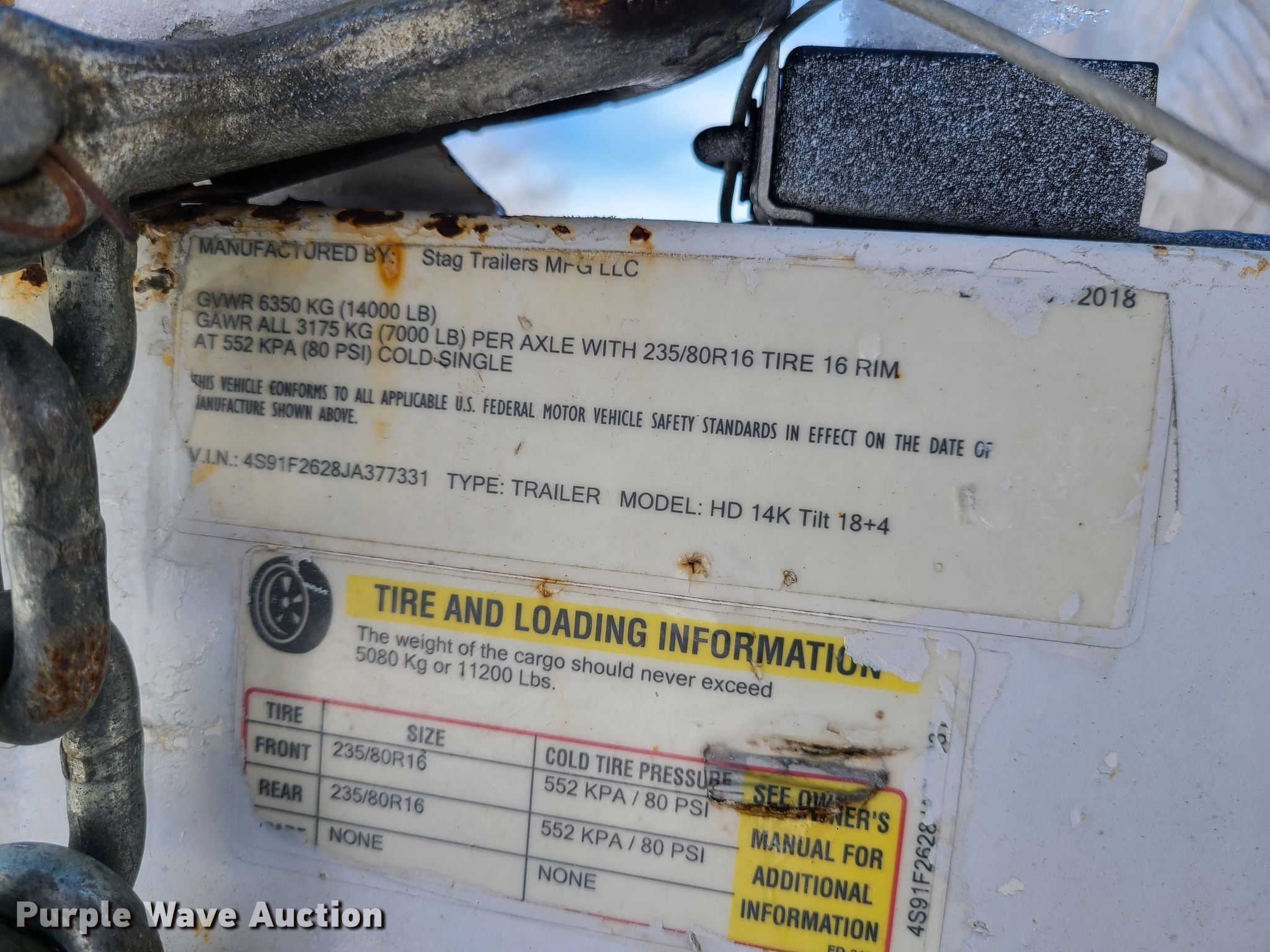 Purple Wave is selling a used Equip. Trailer in Missouri. This item is a 2018 STAG tilt deck equipment trailer with the following: VIN: 4S91F2628JA377331