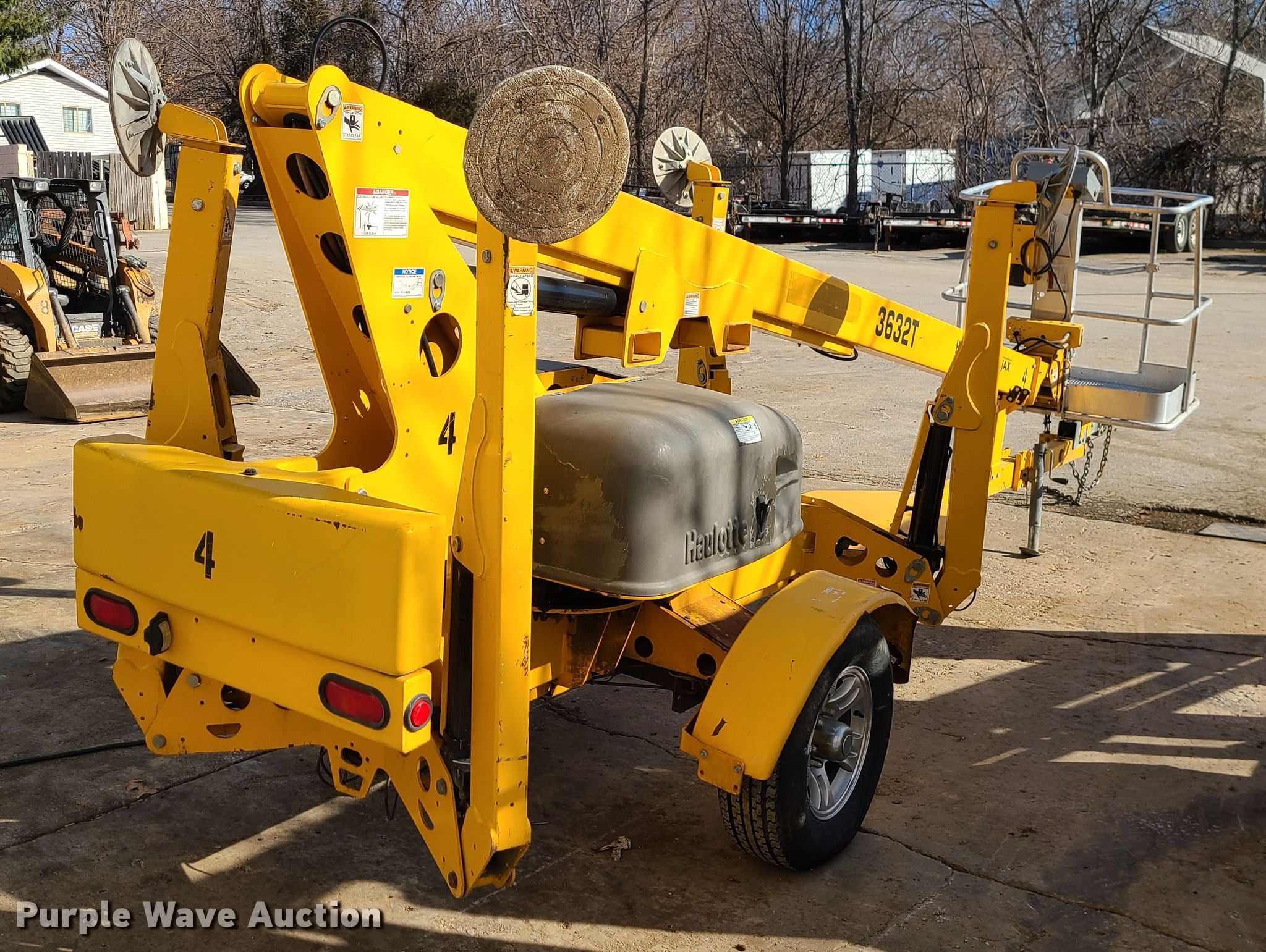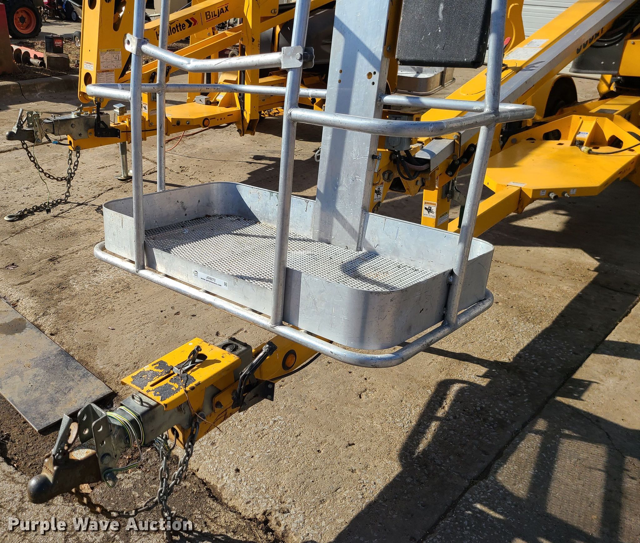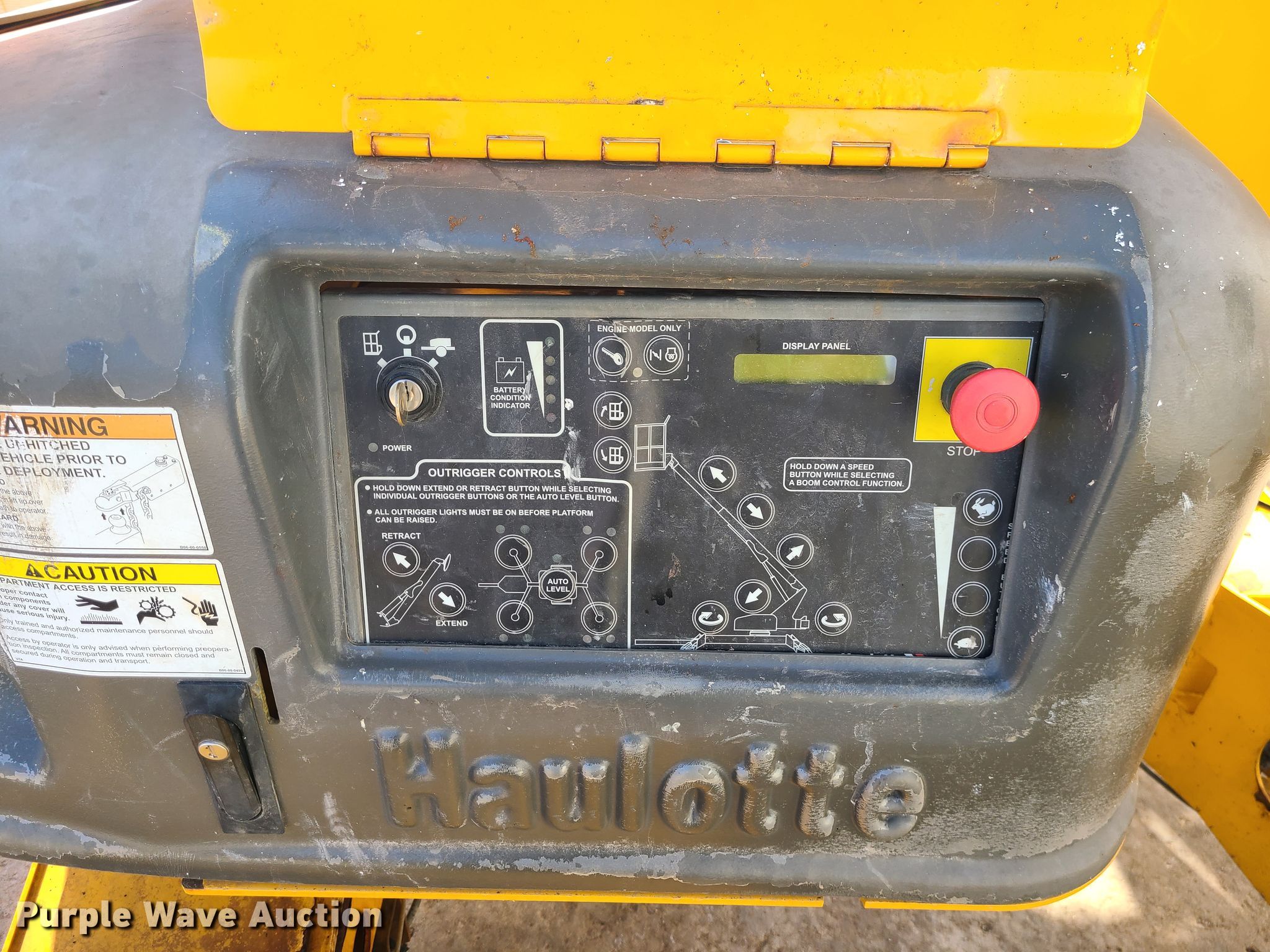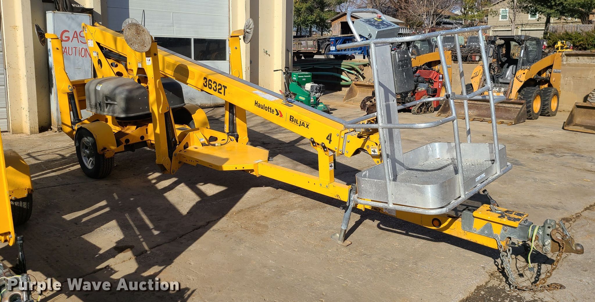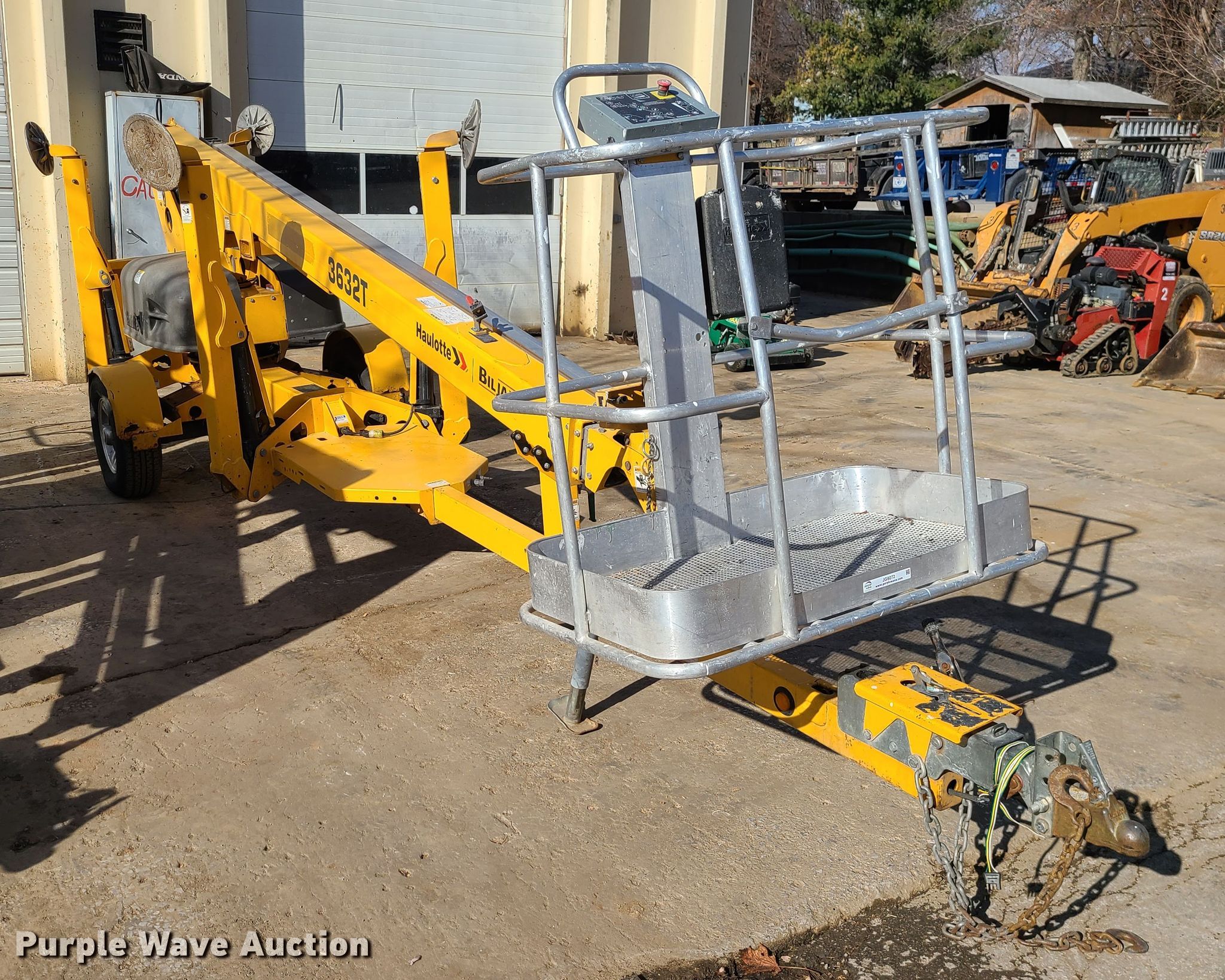 2014 Haulotte 3632T boom lift. VIN: 5CUTE221XEA000002. Electric Motor Volts: 24. Operational Articulating boom, Tow behind, Maximum lift capacity: 500 lbs, Maximum reach length: 32', Maximum lift height: 37' 6", Hydraulic outriggers, Hydraulic leveling, Platform: 48" L x 28" W, Controls: Platform, Ground. Tires Tire size: 225/75R15. Blue Springs Rental. 1615 SW US 40 Hwy. Blue Springs, MO 64015
