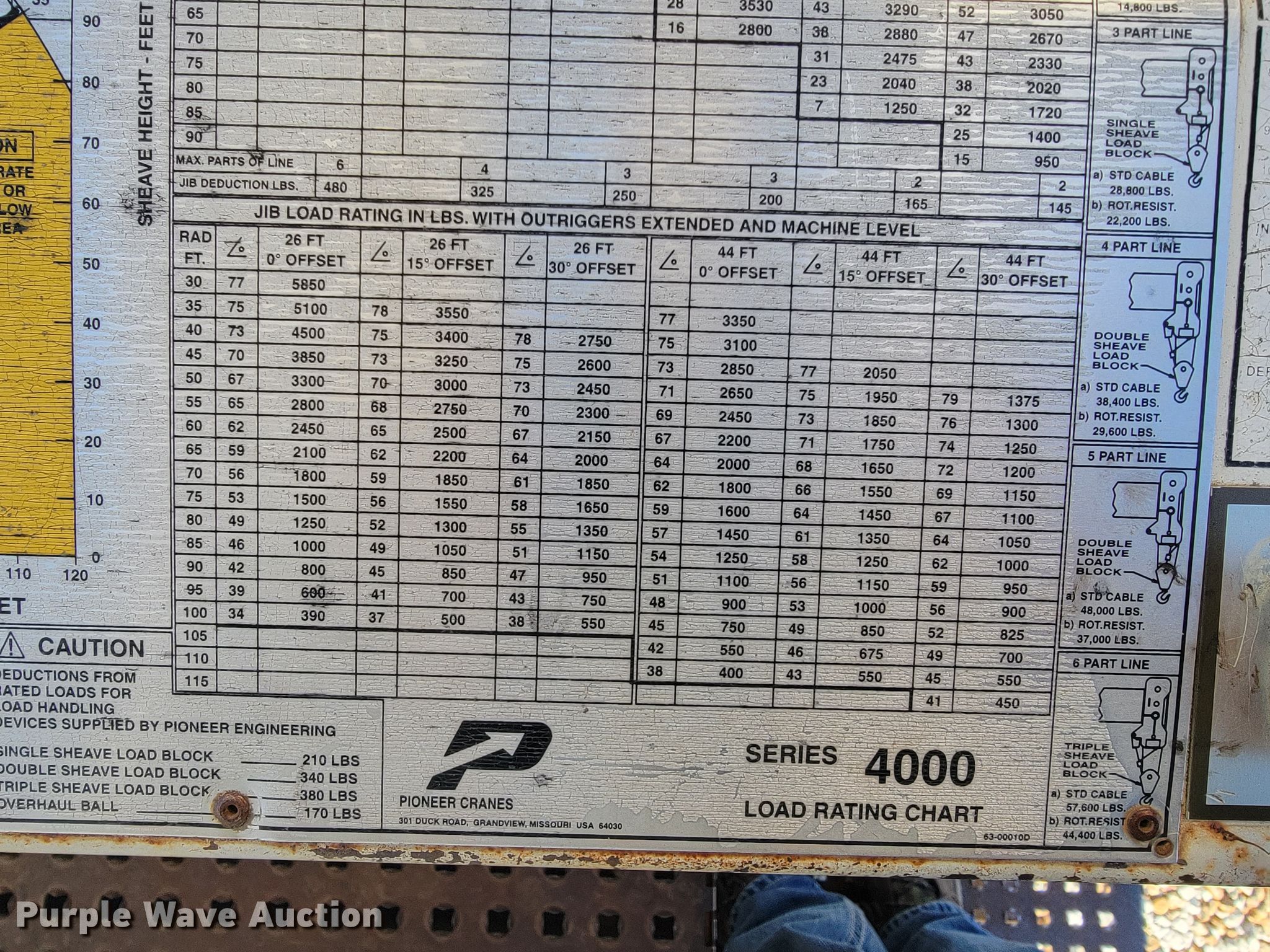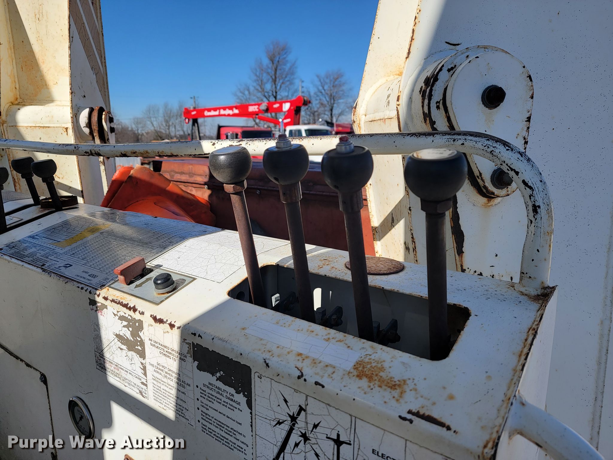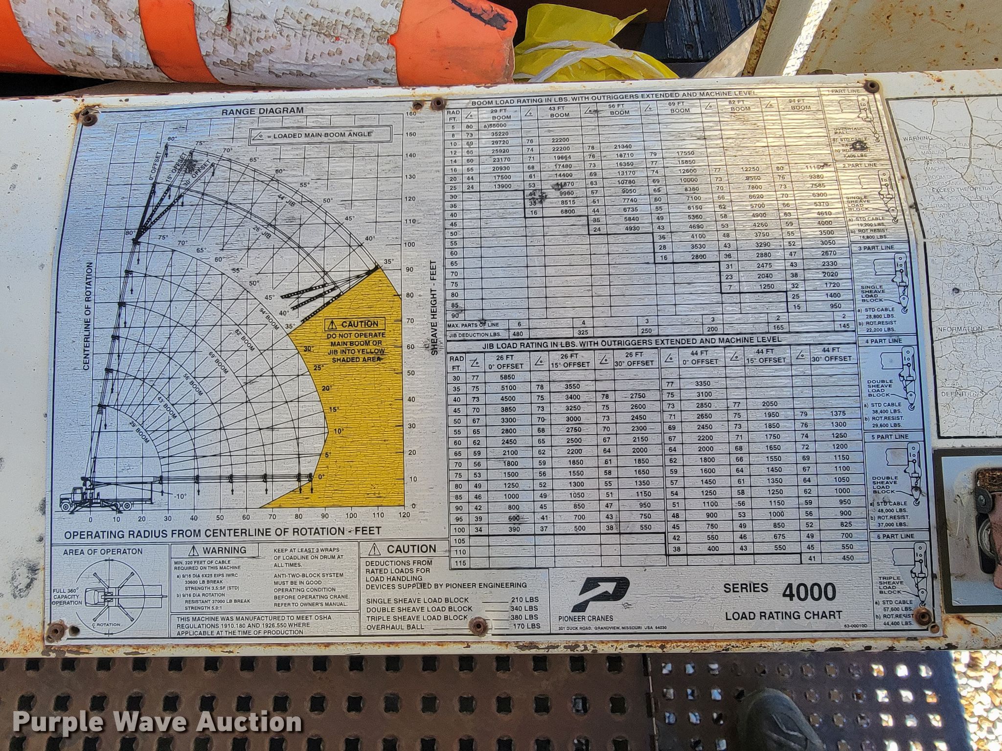1995 Ford L8000 crane truck. Miles: 17,771 on odometer, Hours: 7,505 on meter, VIN: 1FDYU82E2SVA82197. Engine Displacement: 8.3L, Cylinders: 6, Fuel type: Diesel. Transmission Manual, Speed: 10. Chassis Axles: Tandem, Suspension: Spring over walking beam, Brakes: Air, PTO, GVWR: 52,000 lbs, Wheelbase: 260". Interior Heat. Operational 18' L x 102" W, Crane Pioneer 4000, Boom Telescopic, Boom length: 94', Sections: 3, Maximum lift capacity: 55,000 lbs, Jib: 30', Boom controls, Crane ball & hook, Lift chart. Tires Front: 425/65R22.5, Rear: 11R22.5. Notes Turret gear issue, leaking. Missouri title. 2425 E Livingston St. Springfield, MO 65803