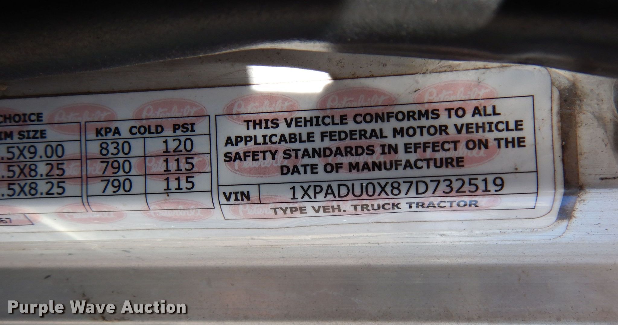 Purple Wave is selling a used Truck Tractor in Texas. This item is a 2007 Peterbilt 357 semi truck with the following: Miles: 79,005 on odometer, Miles: 213,879 on ECM, Hours: 15,361 on meter, VIN: 1XPADU0X87D732519