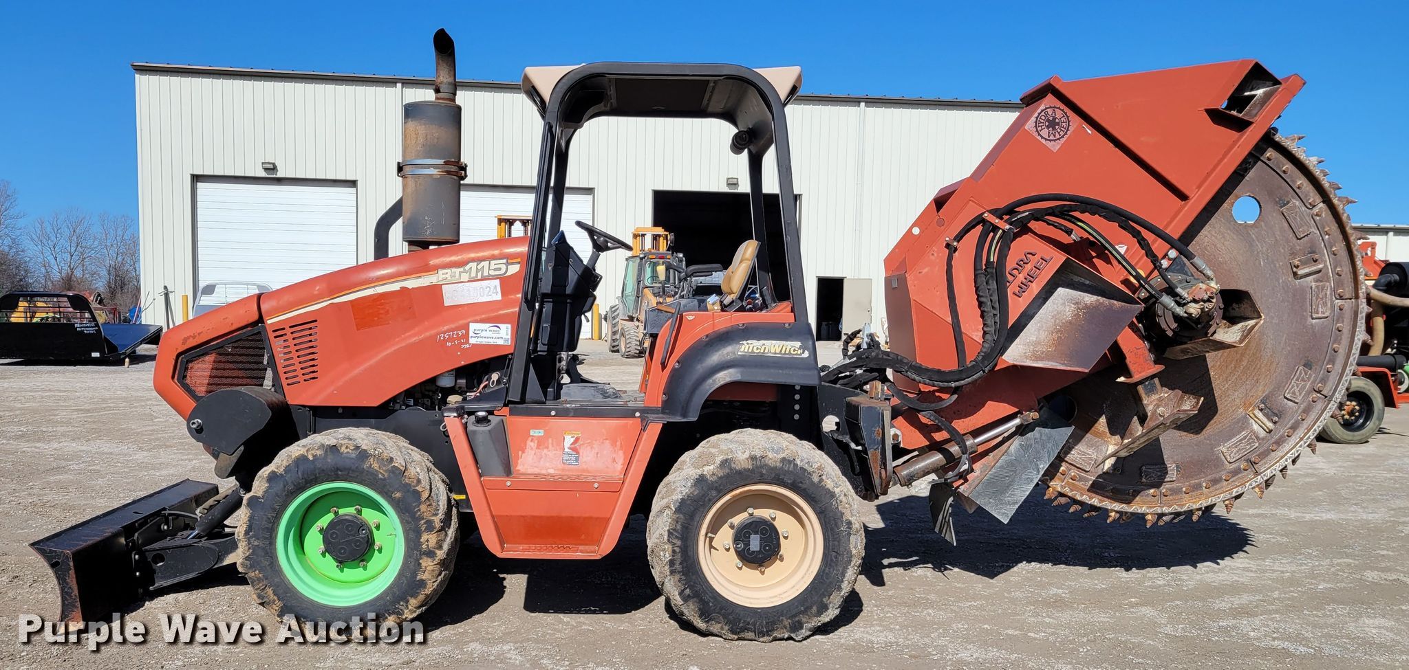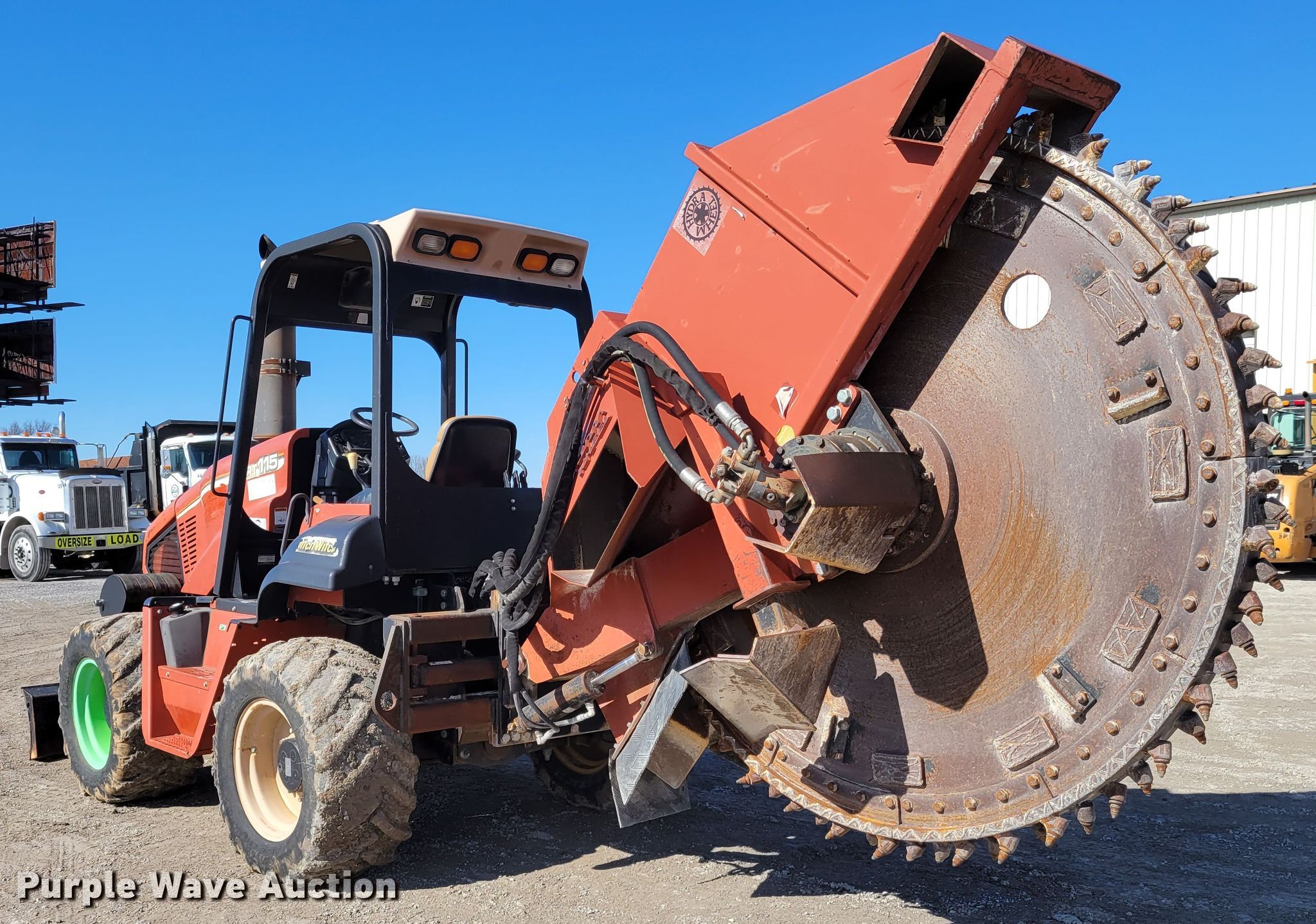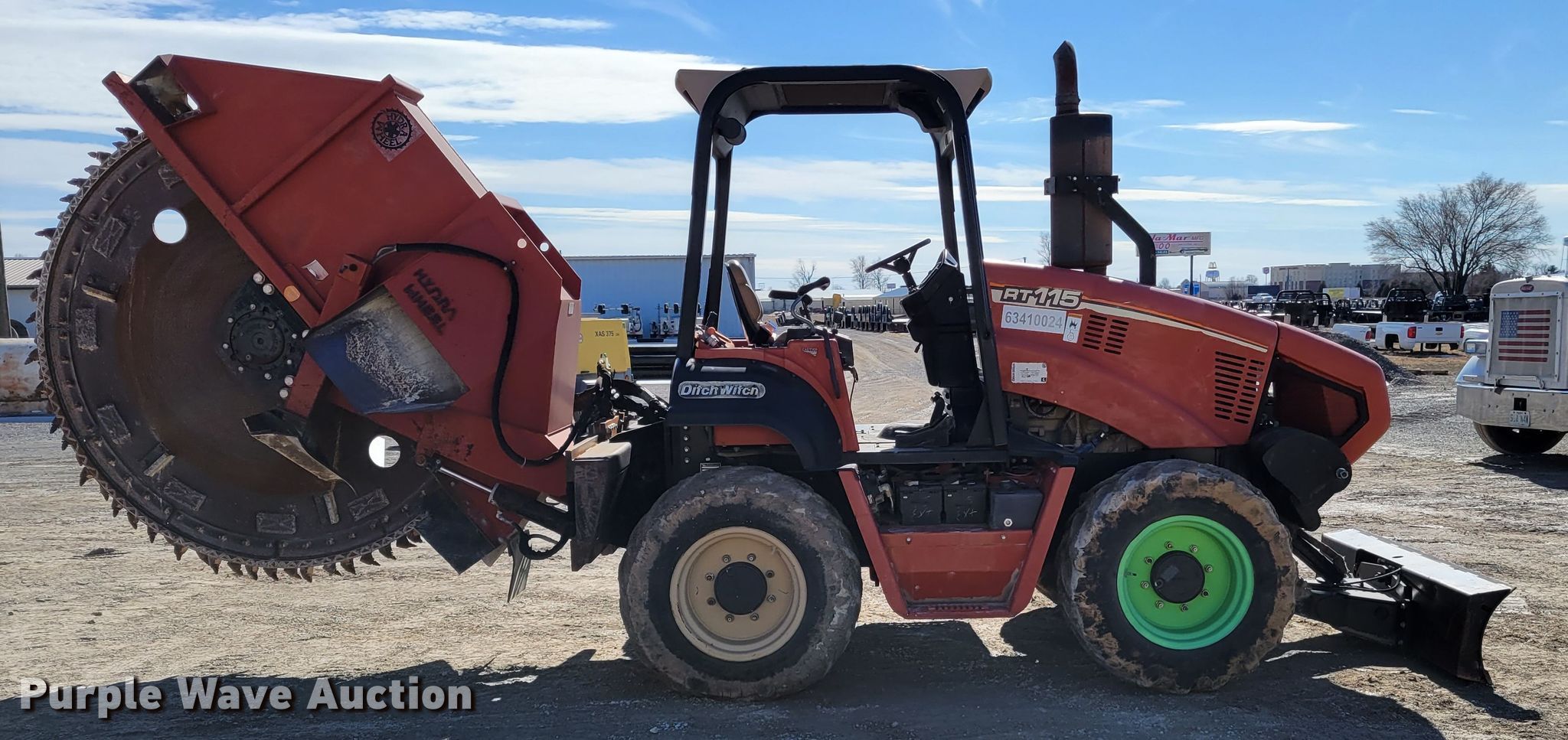 2006 Ditch Witch RT115 rock saw. Hours: 566 on meter, Unit #: 63410024. Engine John Deere 4045T, Cylinders: 4, Fuel type: Diesel, HP: 115. Transmission Hydrostatic, Two speed travel, Four wheel drive, Differential lock, Four wheel steer. Operators station Canopy, OROPS. Operational Rock wheel River City , Model: HD-1036B, Serial: 2853, Wheel diameter: 96", Cutting width: 5", Teeth: Rock, Side shift, Backfill blade Width: 72". Tires Size: 38x18-20. Floyd's Inc. - Open inspection Mar. 9. 225 N Interstate Dr. Sikeston, MO 63801
