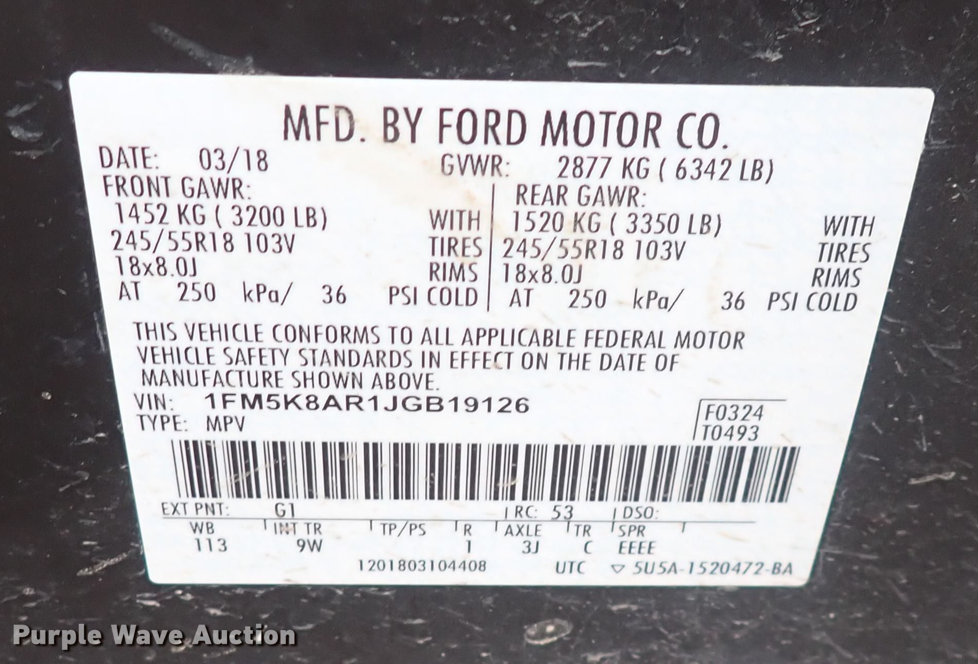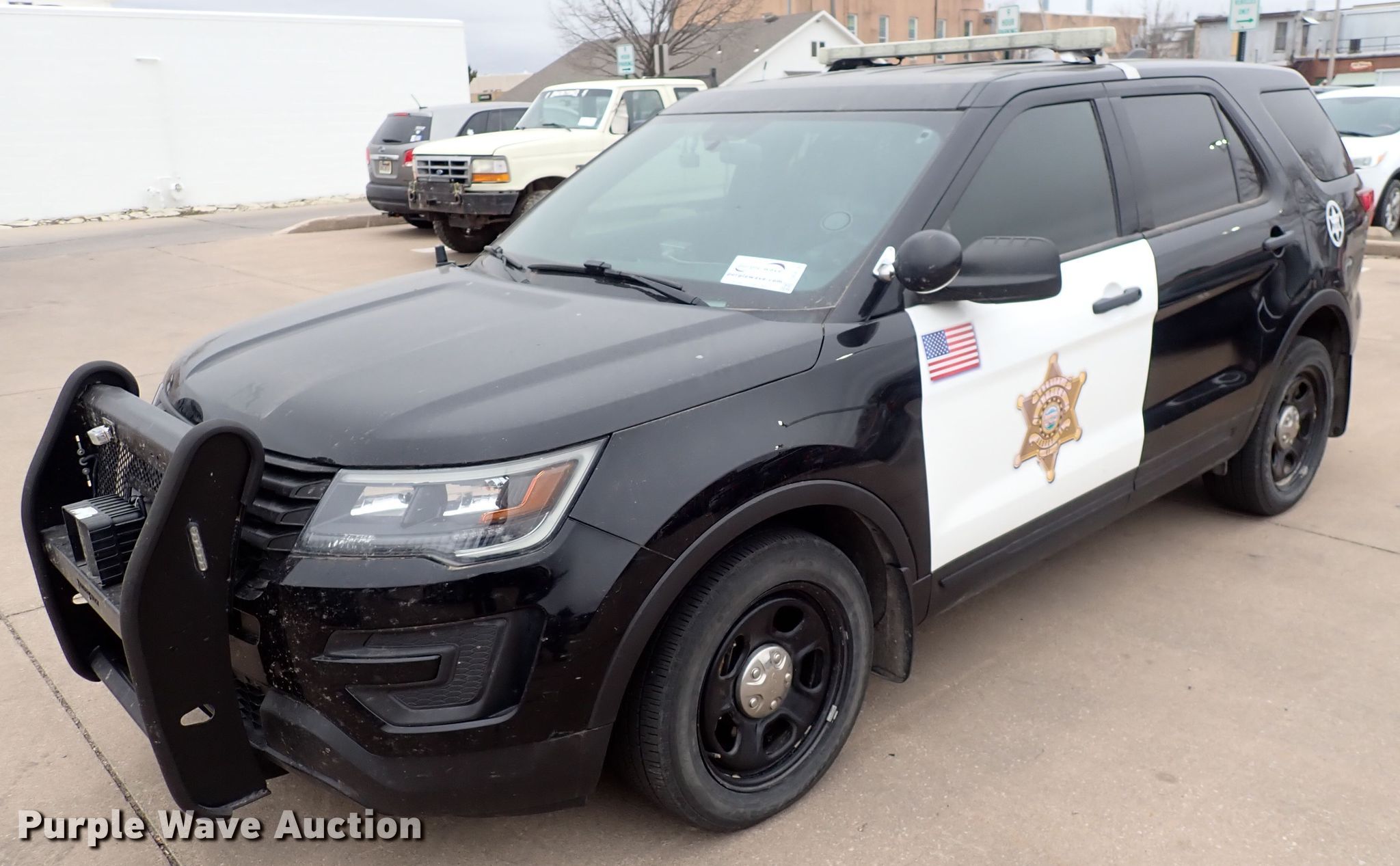 2018 Ford Explorer Police SUV. Miles: 100,934 on odometer, VIN: 1FM5K8AR1JGB19126. Engine Displacement: 3.7L V6 DOHC 24V, Cylinders: 6, Fuel type: Gas. Transmission Automatic, Four wheel drive. Interior AC, Heat, Power windows, Cruise control. Tires Size: 245/55R18. Notes Decals will be removed prior to auction. Kansas title. Law enforcement and emergency equipment will be removed prior to auction. Includes but not limited to police radio, spotlight, emergency lights and siren, firearm rack, and camera. Harvey County Sheriffs Office. Newton, KS 67114