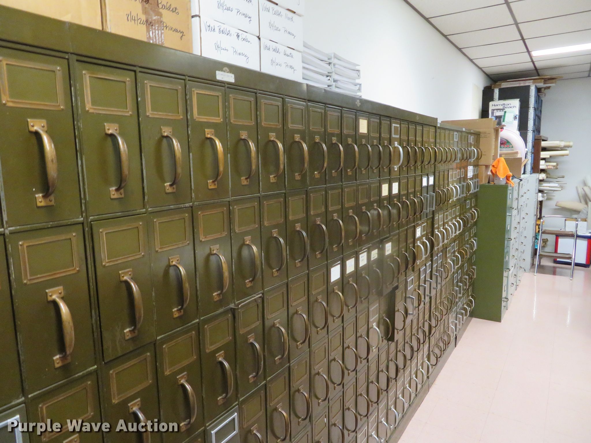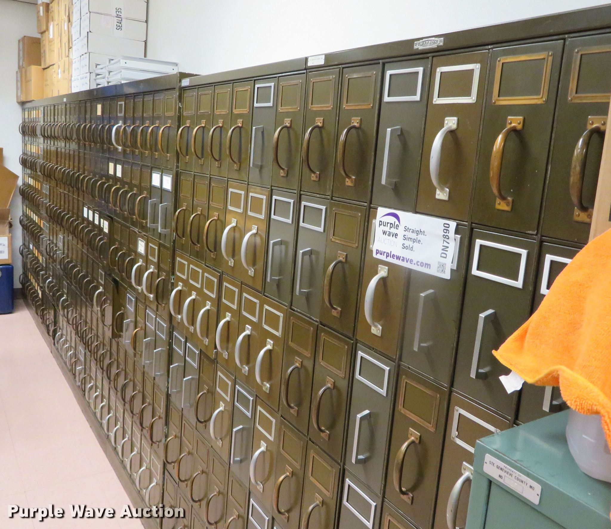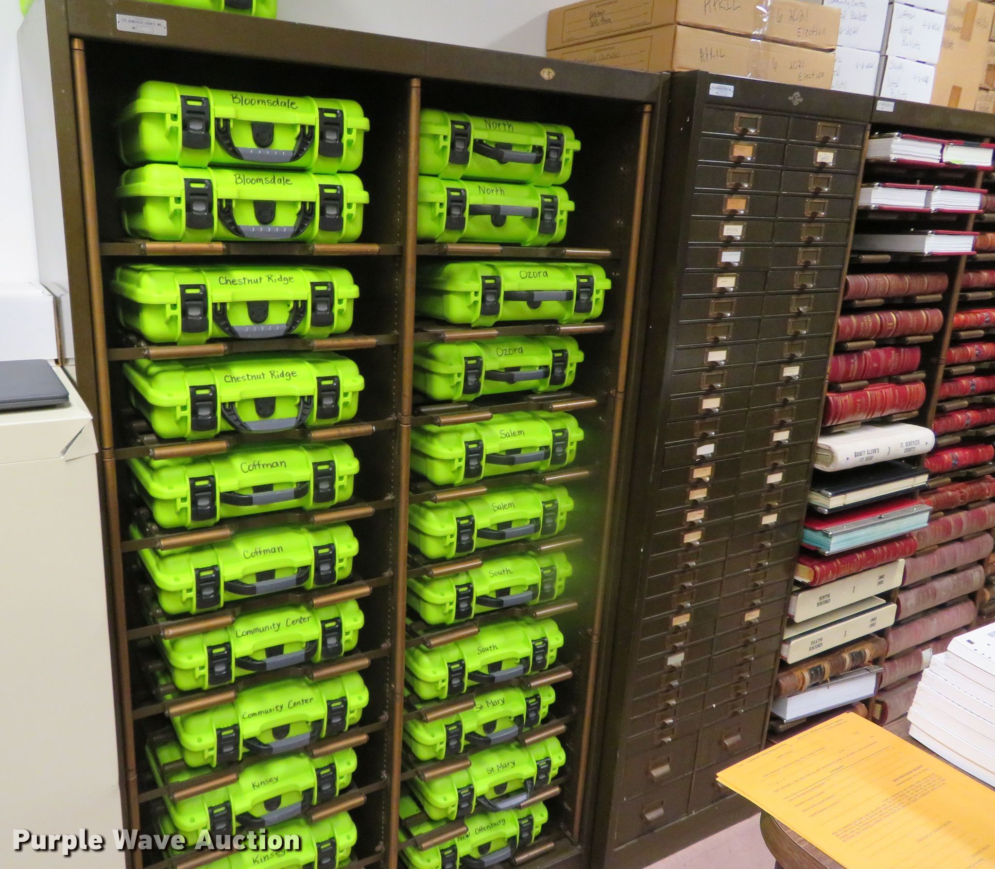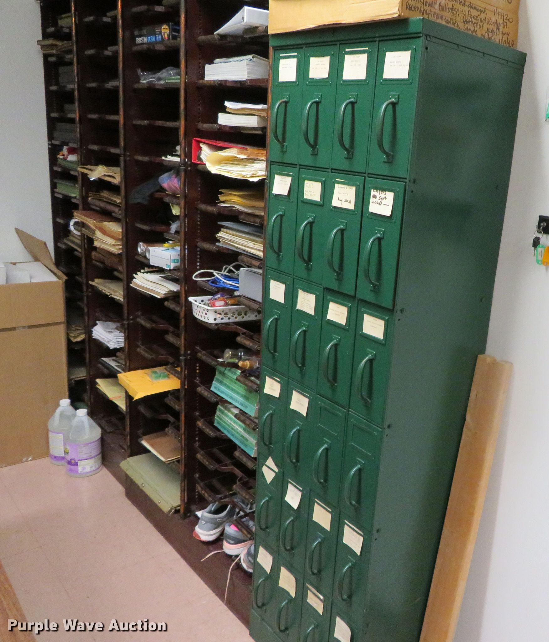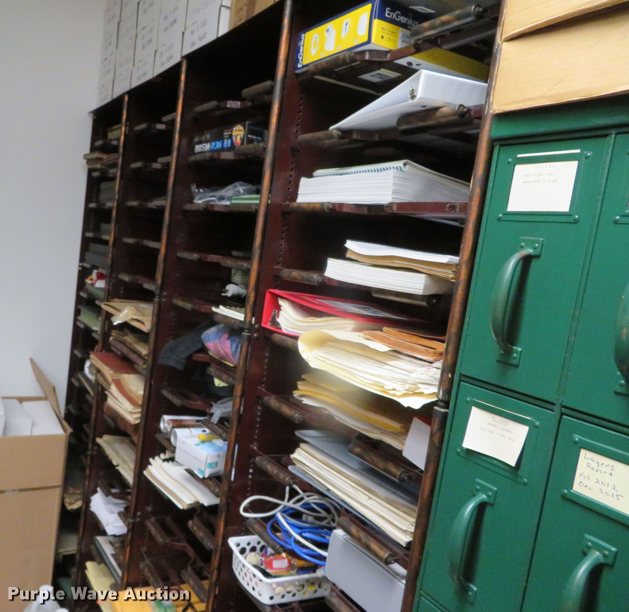 Purple Wave is selling a used Office Supplies and Equip. in Missouri. This item is a Cabinets with the following: (8) vertical, (2) 30 5/8"W x 14 1/2"D x 71 1/2"H, (5) 30 5/8"W x 14 5/8"D x 72 1/4"H, 20 1/2"W x 14 1/4"D x 71 1/2"H, (4) horizontal, 42 3/4"W x 14 1/2"D x 72 1/4"H, 21 1/2"W x 16 1/4"D x 72 1/4"H, (2) 41"W x 14 1/2"D x 83"H, Contents not included