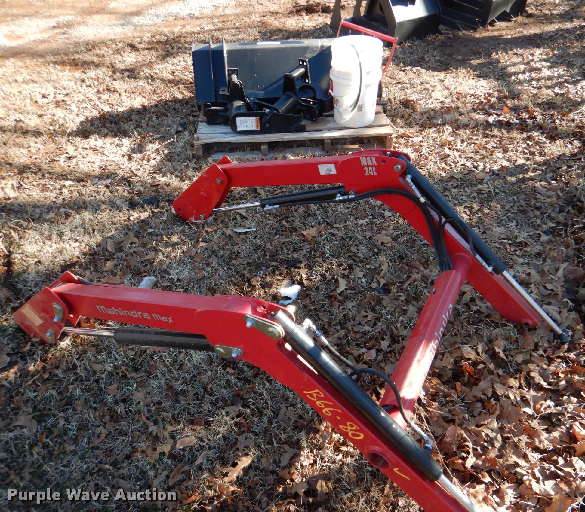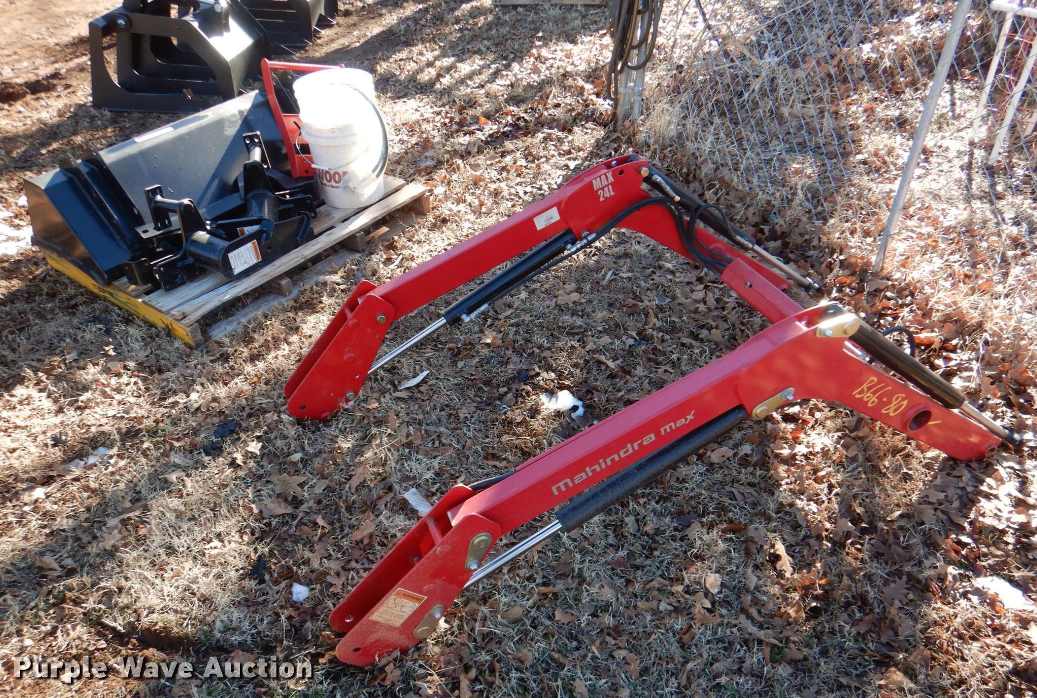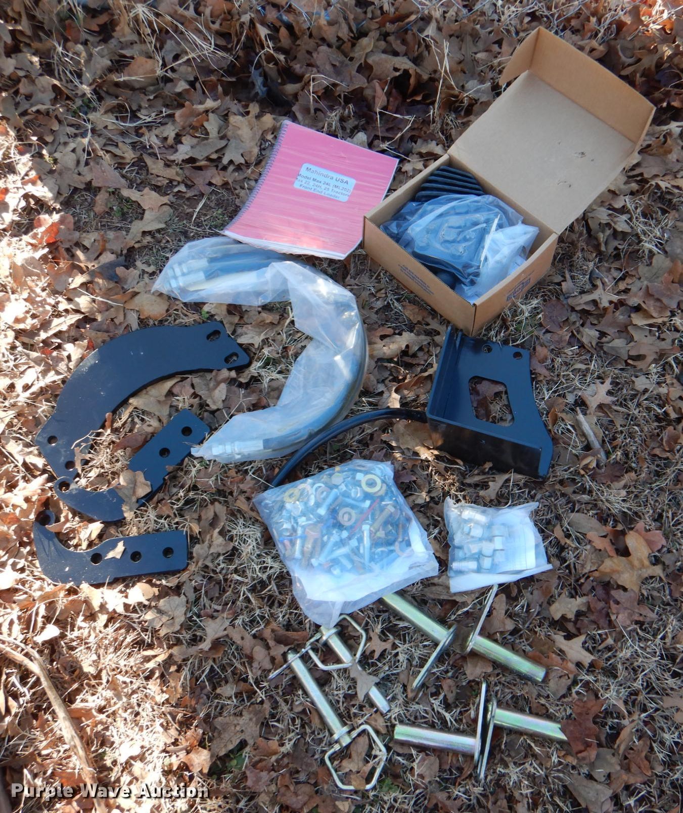 Purple Wave is selling a used Ag Tractor Loader or Attach. in Oklahoma. This item is a Mahindra Max 24L loader with the following: Serial: 1729104696, Controls: Joystick, Bucket, Width: 49", Mounting brackets