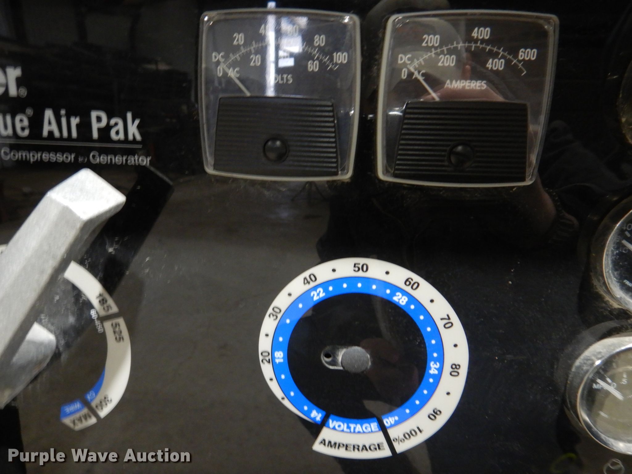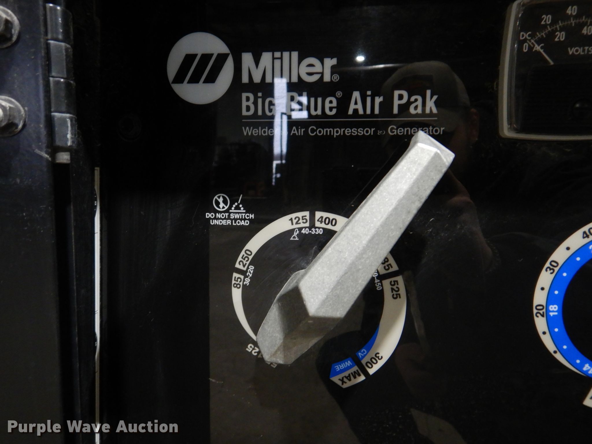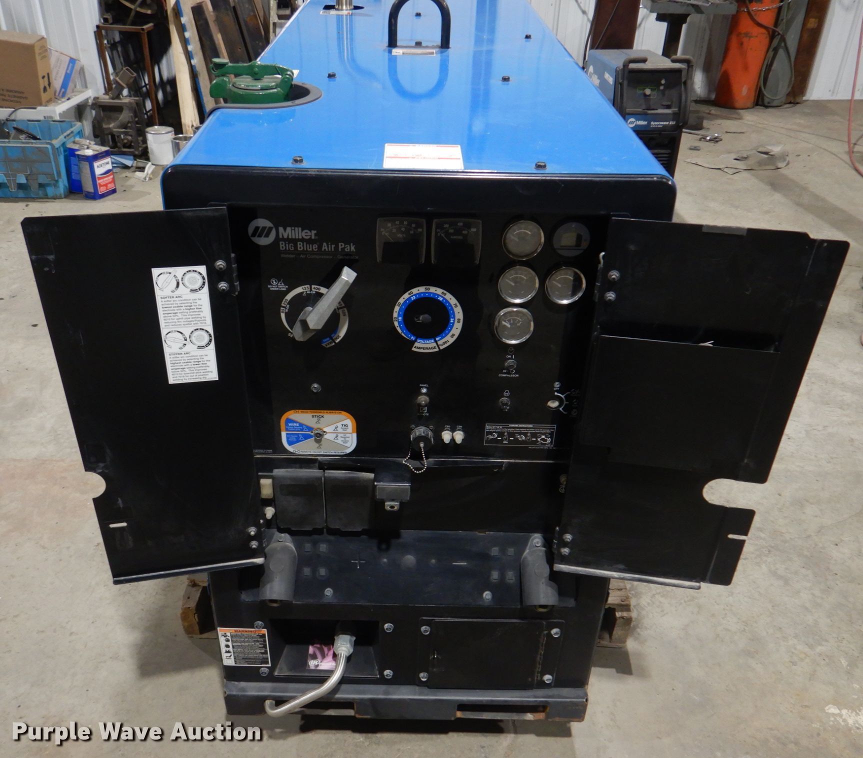 Miller Big Blue Air Pak welder/generator. Hours: 353 on meter, Serial: ME510015E. Engine Deutz TD2011L04, Cylinders: 4, Fuel type: Diesel. Operational Generator Watts: 4,000, Electric start, Fuel tank, Skid mounted, Air compressor Ingersoll Rand, CFM: 60, PSI: 100, Welder Capabilities: AC, DC, Mig, Tig, Stick, JetPak air drying & filtration system. Kohlhauer Welding. 2013 SW Hwy 33. Maysville, MO 64469
