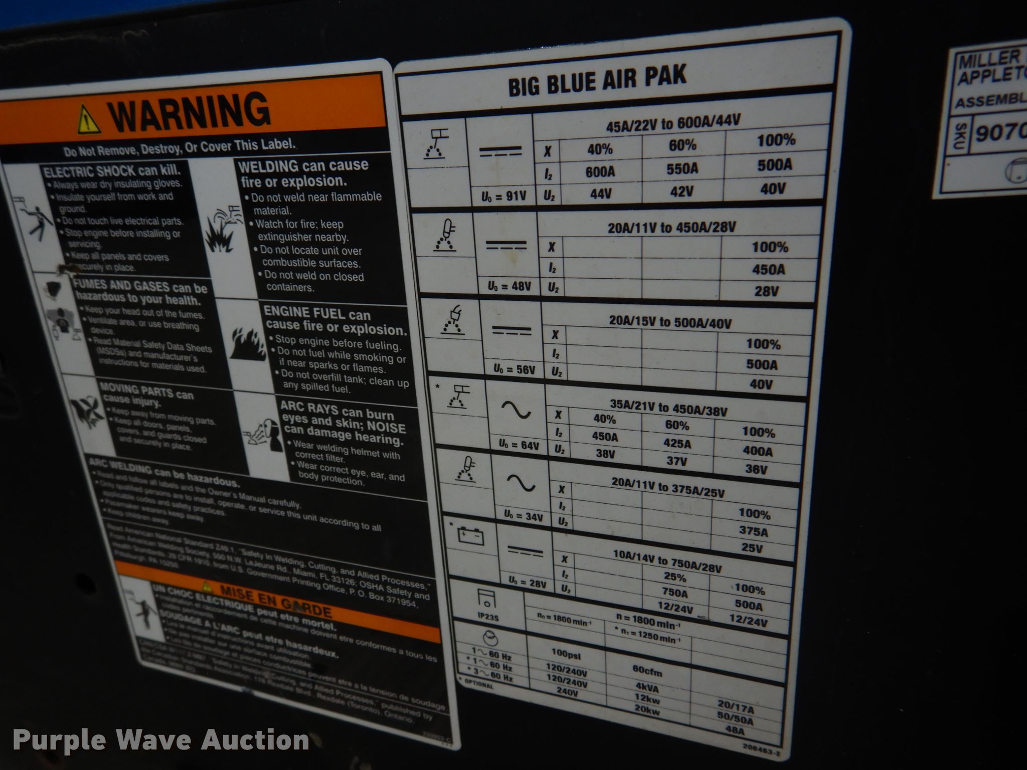 Purple Wave is selling a used Generator Set in Missouri. This item is a Miller Big Blue Air Pak welder/generator with the following: Hours: 353 on meter, Serial: ME510015E
