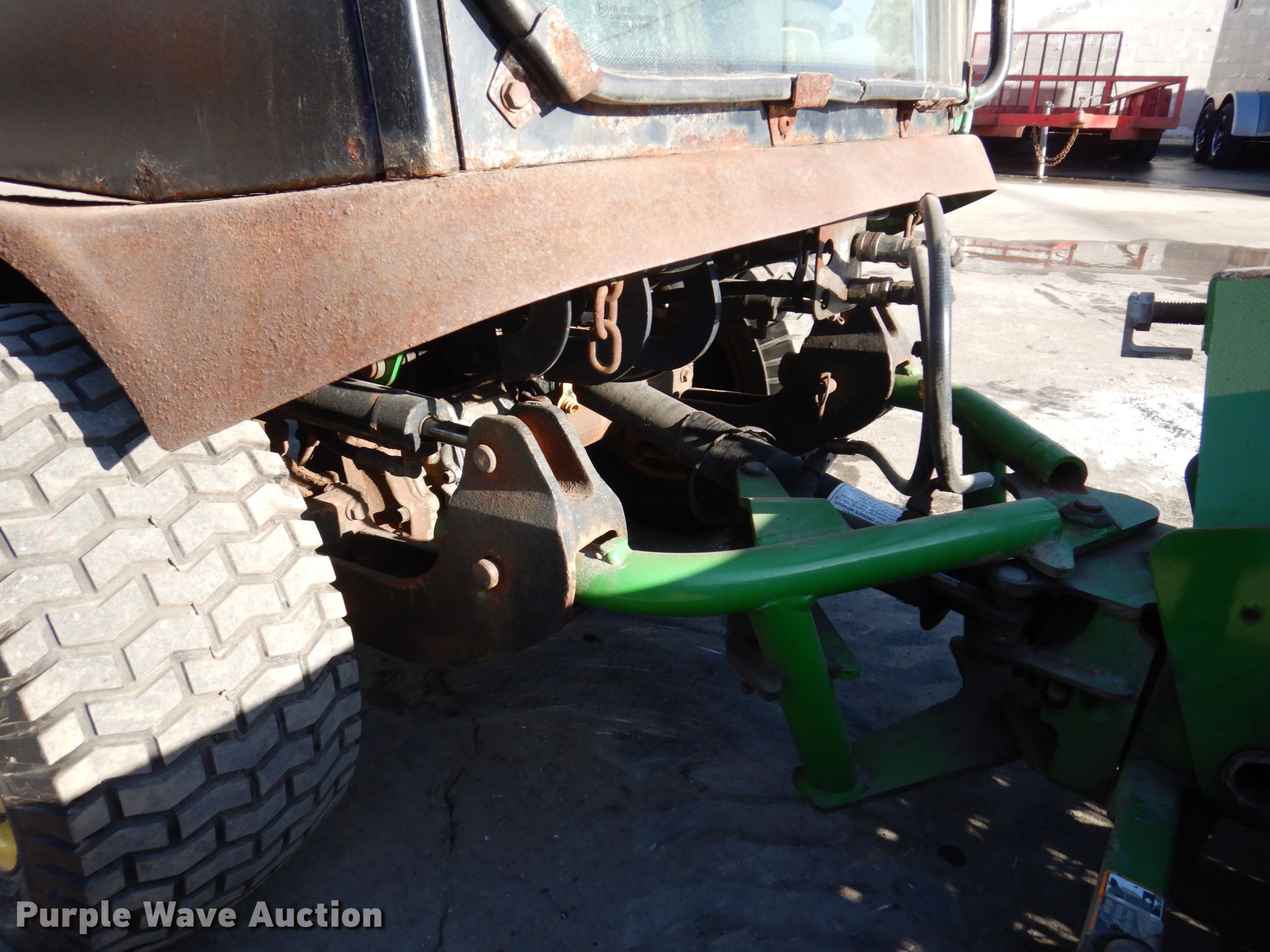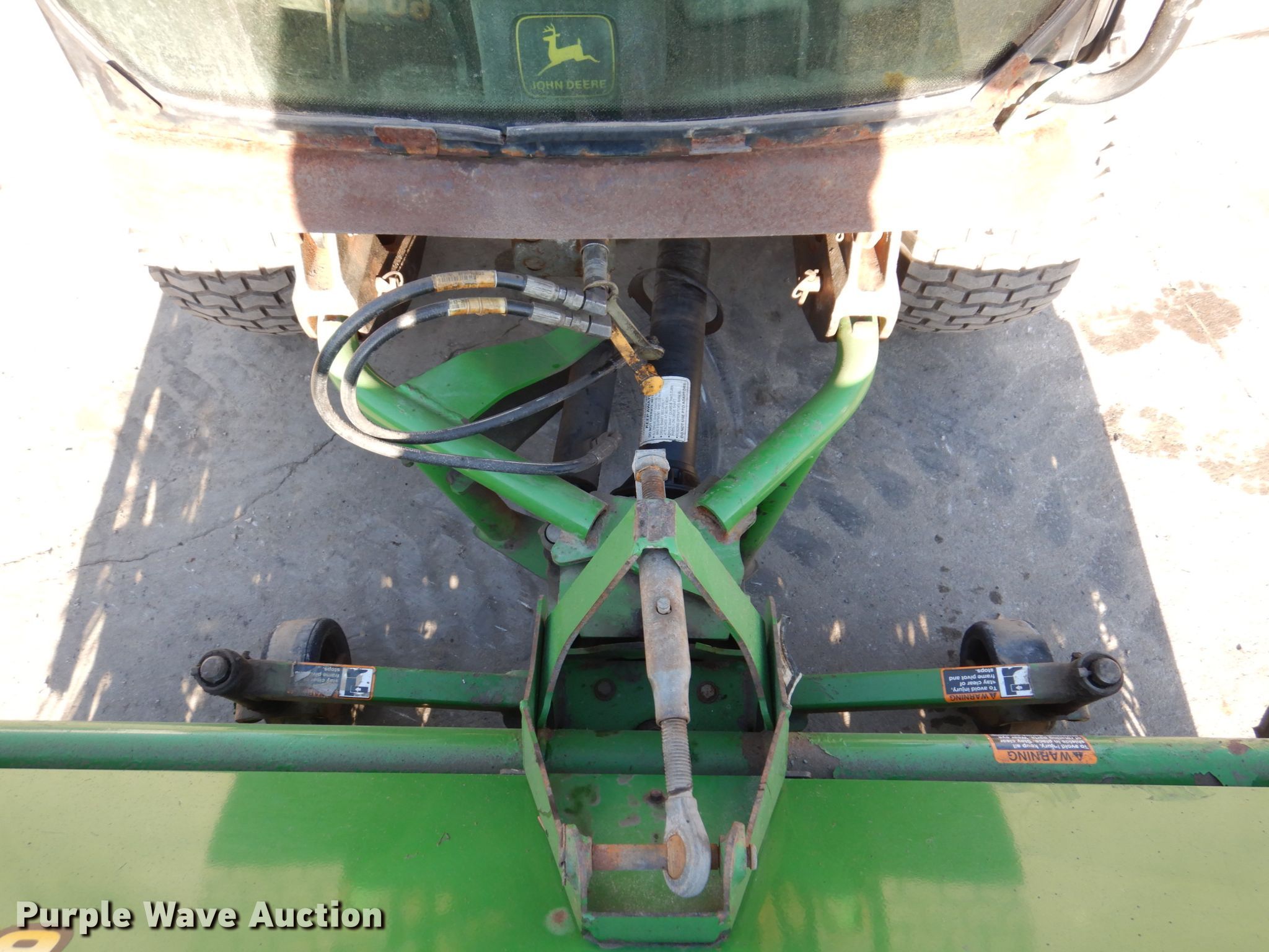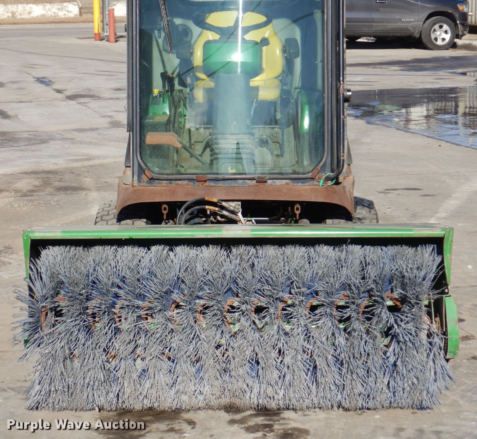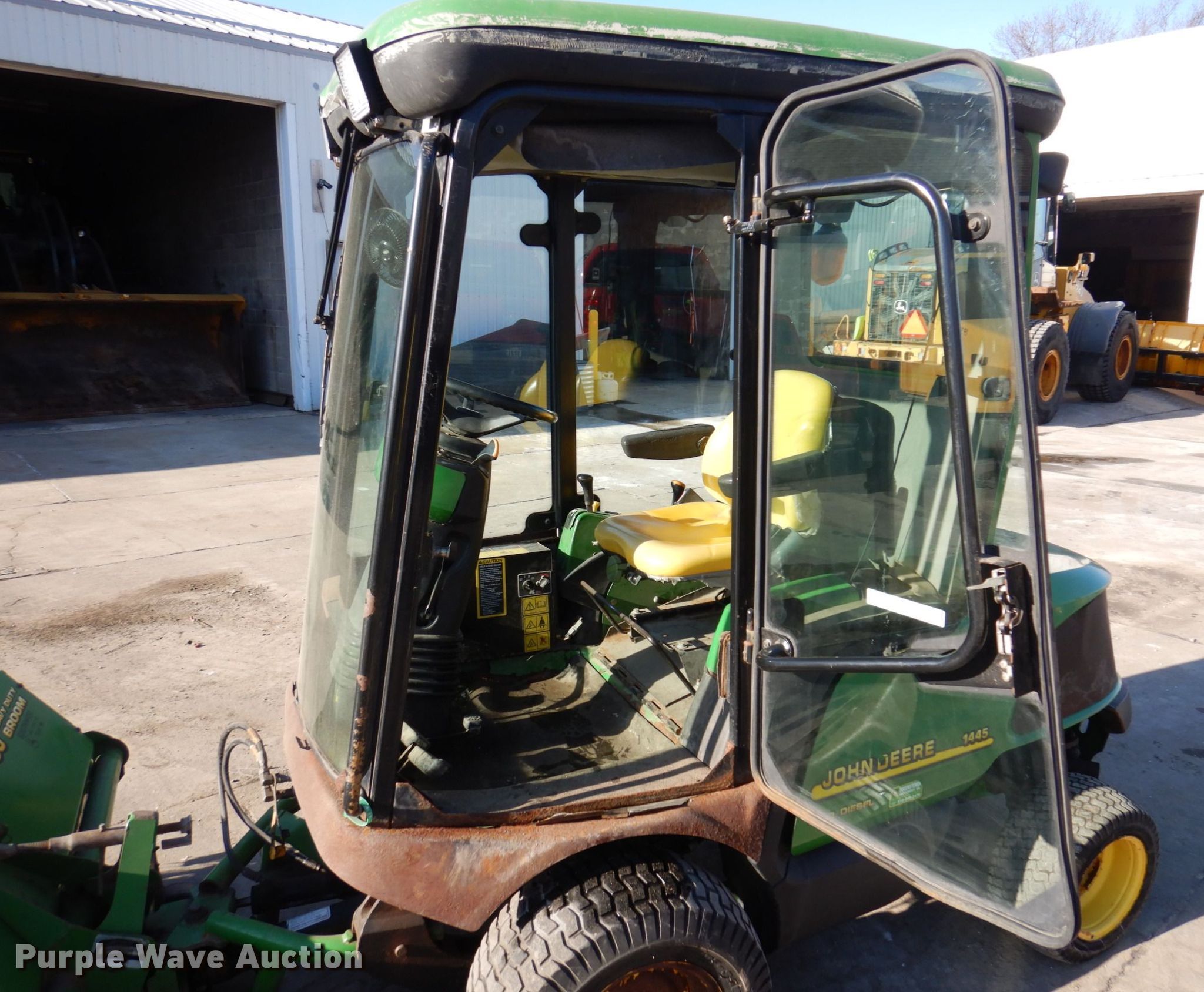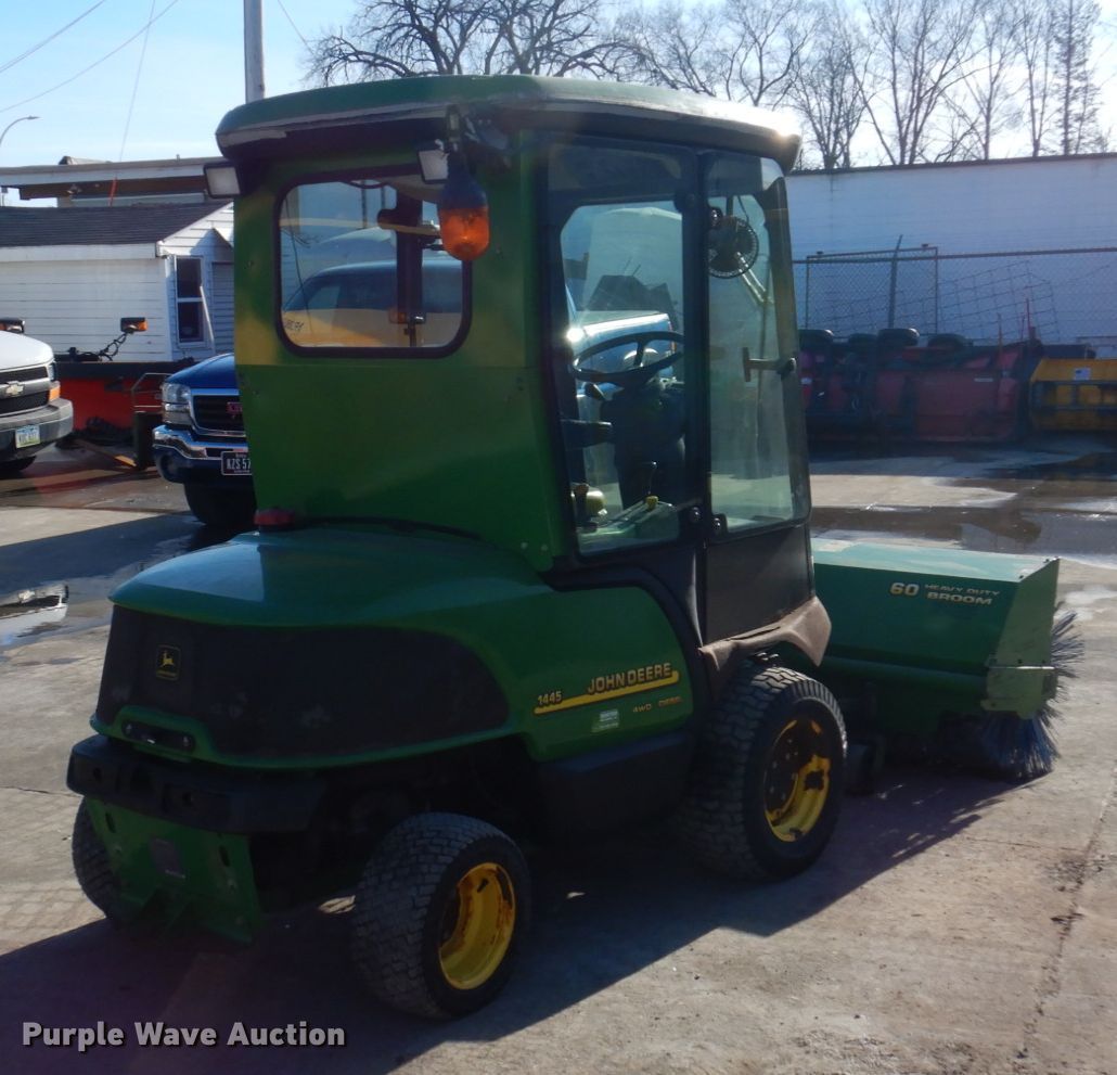 John Deere 1445 lawn mower. Hours: 3,083 on meter, Serial: TC1445D01057. Engine Yanmar 3TNE78A-EJMA, Displacement: 1.204L, Cylinders: 3, Fuel type: Diesel. Transmission Hydrostatic. Chassis Four wheel drive, PTO. Operators station Enclosed cab, Heat. Operational Rear drawbar, Mower deck Width: 72", John Deere 7 Iron, Broom Width: 60", Hydraulic front deck lift. Tires Front: 23x10.5-12, Rear: 18x8-10. Roeder Snow Removal. 1918 Commercial St. Waterloo, IA 50702