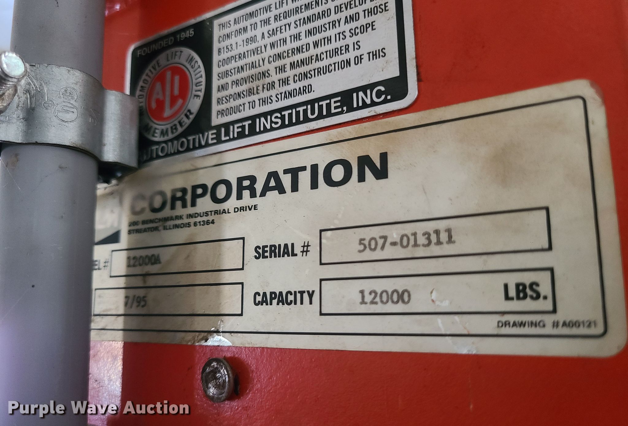 Purple Wave is selling a used Tools in Missouri. This item is a ALM 12000A four post automotive lift with the following: Serial: 507-01311, Capacity: 12,000 lbs