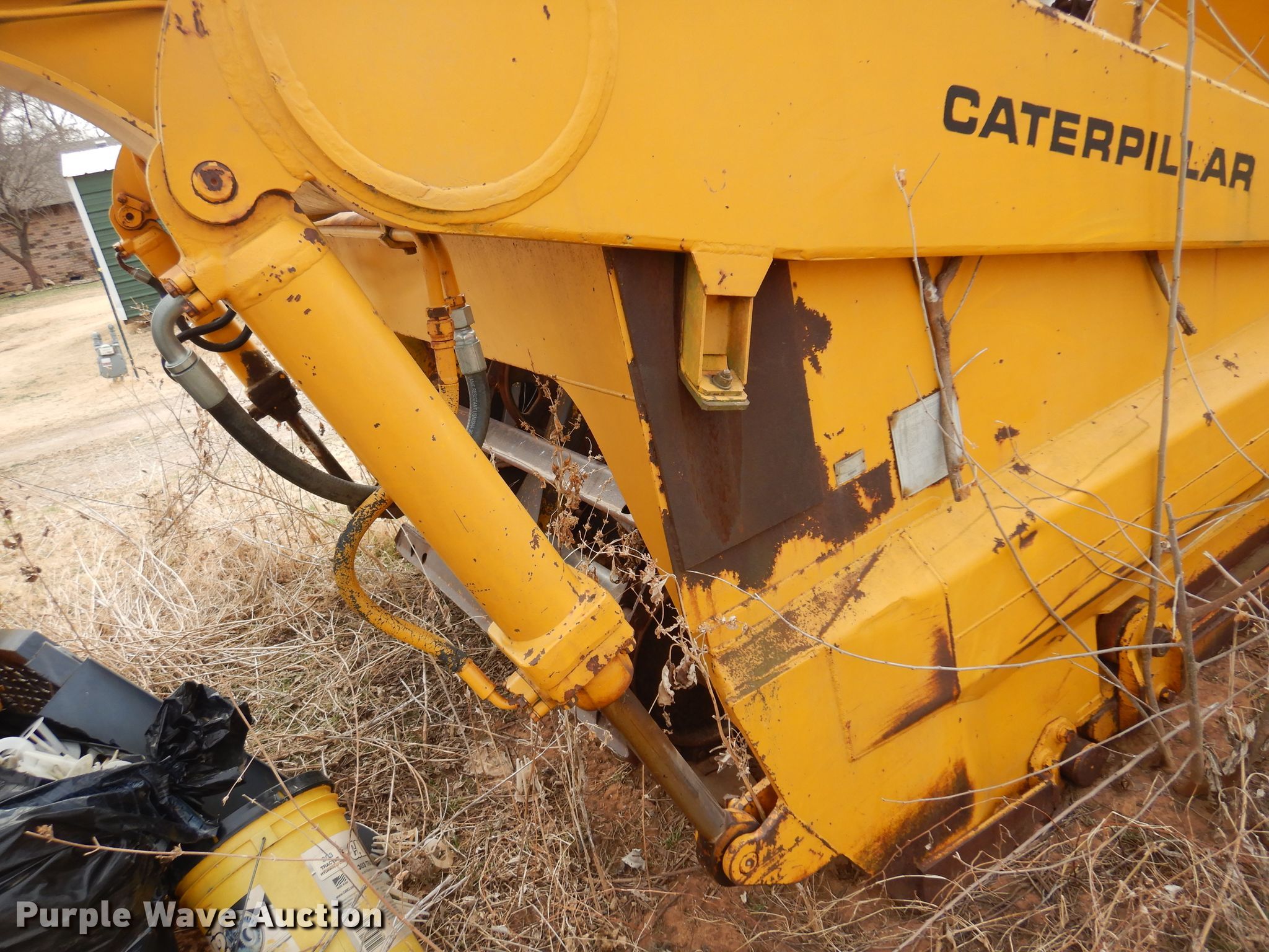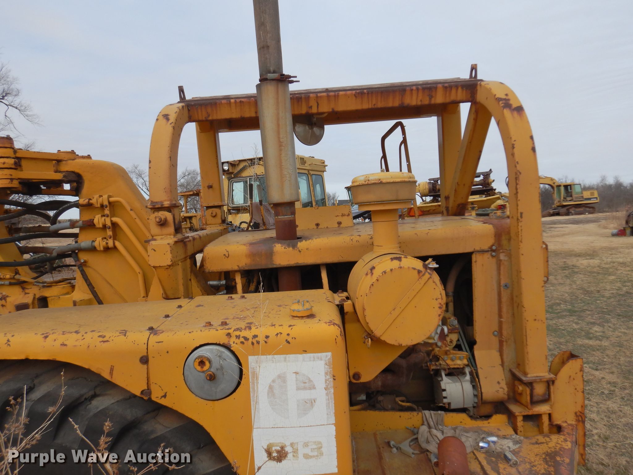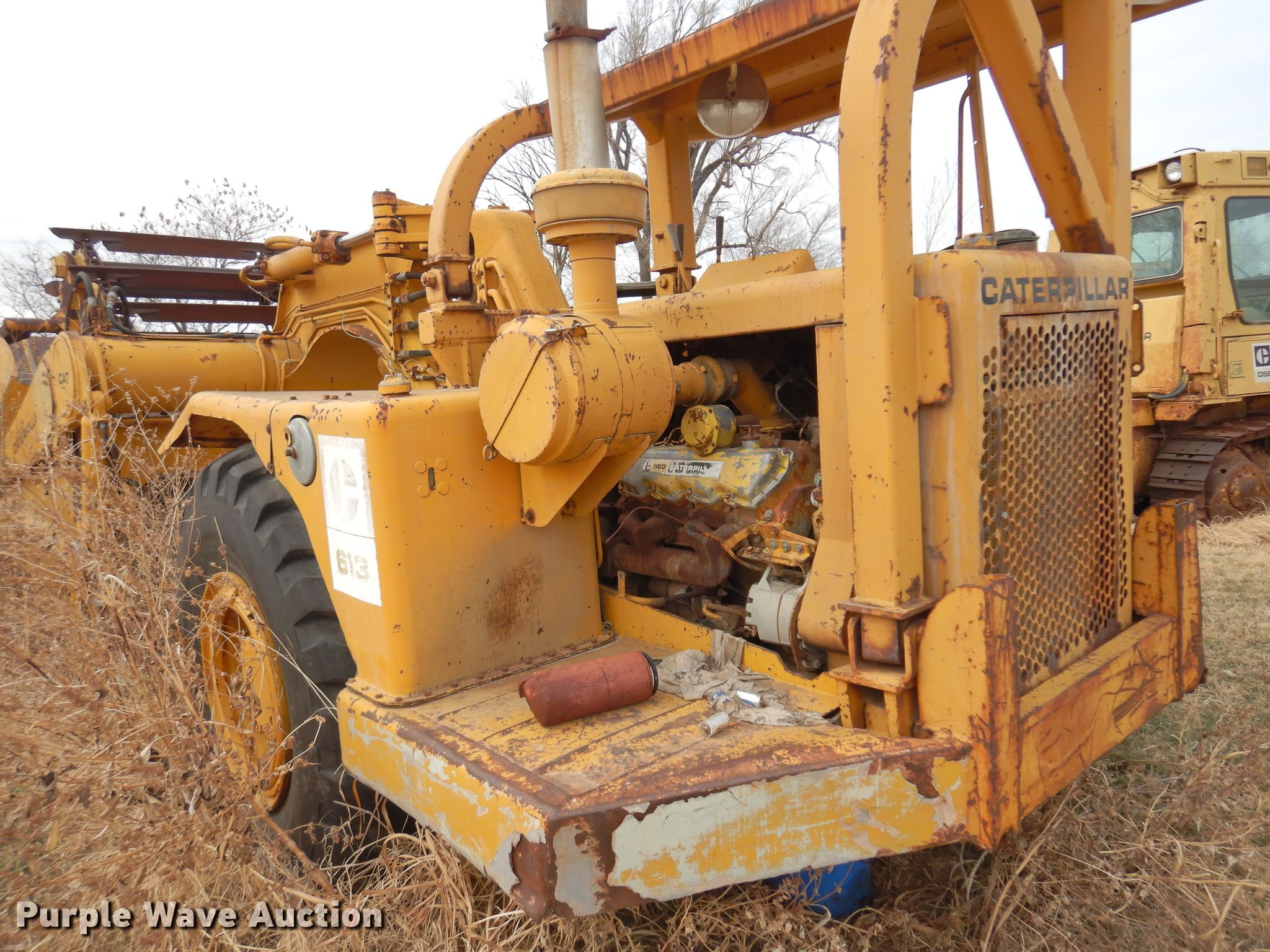 1972 Caterpillar 613 elevating scraper. Hours: Unknown, Serial: 71M1516. Engine Cylinders: 8, Fuel type: Diesel. Transmission Powershift, 4F - 2R. Chassis Brakes: Hydraulic. Operators station OROPS. Operational Elevator reverse, Hydraulic lift, Scraper controls: Lever controls No. of controls: 3. Tires Size: 23.5-25. Notes Water in oil, Dead battery, Unknown operating condition. Tim Betchan Dozer Service. Pond Creek, OK 73766