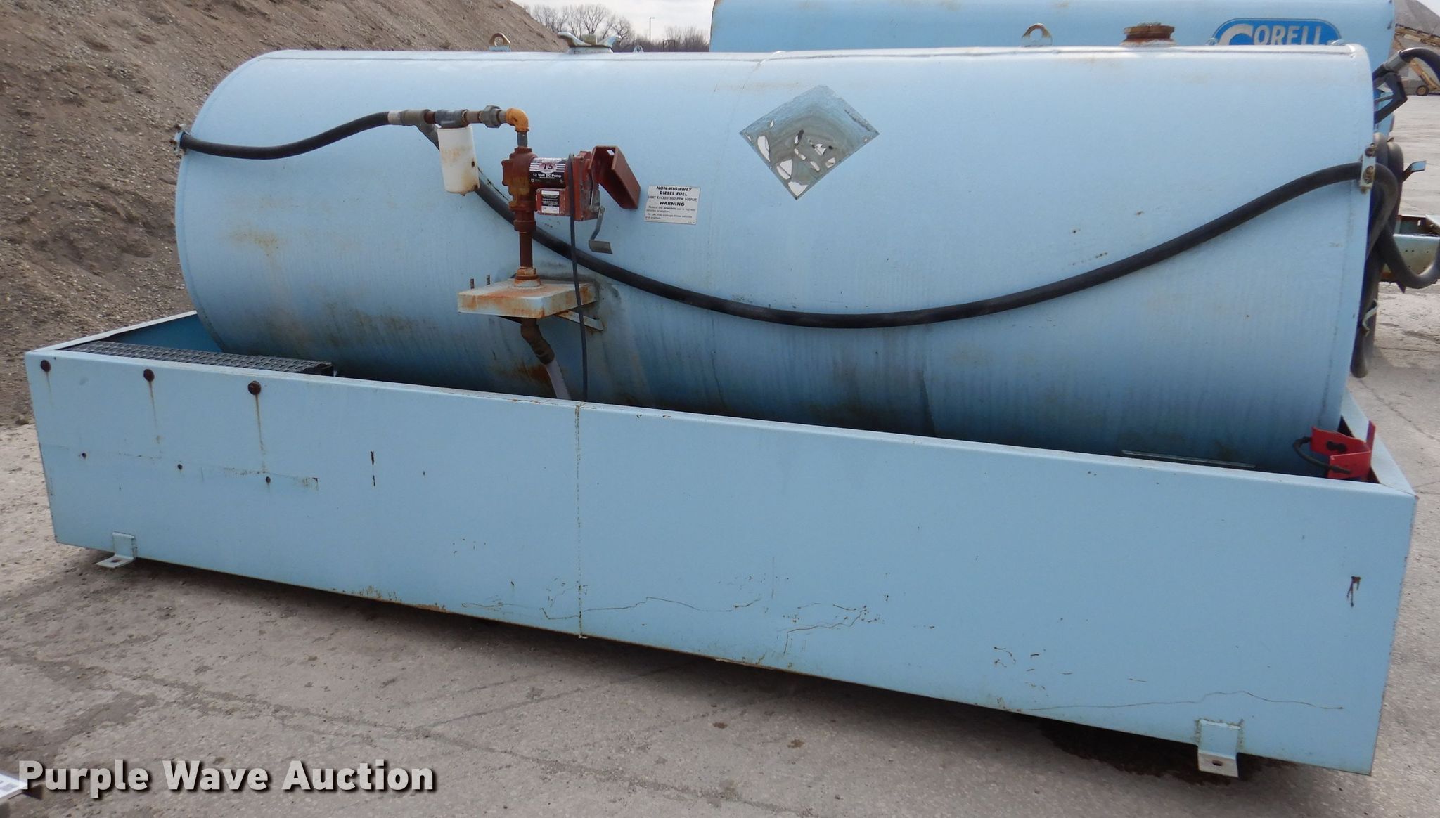 Fuel containment. 12' x 68" x 24" H, Fuel tank 11' x 48", Fill-Rite FR1200C pump 15 GPM , Volts: 12, (2) hoses. Corell Contractor Inc. 1300 Lincoln St. West Des Moines, IA 50265