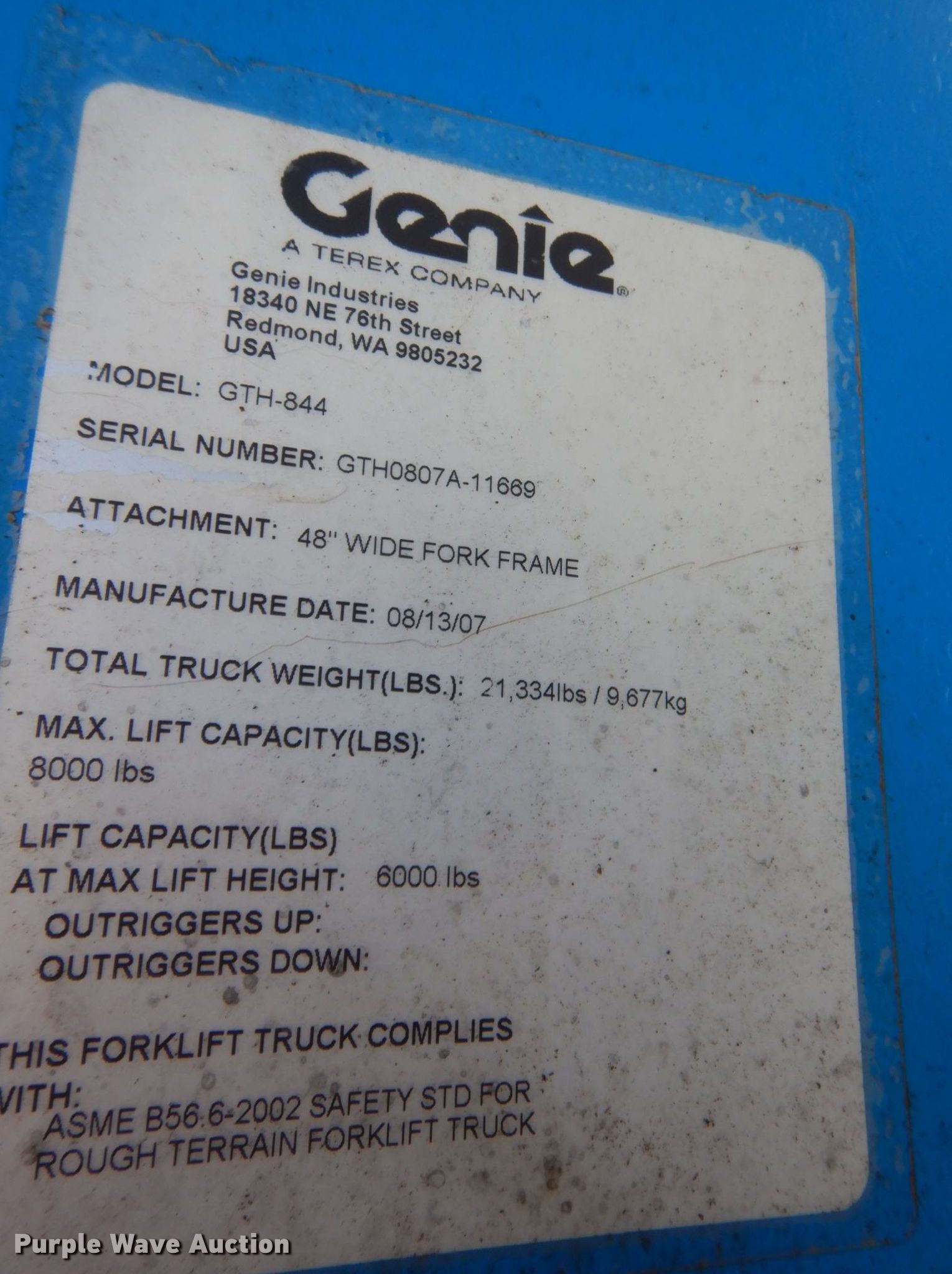 Purple Wave is selling a used Telehandler in Colorado. This item is a 2007 Genie GTH-844 telehandler with the following: Hours: 6,035 on meter, Serial: GTH0807A-11669