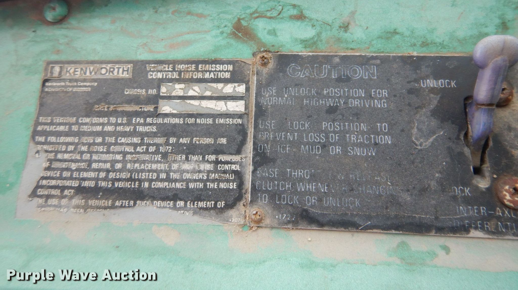 1981 Kenworth W900A winch truck. Miles: 664,457 on odometer, VIN: 1NKWL20X0BS191242, Unit #: L0178. Engine Cummins, Cylinders: 6, Fuel type: Diesel. Transmission Manual, Auxiliary transmission Dana Spicer 1241, Speeds: 4. Chassis Axles: Tandem, Suspension: Spring over walking beam, Brakes: Air. Operational 21' L x 8' W, Winch, Rolling tailboard, Gin pole length: 20'. Tires Front: 425/65R22.5, Rear: 12R24.5. Wyoming title. Liberty Lift Solutions, LLC. 1014 Robertson Rd. Casper, WY 82604