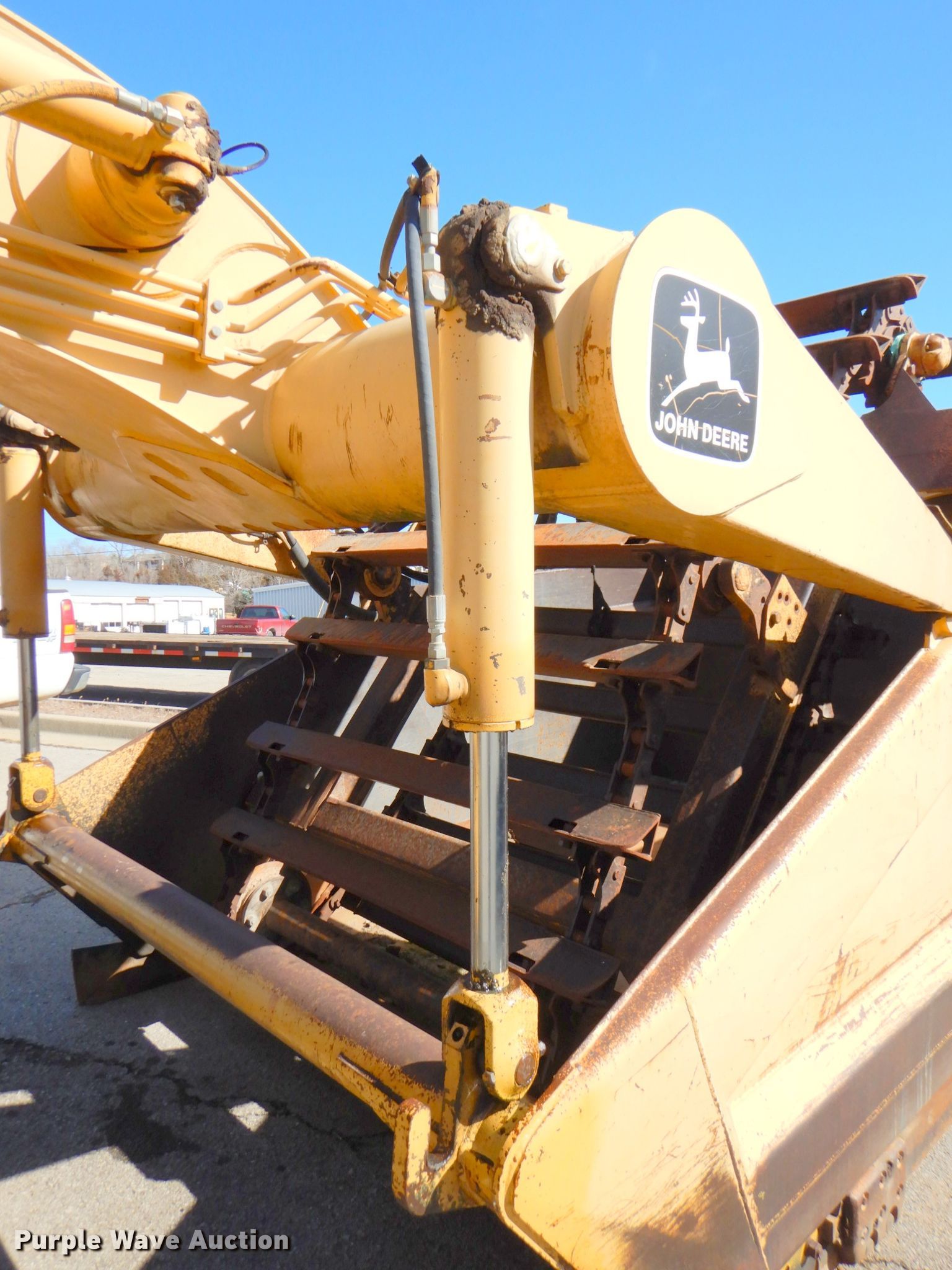 1996 John Deere 762B II elevating scraper. Hours: 7,038 on meter, Serial: T0762BX818968. Engine John Deere 6081, Displacement: 8.1L, Cylinders: 6, Fuel type: Diesel. Transmission Powershift, 6F - 1R. Chassis Brakes: Hydraulic. Operators station Enclosed cab AC, Heat. Operational Bowl capacity: 11.6 cu.yd., Reversible cutting edge, Elevator reverse, Hydraulic lift, Scraper controls: Lever controls No. of controls: 3. Tires Size: 23.5R25. Notes Lift cylinders leak. Max Rieke & Brothers Inc... 15400 Midland Dr. Shawnee, KS 66217