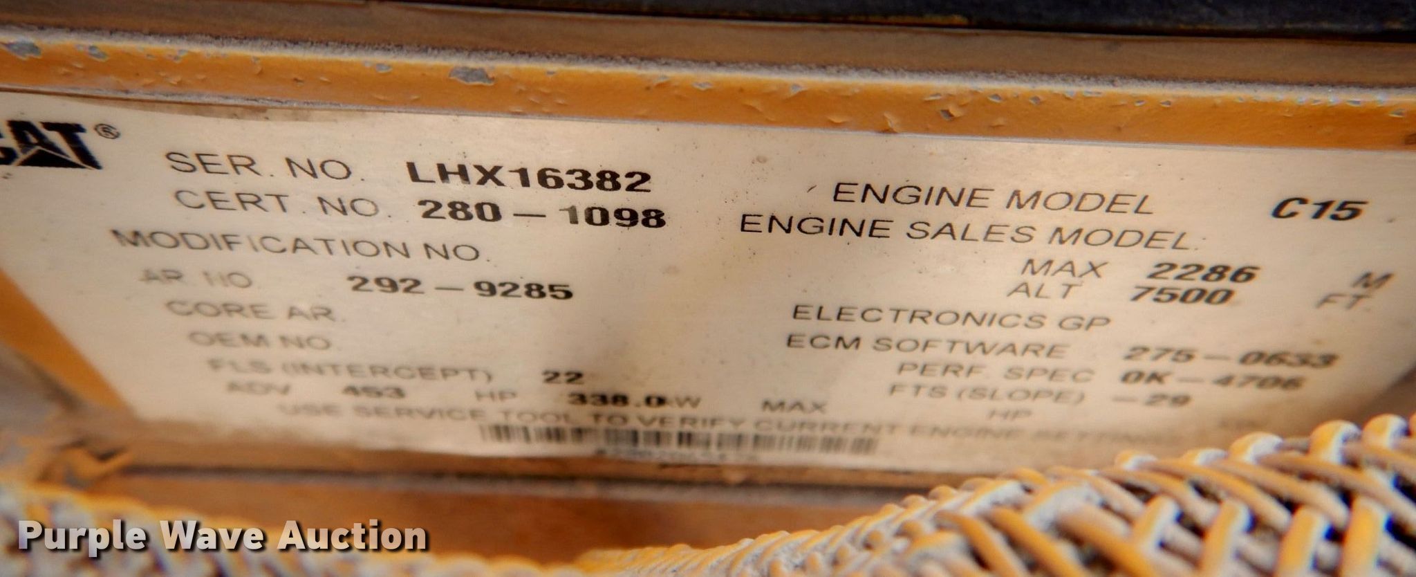 2008 Caterpillar 740 haul truck. Hours: 15,300 on meter, Serial: CAT00740VB1P03294. Engine Caterpillar C15, Serial: LHX16382, Cylinders: 6, Fuel type: Diesel, HP: 453. Transmission Caterpillar, Automatic. Chassis Six wheel drive. Interior AC, Heat, Retarder. Operational Dump bed Caterpillar, Capacity: 40 tons, Bed heater. Tires Size: 29.5R25. Kings Construction Company. 10241 US 59 Hwy. Oskaloosa, KS 66066