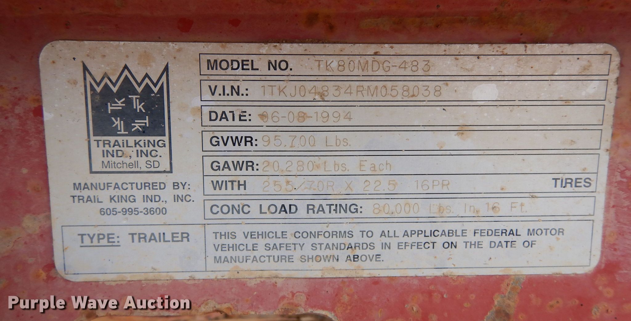 Purple Wave is selling a used Equip. Trailer in Colorado. This item is a 1994 Trail King TK80MDG483 lowboy equipment trailer with the following: VIN: 1TKJ04834RM058038
