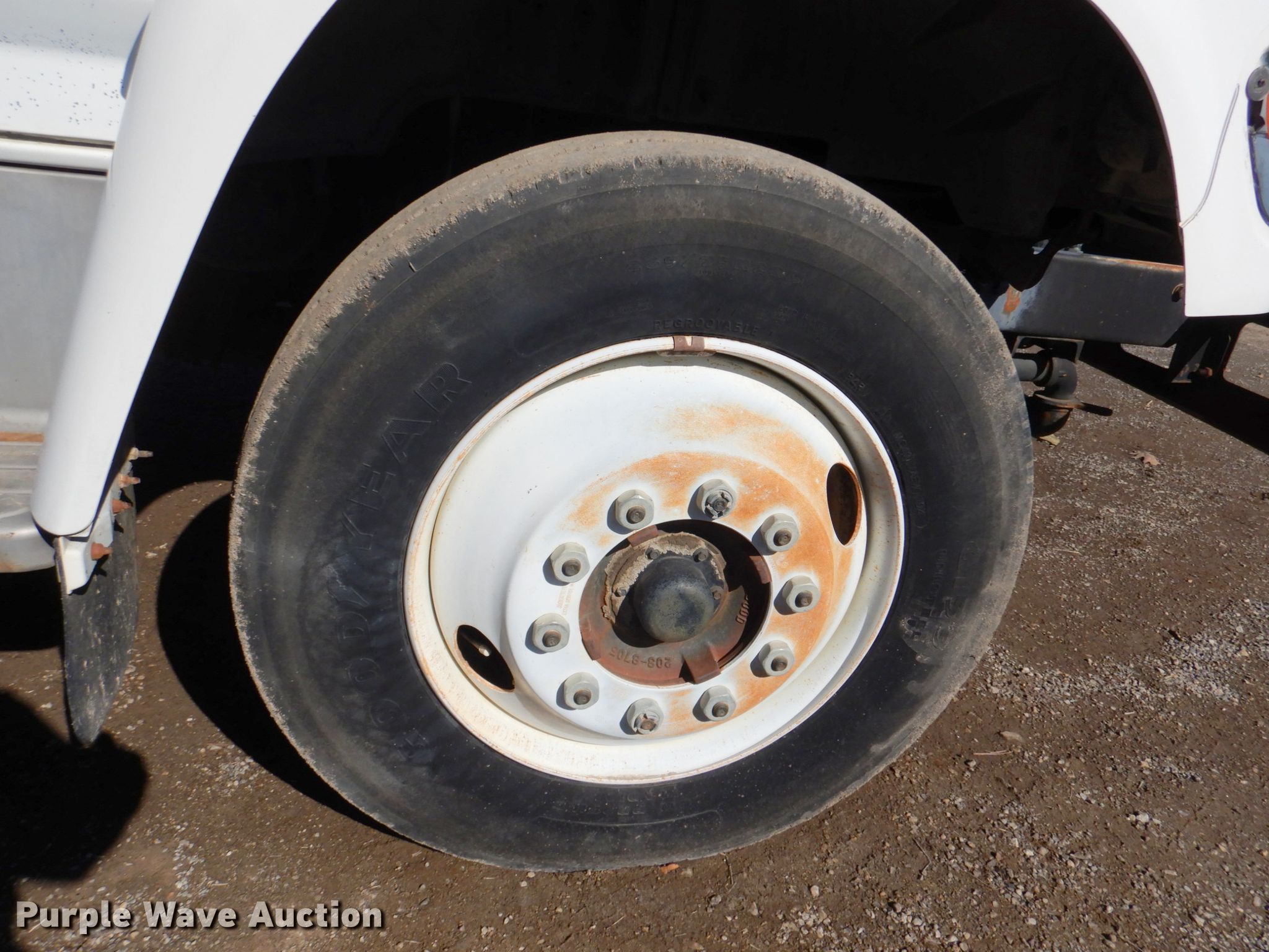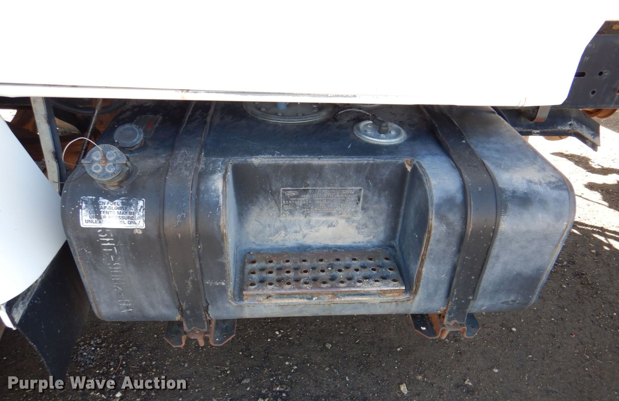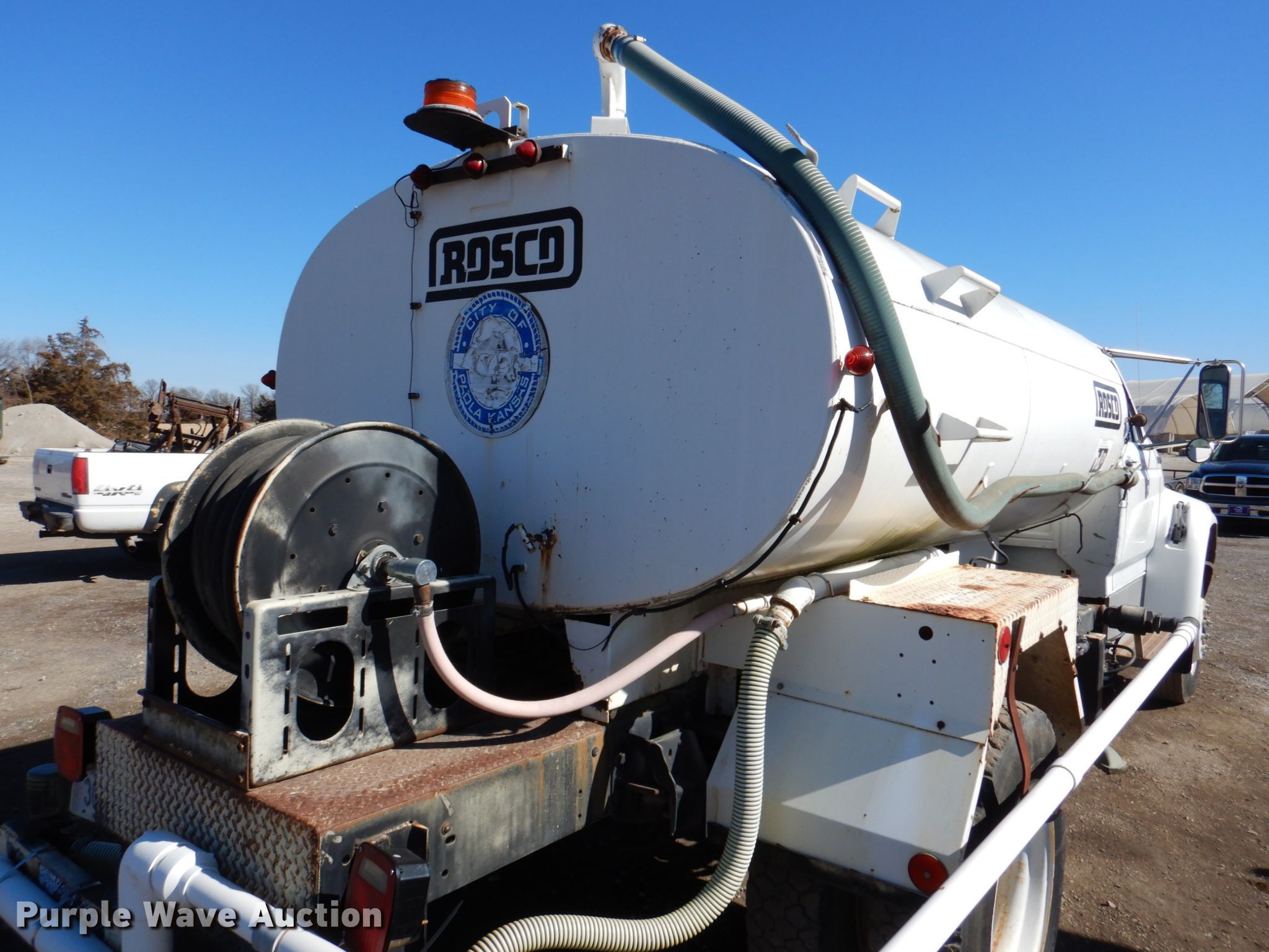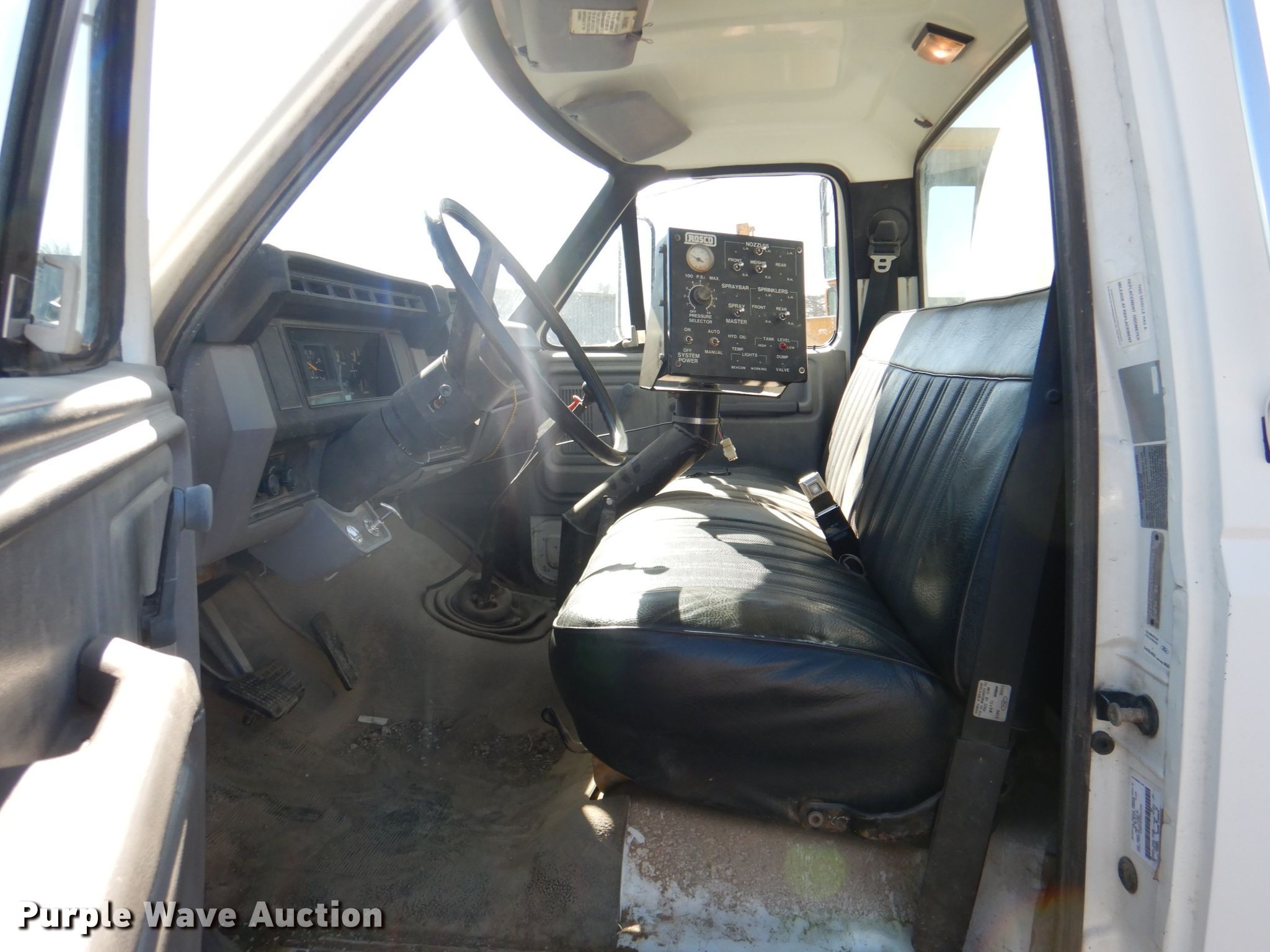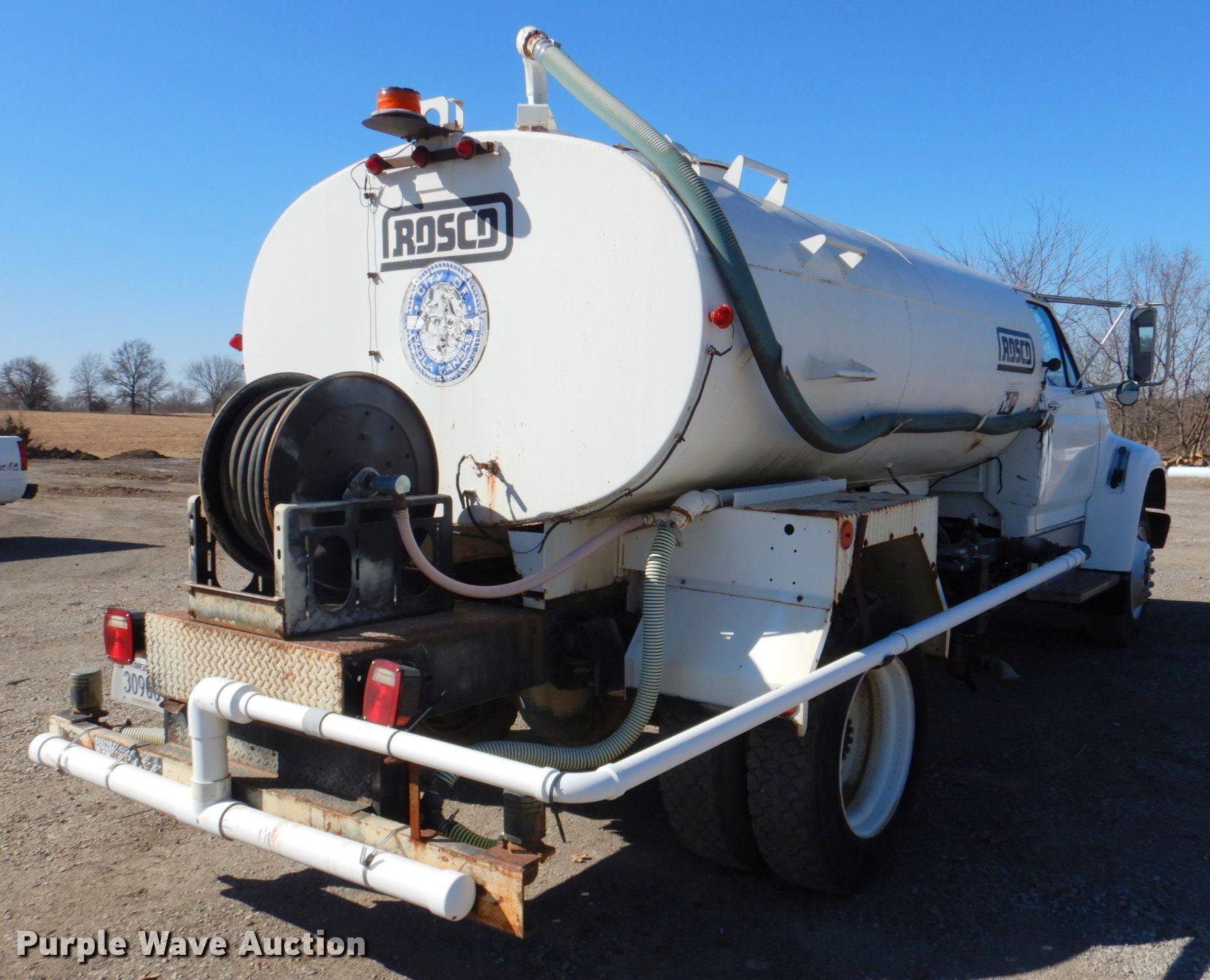 1995 Ford F700 water truck. Miles: 3,665 on odometer, VIN: 1FDXF70J1SVA17048. Engine Displacement: 7.0L, Cylinders: 8, Fuel type: Gas. Transmission Manual, Speed: 5, plus 2. Chassis Axles: Single, Suspension: Spring, Brakes: Air, GVWR: 28,000 lbs, Wheelbase: 171". Interior Heat. Operational Bed / tank Rosco MTA-11, Serial: 33422, Capacity: 1,600 gallons, Spray bar: Front, Rear, Side discharge, Hose reel. Tires Size: 265/75R22.5. Notes Tank leaks, rust holes in bottom of tank. Kansas title. City of Paola. 29370 Old KC Rd. Paola, KS 66071