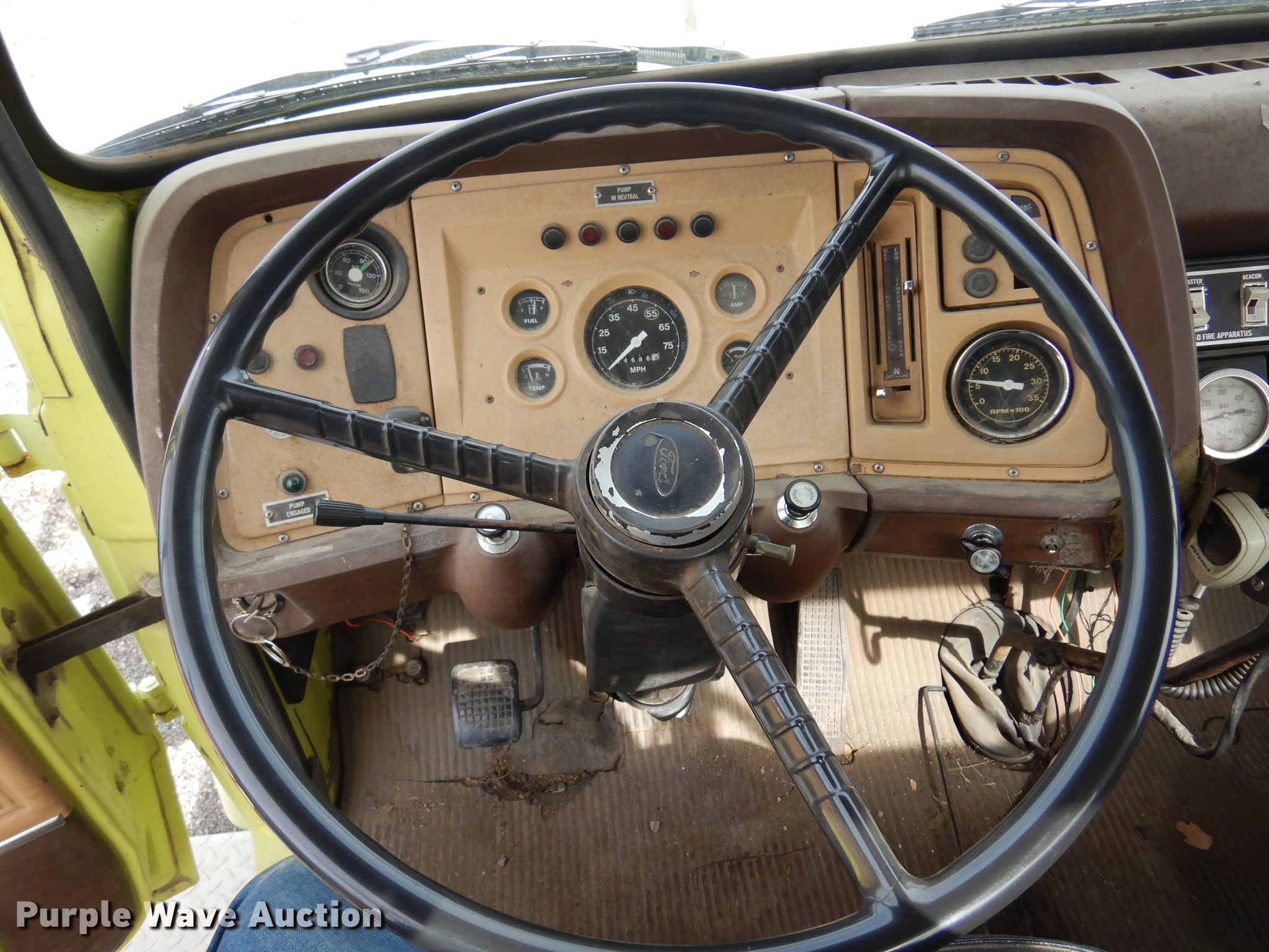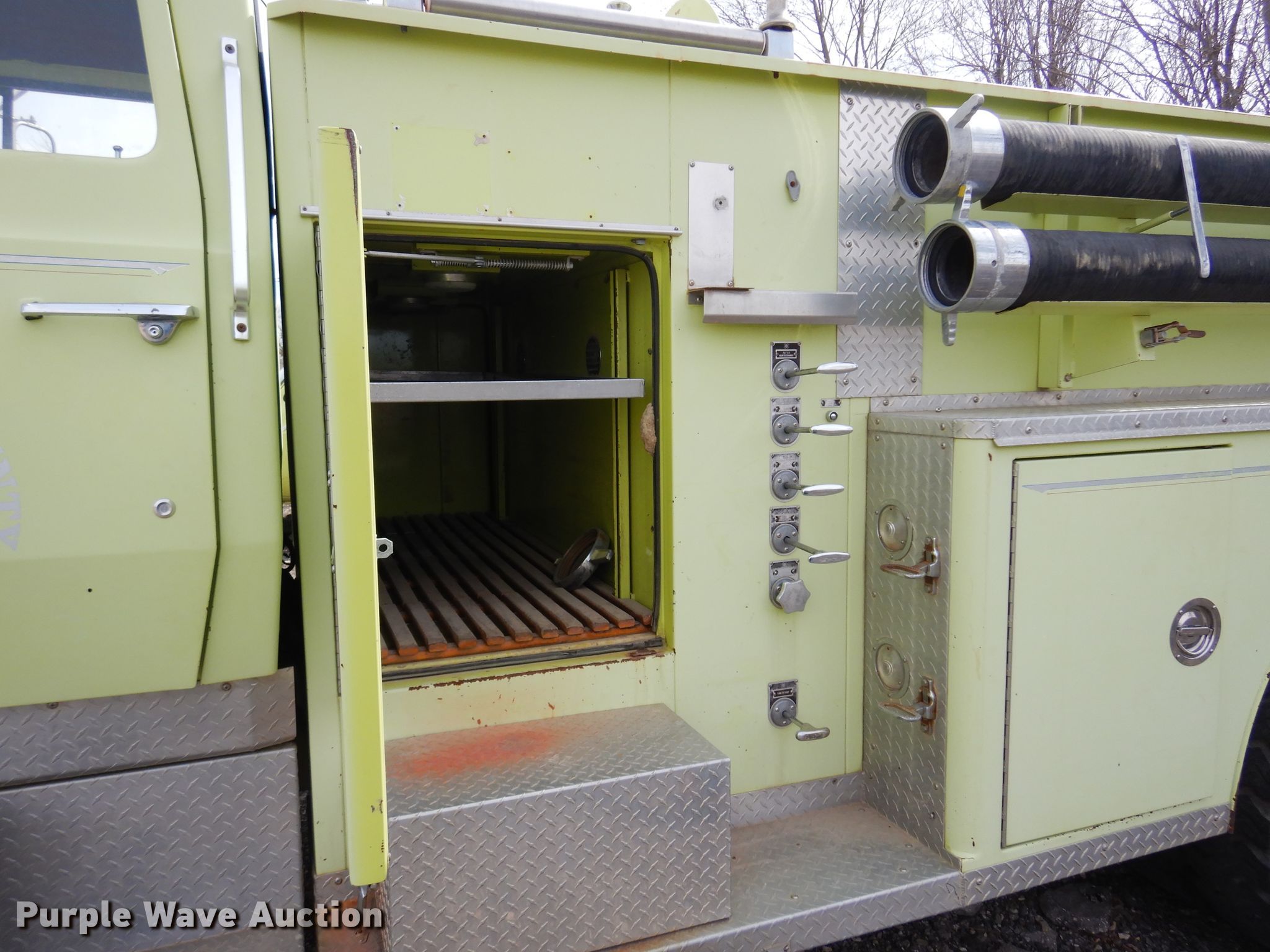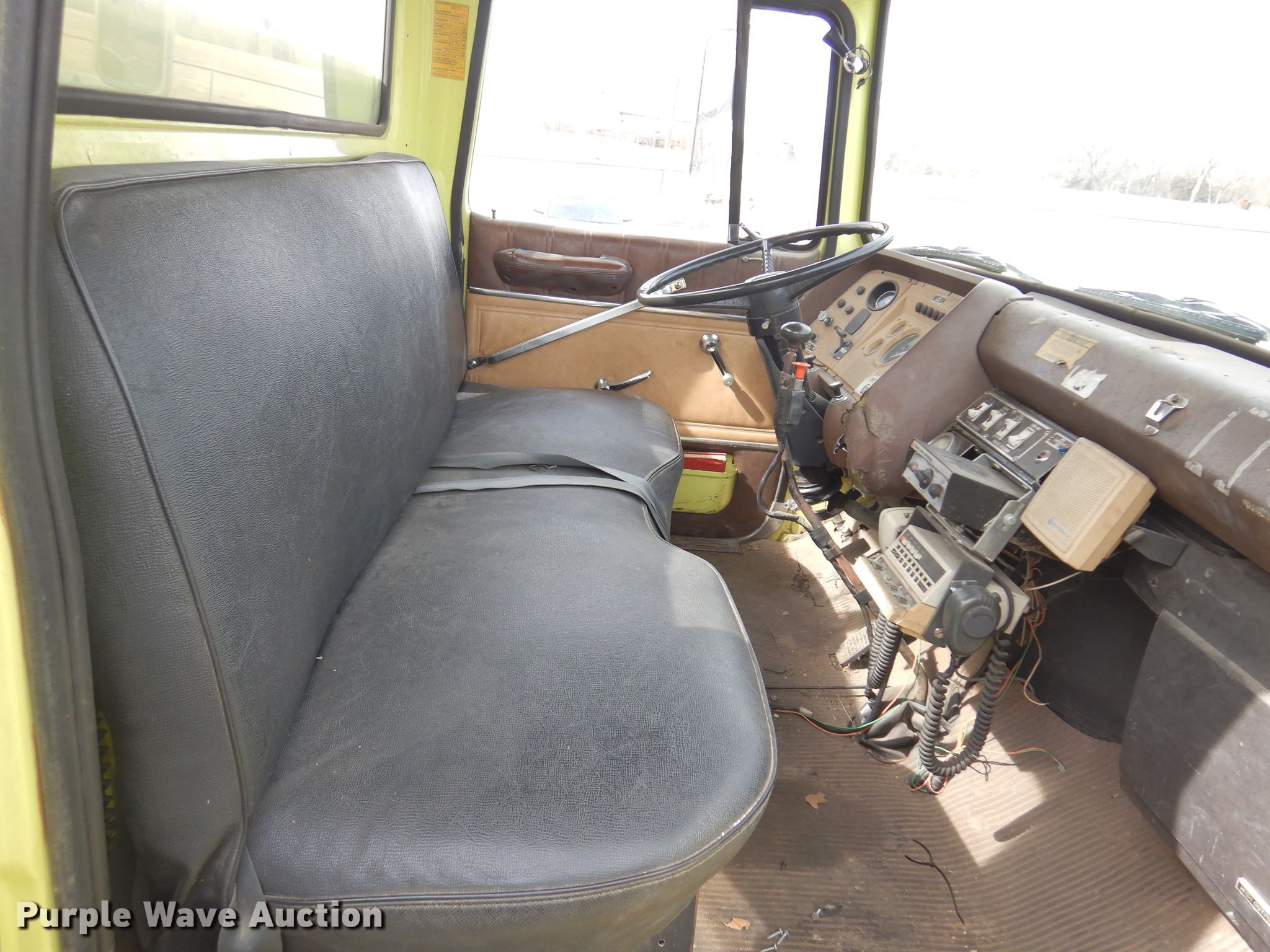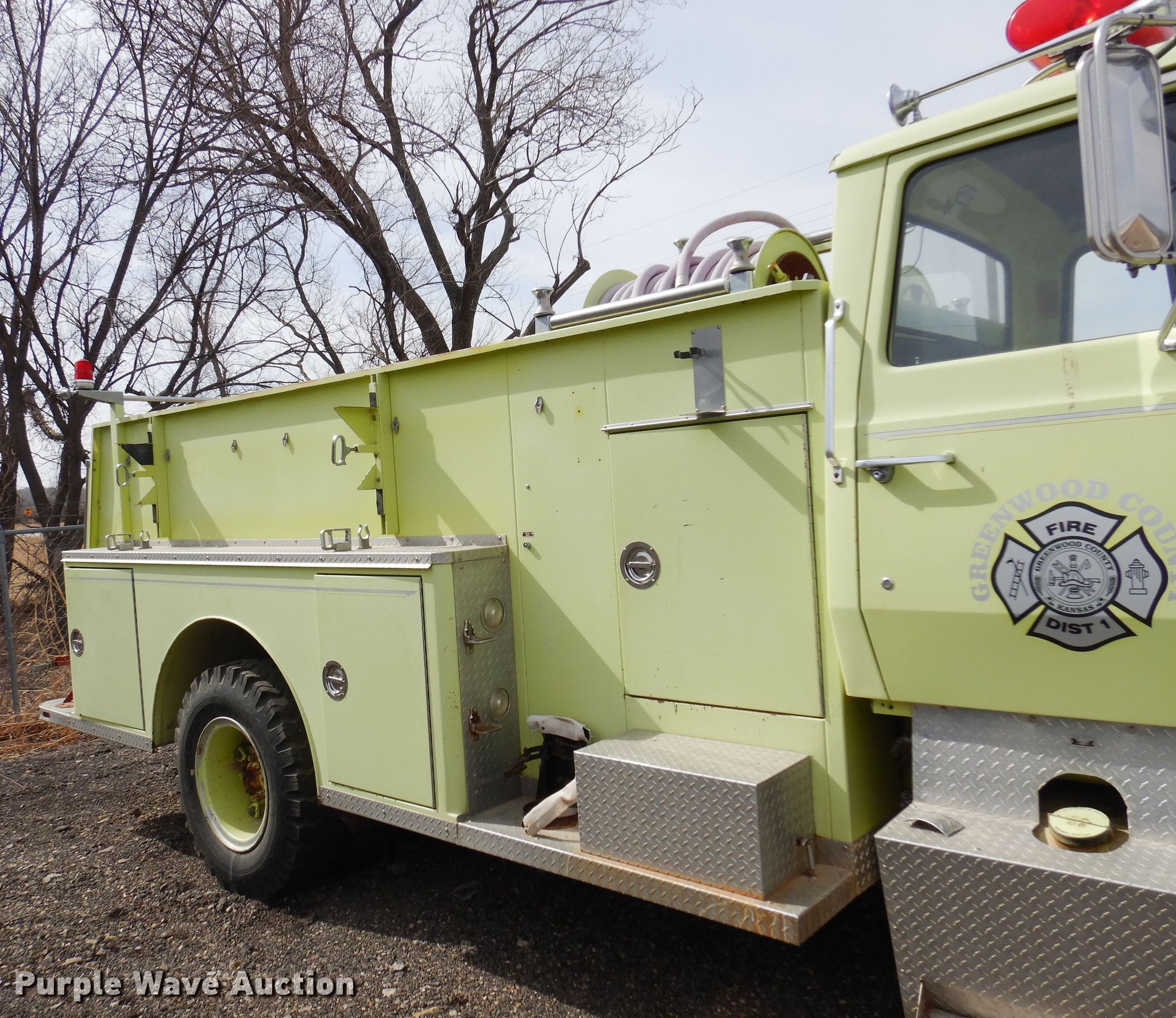 1982 Ford L8000 pumper fire truck. Miles: 44,686 on odometer, VIN: 1FDYK80U8CVA13466. Engine Caterpillar 3208, Cylinders: 8, Fuel type: Diesel. Transmission Manual, Speed: 5. Chassis Axles: Single, Suspension: Spring, Brakes: Hydraulic. Interior Heat. Operational Fire truck body Tank capacity: 600 gallons, PA/ siren controls, 2.5" hose, (2) 5" suction hoses, (2) 1.5" hoses. Tires Size: 11.00-20. Notes Water pump removed. Kansas title. Greenwood County Sheriff's Office. Eureka, KS 67045