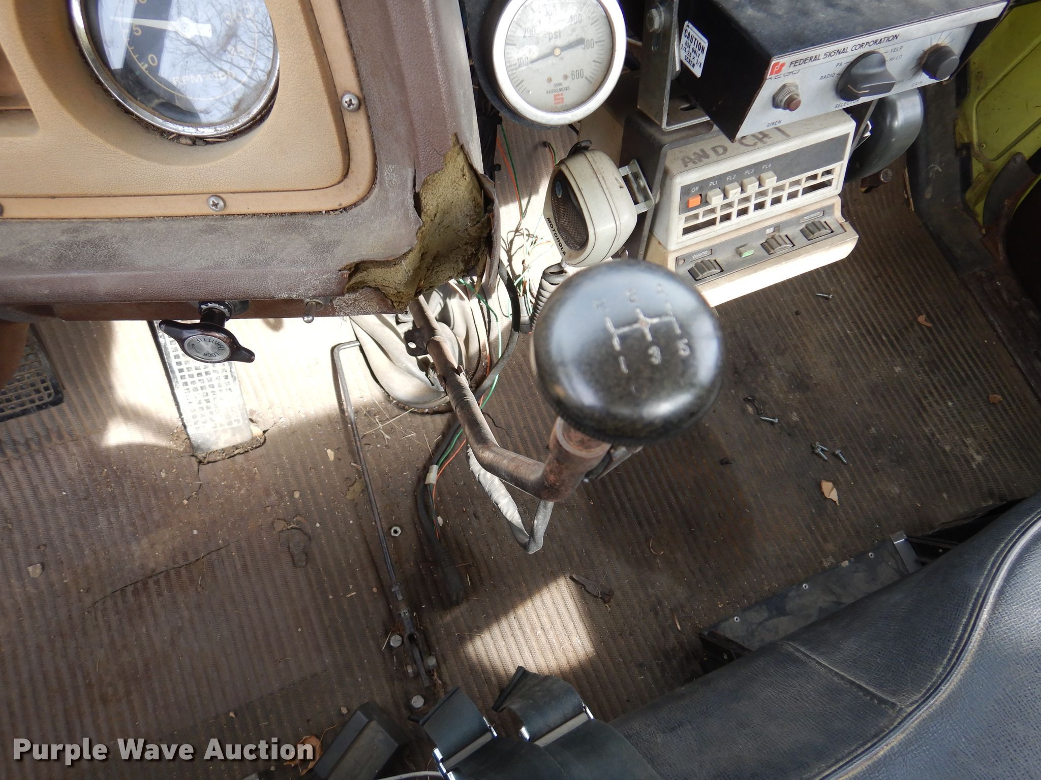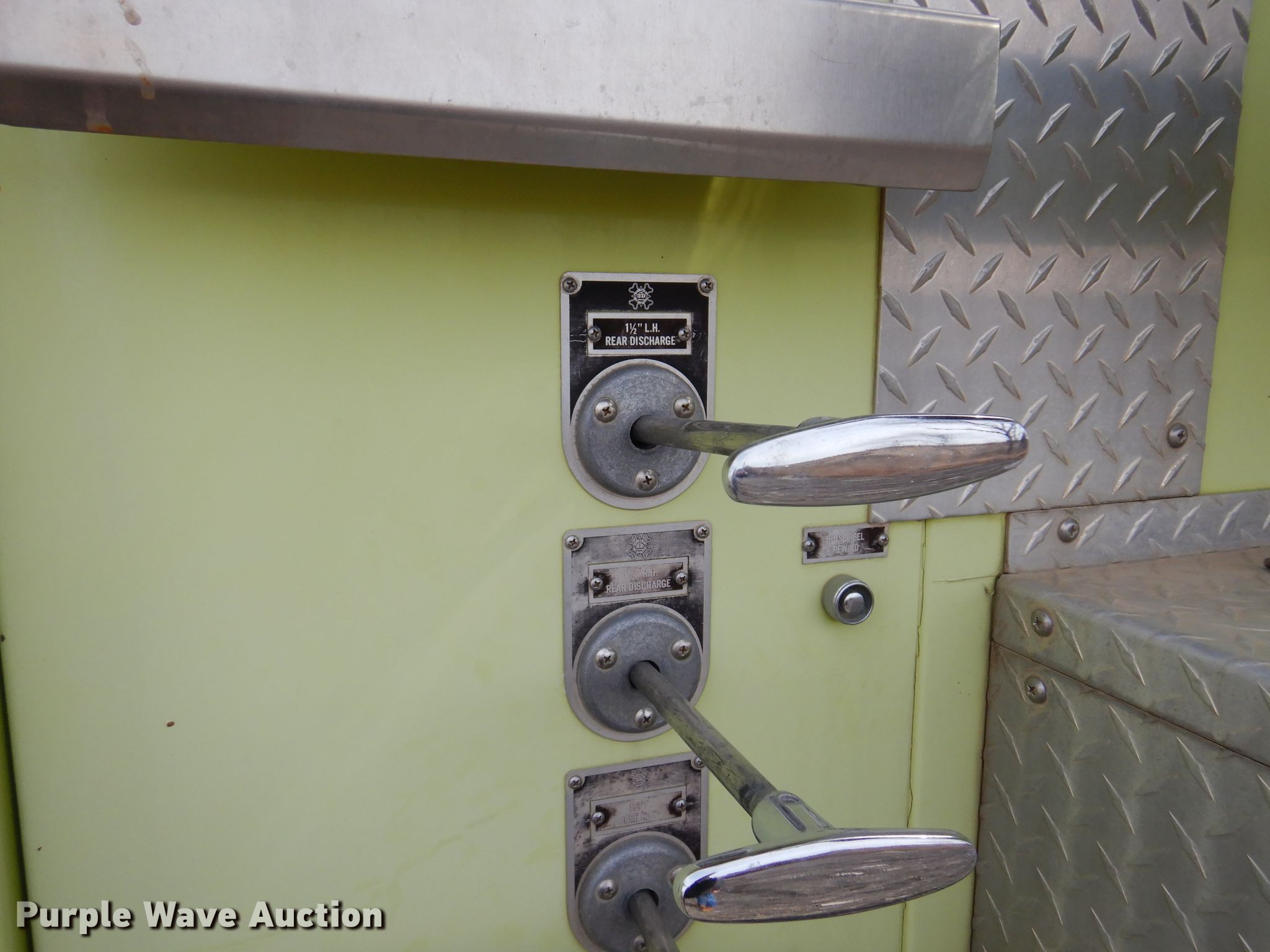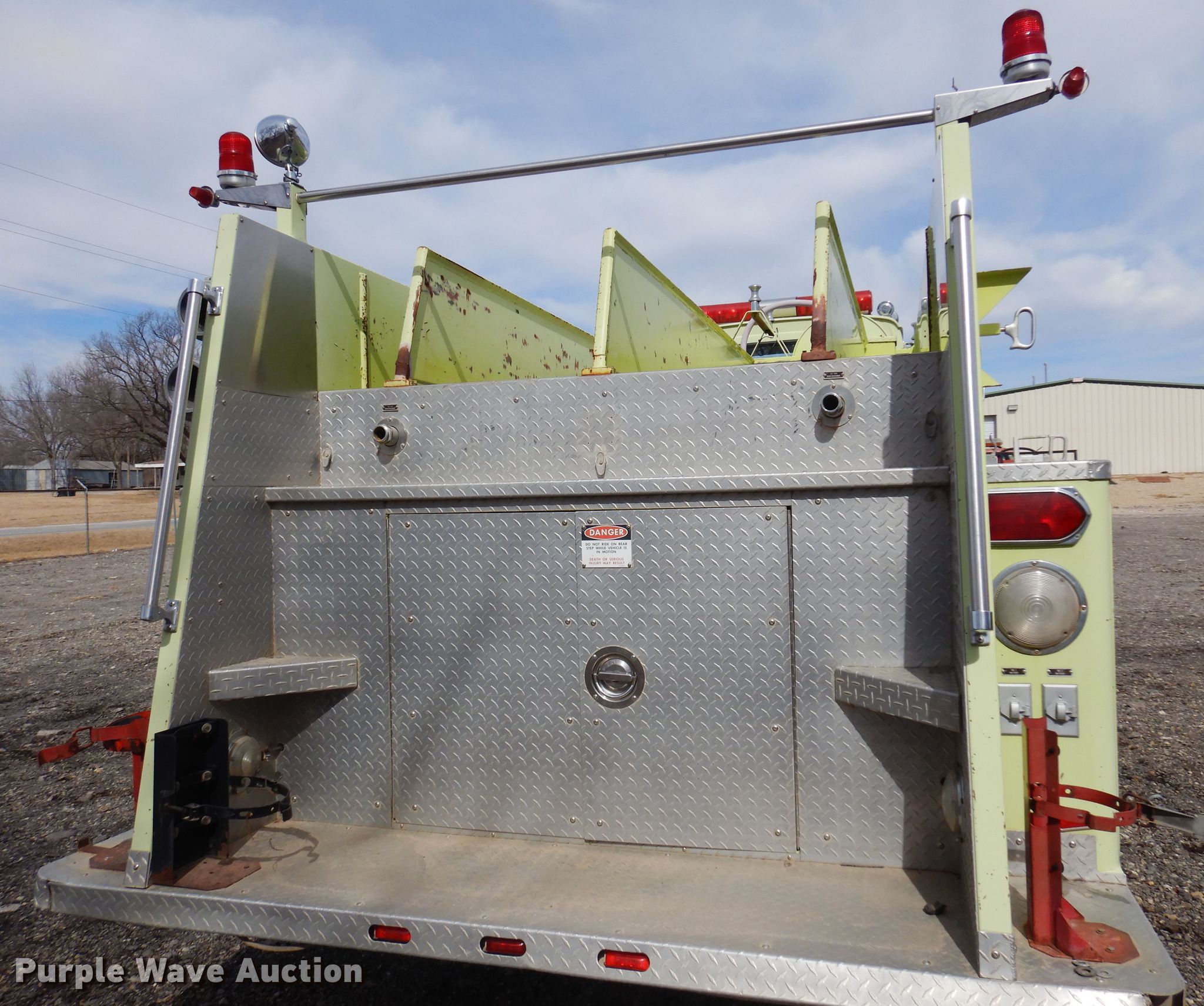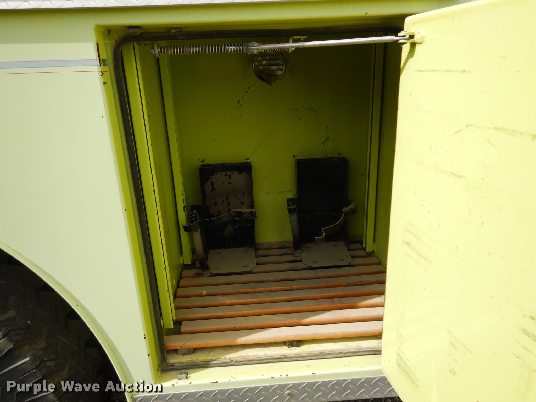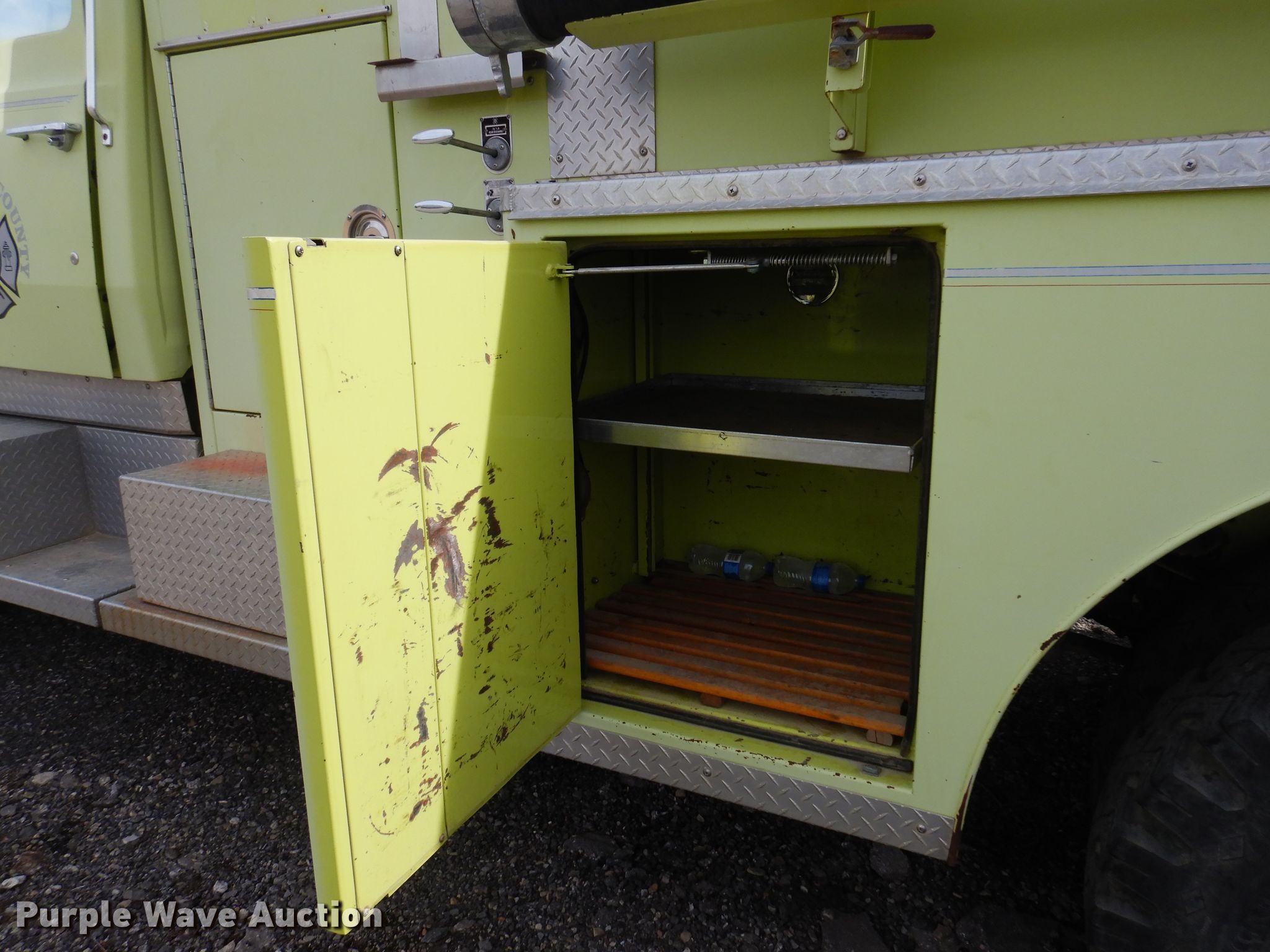 1982 Ford L8000 pumper fire truck. Miles: 44,686 on odometer, VIN: 1FDYK80U8CVA13466. Engine Caterpillar 3208, Cylinders: 8, Fuel type: Diesel. Transmission Manual, Speed: 5. Chassis Axles: Single, Suspension: Spring, Brakes: Hydraulic. Interior Heat. Operational Fire truck body Tank capacity: 600 gallons, PA/ siren controls, 2.5" hose, (2) 5" suction hoses, (2) 1.5" hoses. Tires Size: 11.00-20. Notes Water pump removed. Kansas title. Greenwood County Sheriff's Office. Eureka, KS 67045
