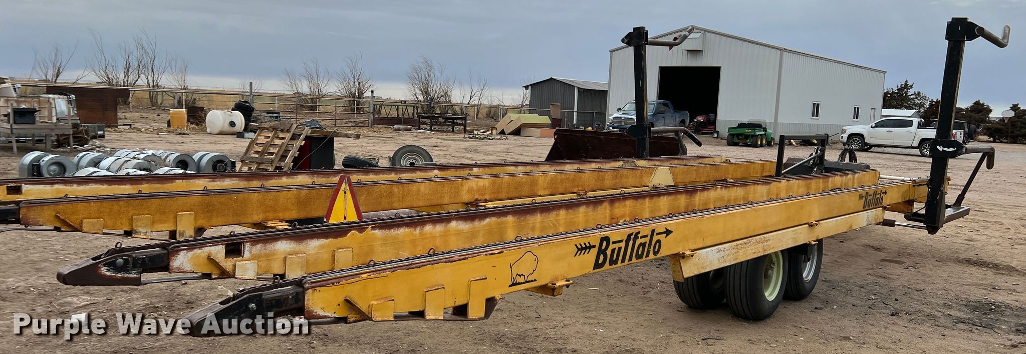Purple Wave is selling a used Hay Handling in Kansas. This item is a Buffalo hay bale mover with the following: 40' L x 125" W, Hydraulic tilt, Hydraulic loaders, Tires: 11L-15