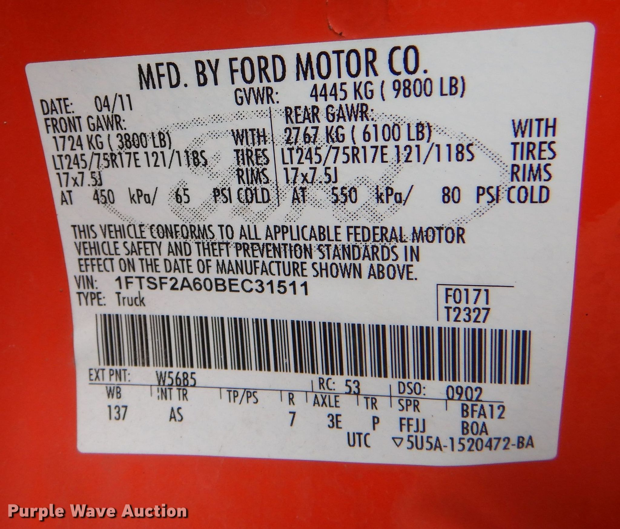 - VIN: 1FTSF2A60BEC31511