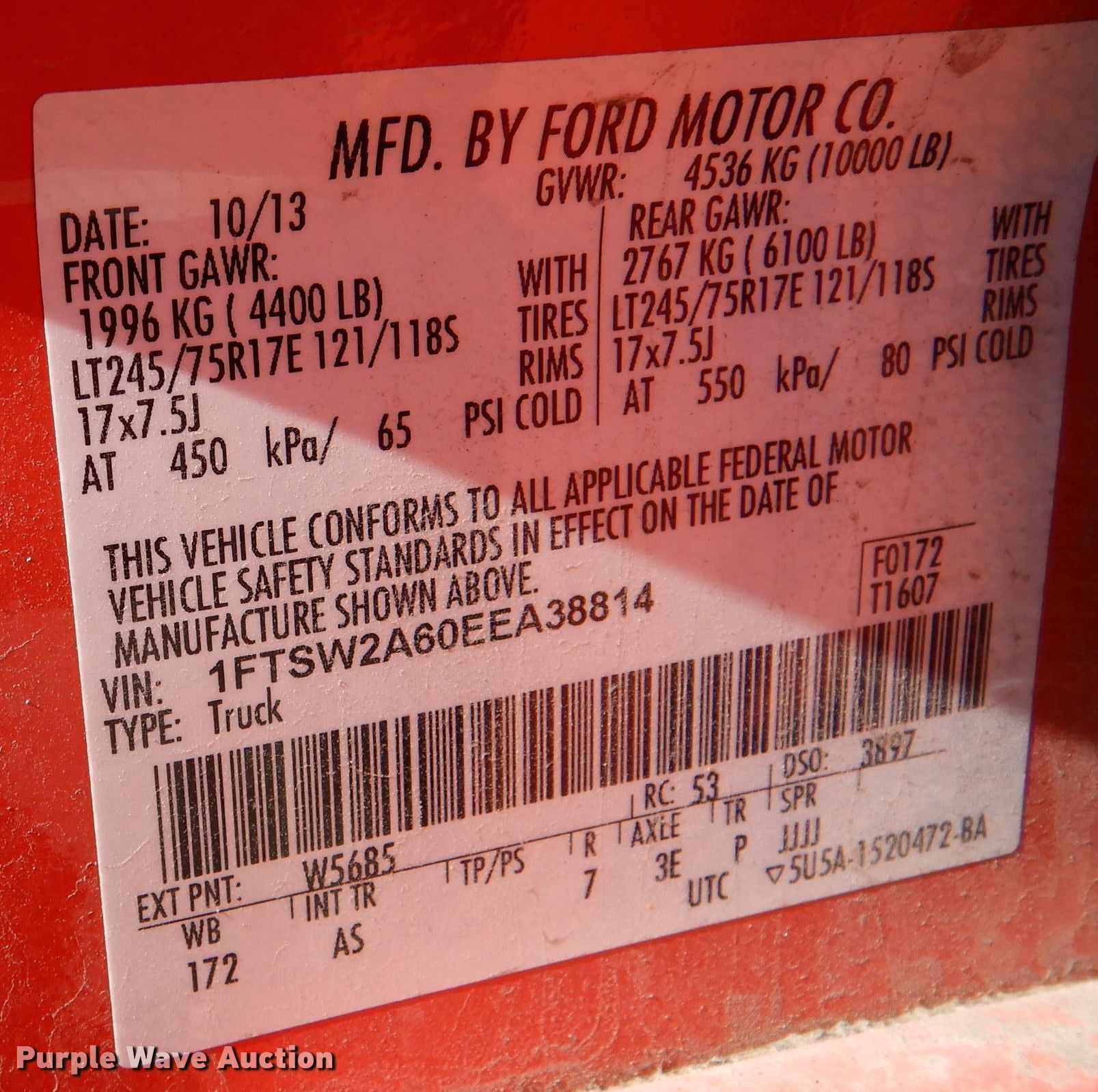 2014 Ford F250 Super Duty XL Crew Cab utility bed pickup truck. Miles: 247,309 on odometer, VIN: 1FTSW2A60EEA38814, KDOT ID: 163-2014. Engine Displacement: 6.2L V8 OHV 16V, Cylinders: 8, Fuel type: Gas. Transmission Automatic. Interior AC, Heat, Cruise control. Operational Utility bed Knapheide 796LPJ, 8' L x 78" W, Weatherguard fuel tank GPI MD130 fuel meter, GPI pump, Traffic-Manager arrow board. Tires Size: 245/75R17. Notes Unknown operating condition of arrow board, Windshield chipped or cracked, Dead battery, Non-operational transmission. Kansas title. Titles will be distributed after confirmation of payment and removal. Kansas Department of Transportation - Salina. 1006 North 3rd. Salina, KS 67401